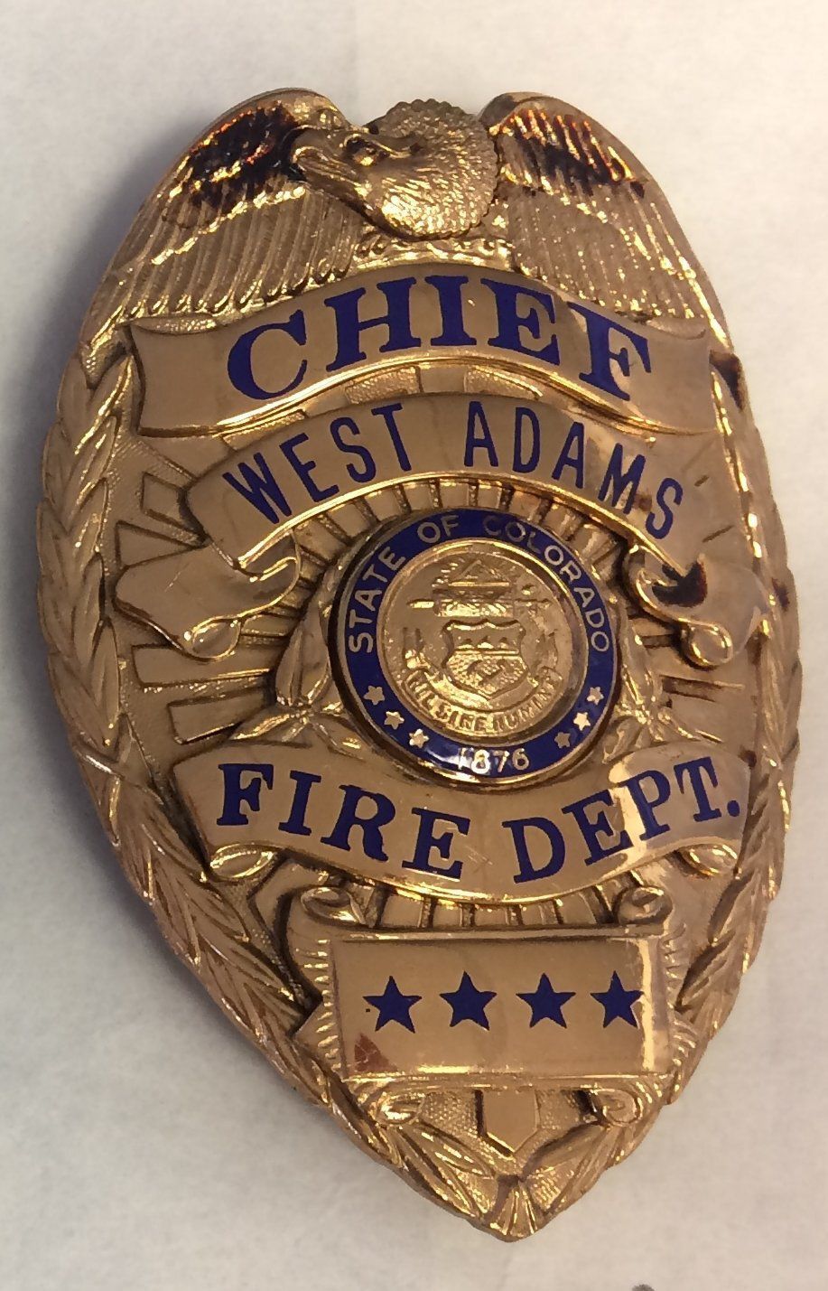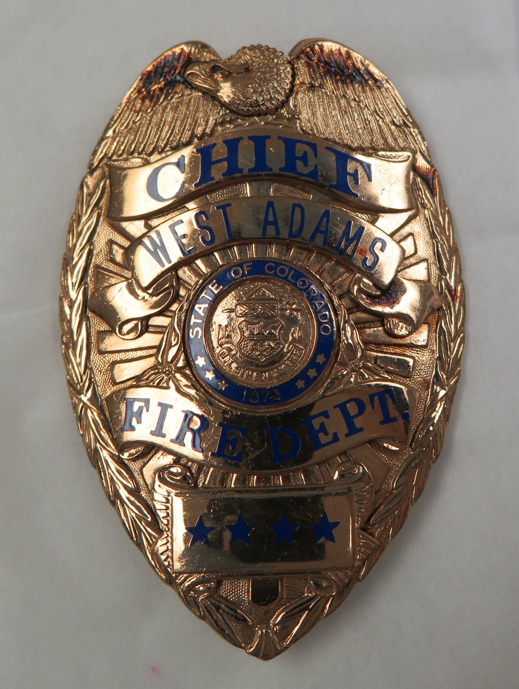 This metal badge measures 3.25"(H) x 2.25"(W). It has the following text: "Chief West Adams Fire Department". The badge is gold in color with blue lettering. this badge was worn by Milton Mulligan when he was the chief of the West Adams County Fire Department.