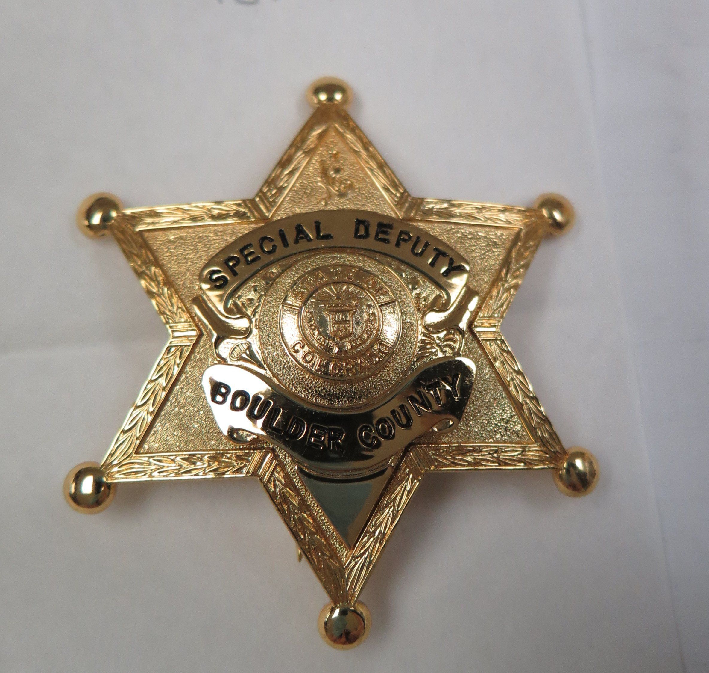 This star shaped metal badge measures 2.5"(H) x 2.5"(W). It is gold in color with black lettering that state: "Special Deputy Boulder County".