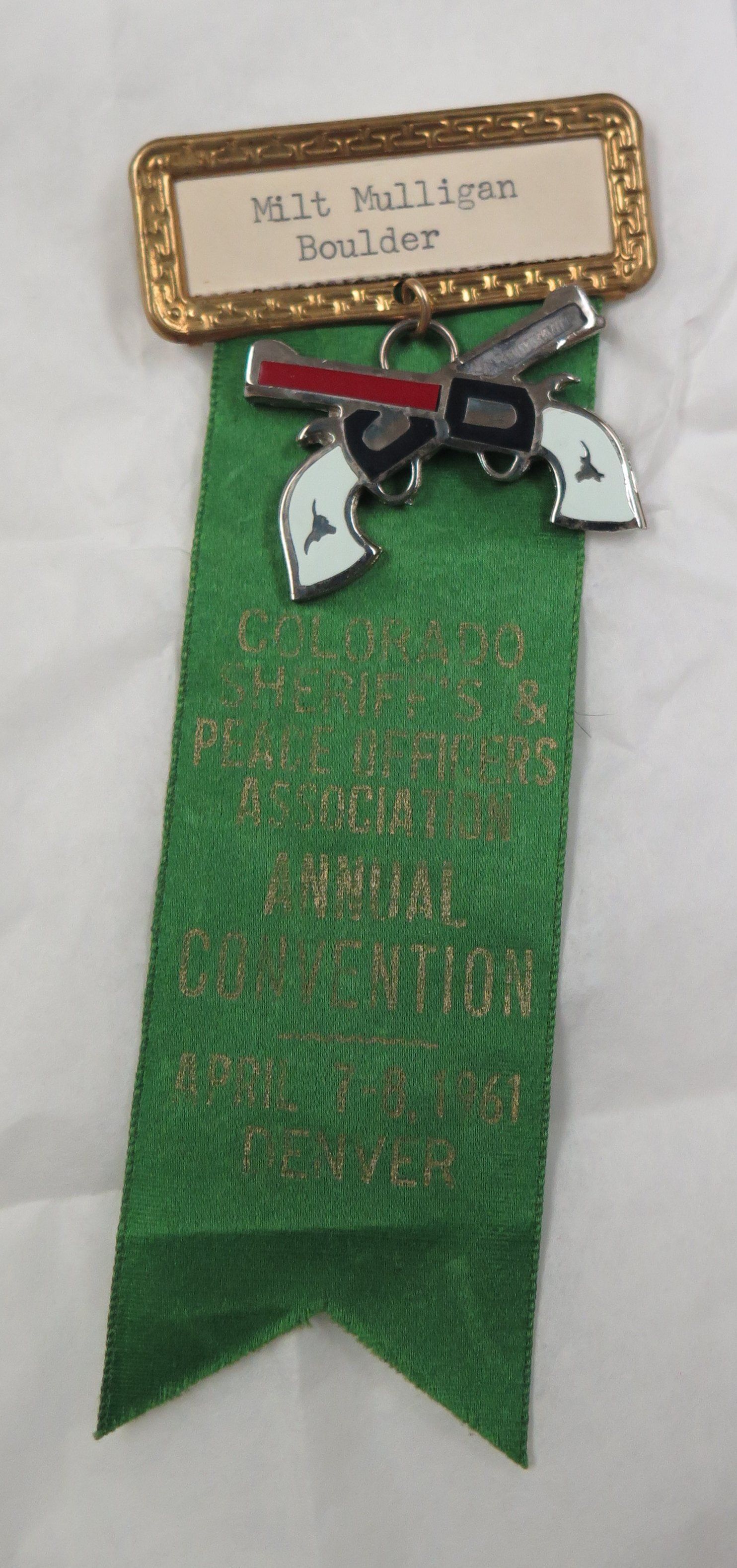 The ribbon measures 5"(H) x 2"(W). It is composed of a name plate "Milt Mulligan Boulder", a metal crossed pistols pin, and a green fabric ribbon with the following text: " COLORADO SHERIFF'S & PEACE OFFICERS ASSOCIATION ANNUAL CONVENTION APRIL 7-8, 1961.Collection
