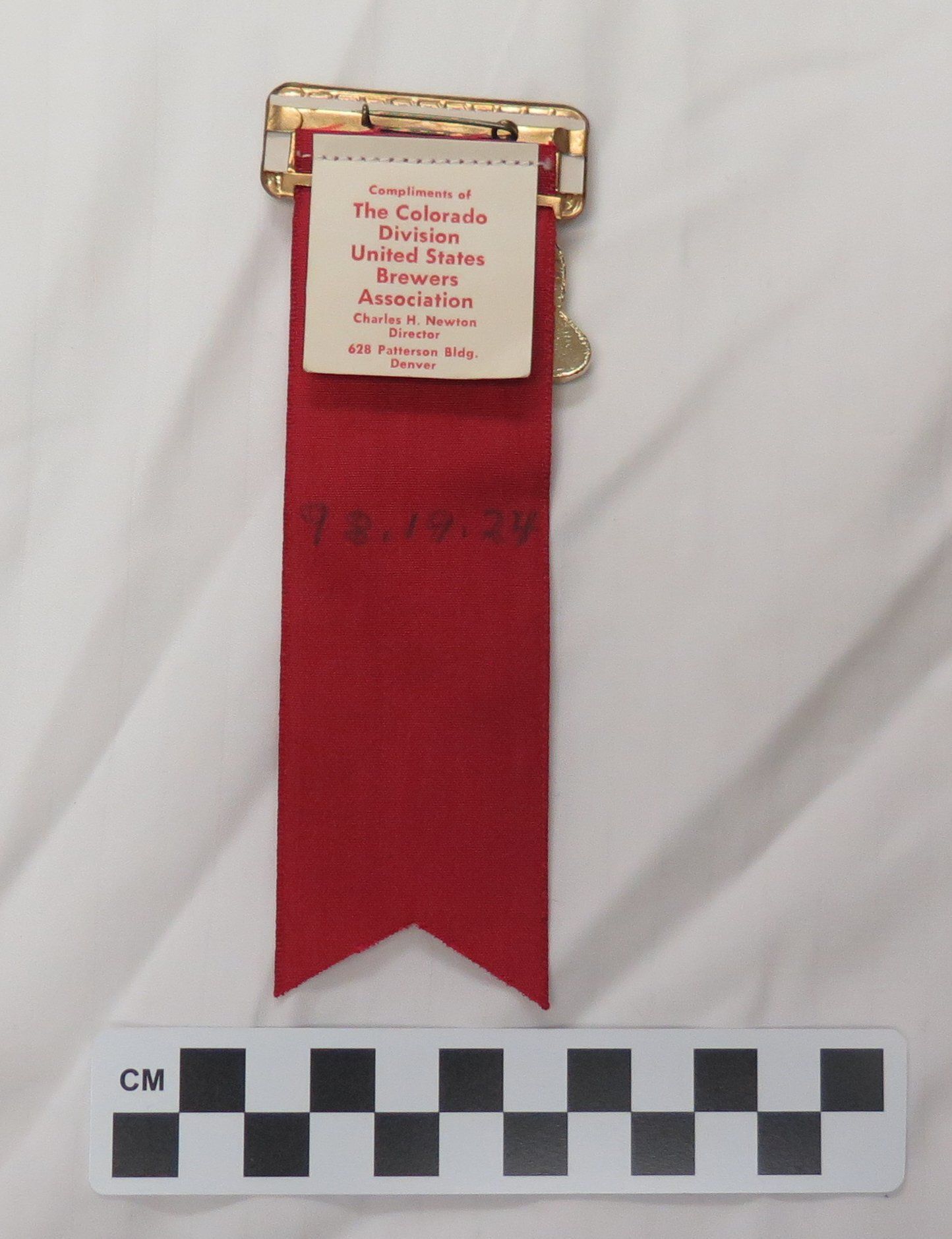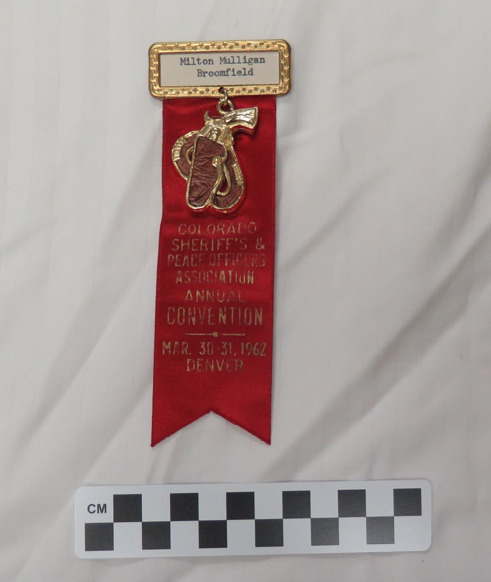 This red cloth ribbon measures 5.5"(H) x 2.5"(W). The metal name tag pin at the top of the ribbon reads "Milton Mulligan Broomfield". Dangling from the name tag is a metal charm in the shape of a holstered pistol. The ribbon has text in gold that reads "Colorado Sheriffs and Peace Officers Association Annual Convention Mar.30-31, 1962 Denver".Collection
