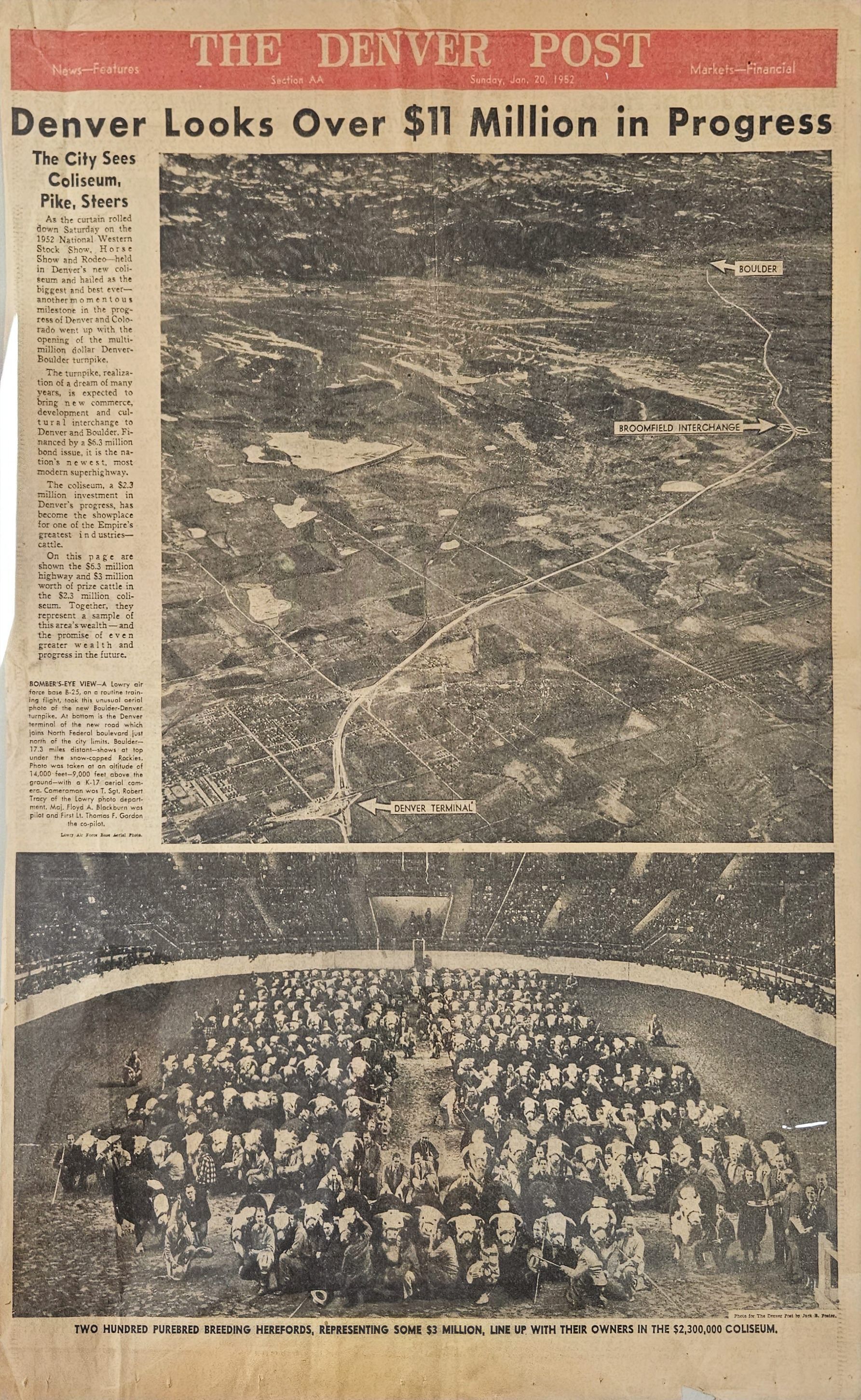 Item is the front page of The Denver Post newspaper from Sunday, January 20, 1952. The main article on the front page focuses on the construction of the Boulder-Denver turnpike. The photo that accompanies this article is an aerial picture of the turnpike, with Boulder, the Denver Terminal, and the Broomfield Interchange labeled. Other smaller articles and advertisements unrelated to Broomfield are featured on the back of this page.Lexicon