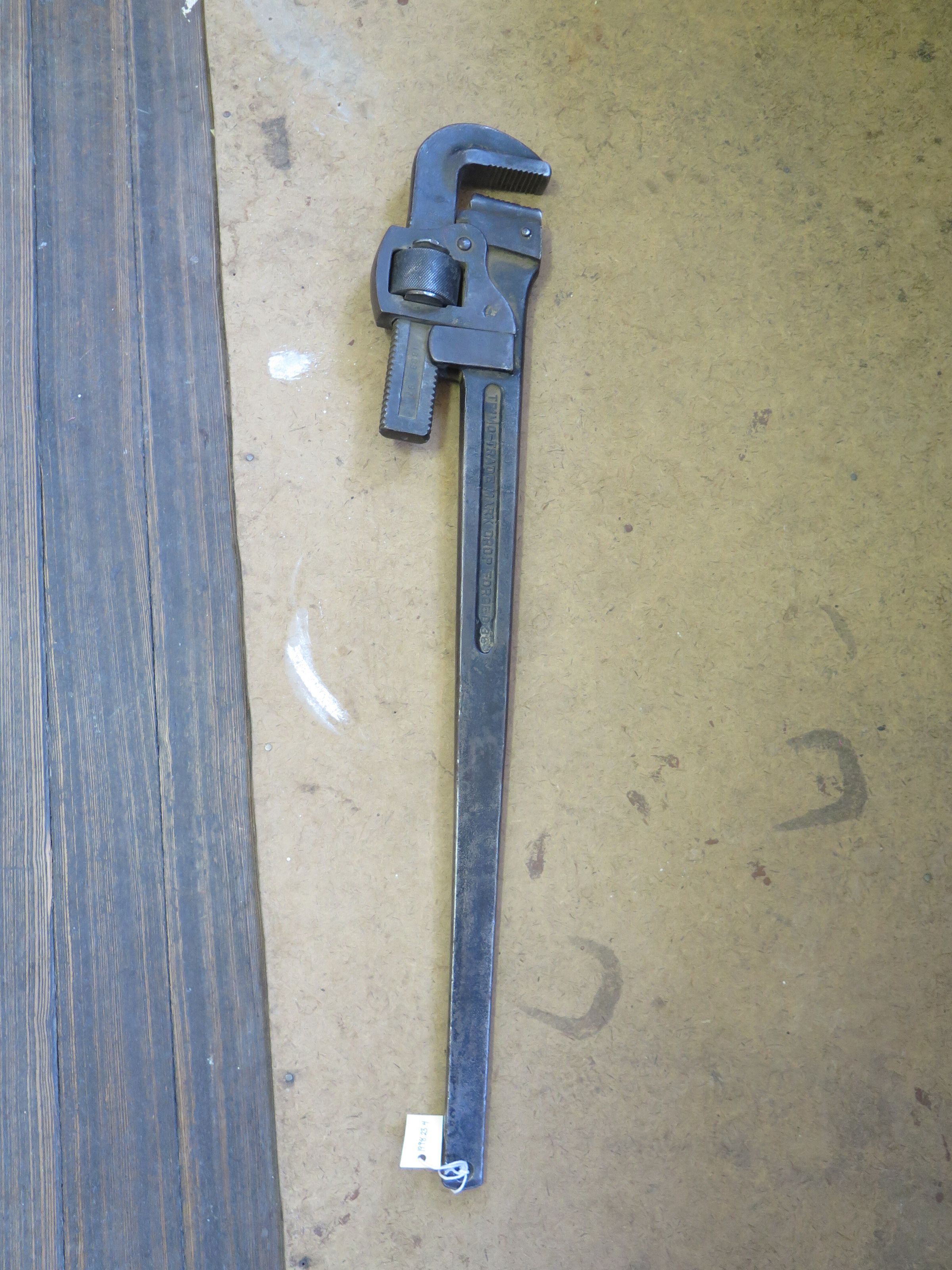 This is a Trimo brand metal wrench for steam engines. The text on the wrench handle reads, "TRIMO-TRADE MARK DROP FORGED 36". The wrench measures 32" (h) x 5" (w) x 1.5" (d).