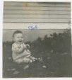 Black and white photograph of a baby sitting in a yard. The baby is laughing. The background of the photograph is the siding of a house. The baby is identified as Clyde due to the handwritten name Clyde written on the middle of the photograph.