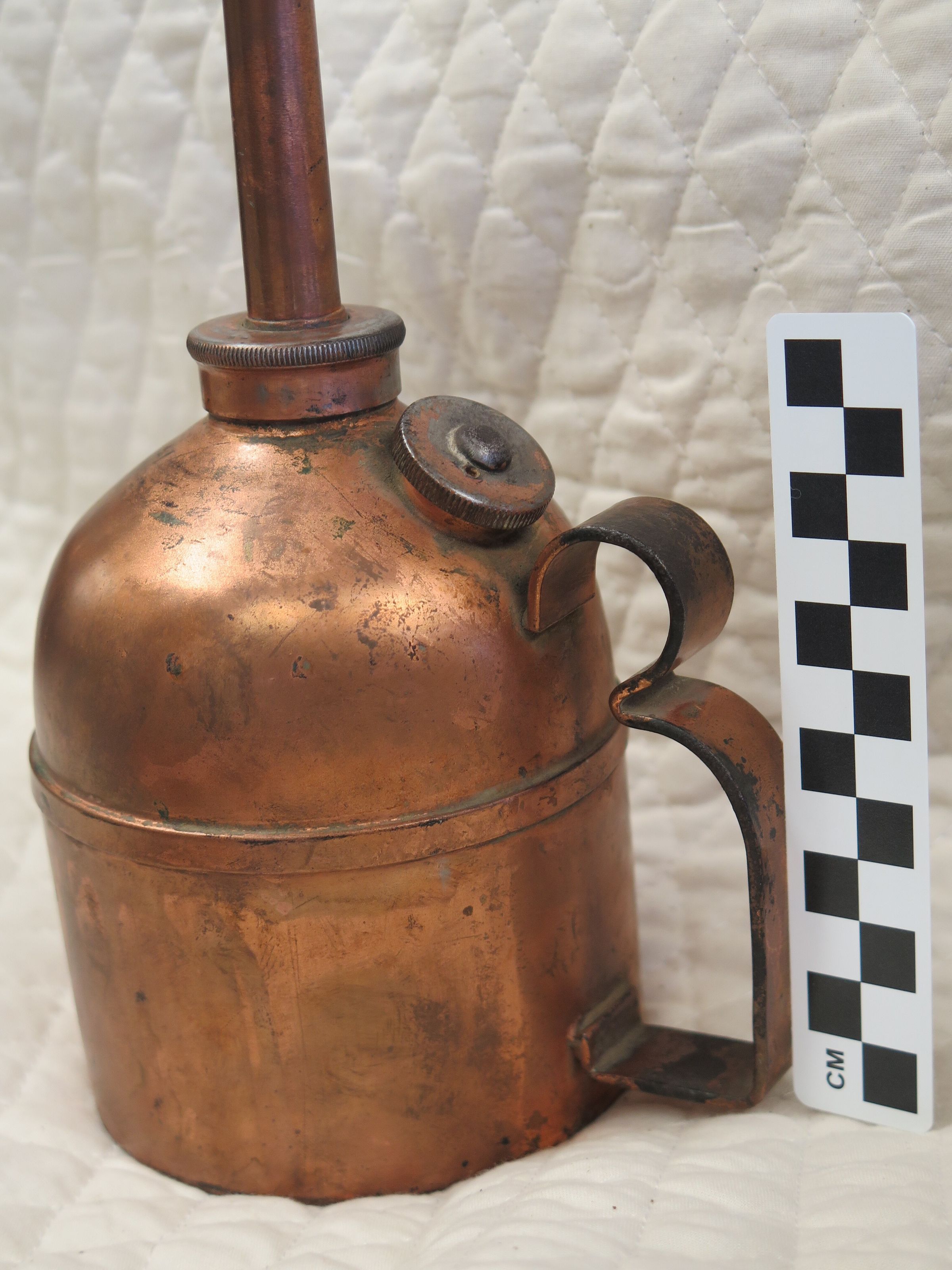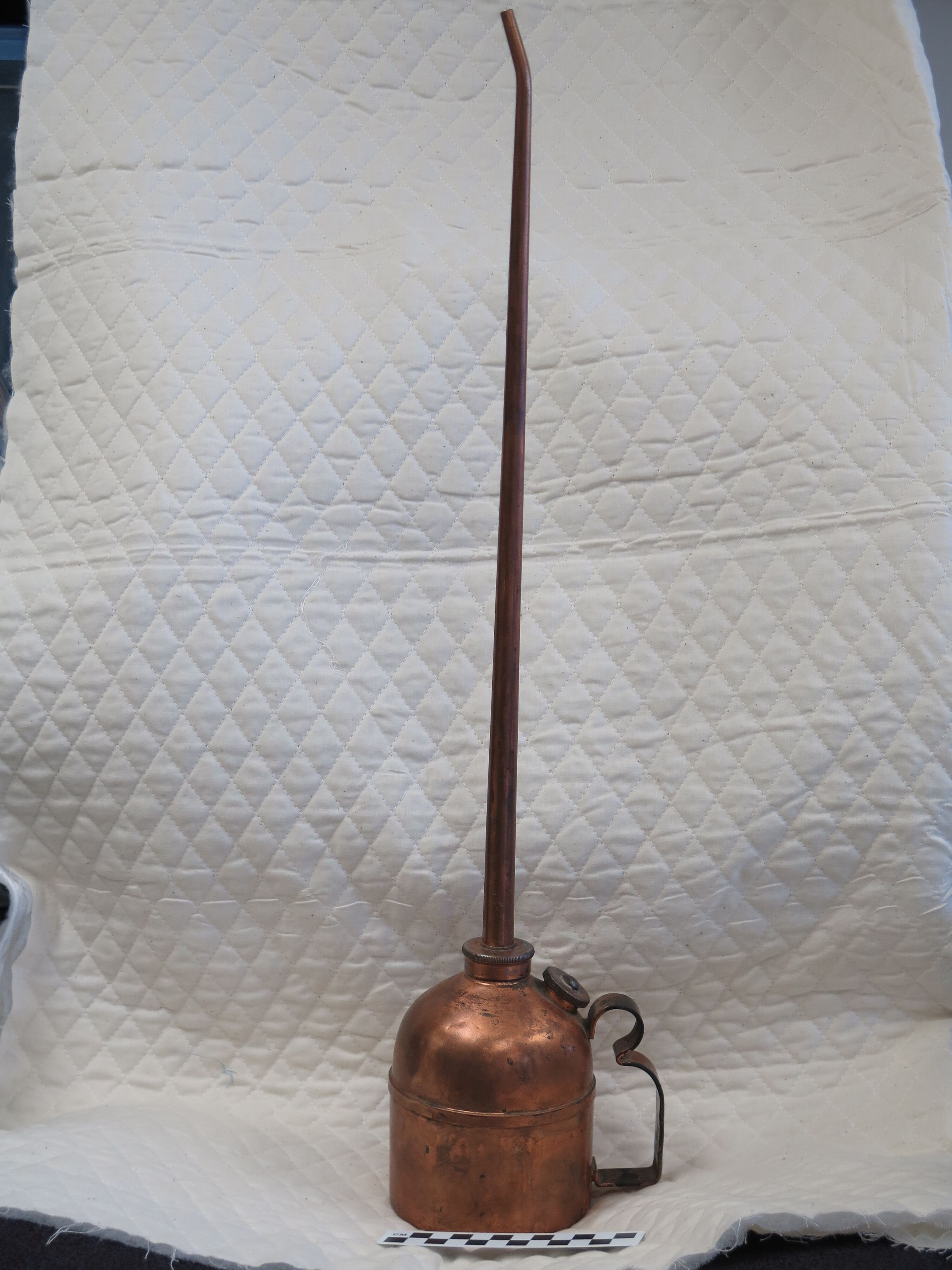 This is a copper oil can. The can has a copper handle on the side and opening with a screw on cover for filling with oil. There is an 18" spout to pour on top of can. The can measures 23.5" (h) x 5.5" (w).