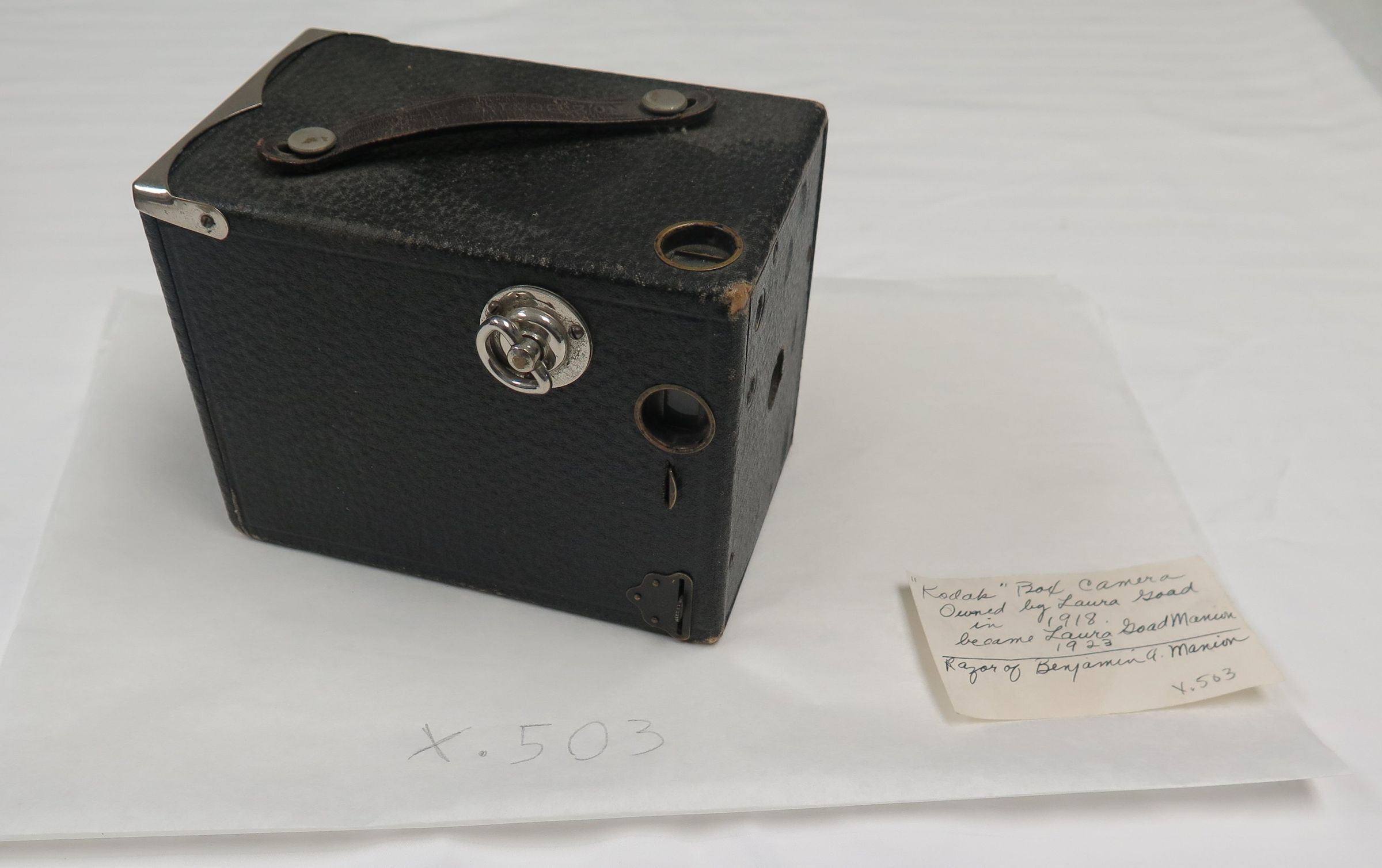 exposures probably on type 116 film rolls. There is a note associated with the camera that reads, "'Kodak' Box Camera owned by Laura Goad in 1918. She became Laura Goad Manion in 1923./ Razor of Benjamin A. Manion" on the front and, "Mother and father of Charles E. Manion/ 1161 Berch St." on the back. The camera measures 4.25" (h) x 5.5" (w) x 3.25" (d).Collection