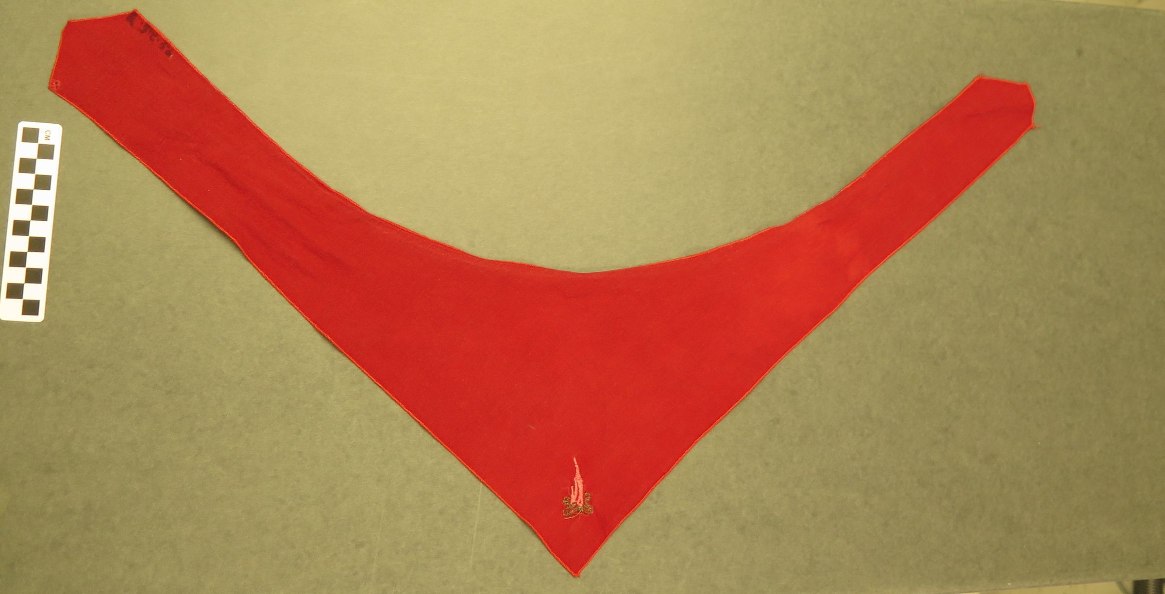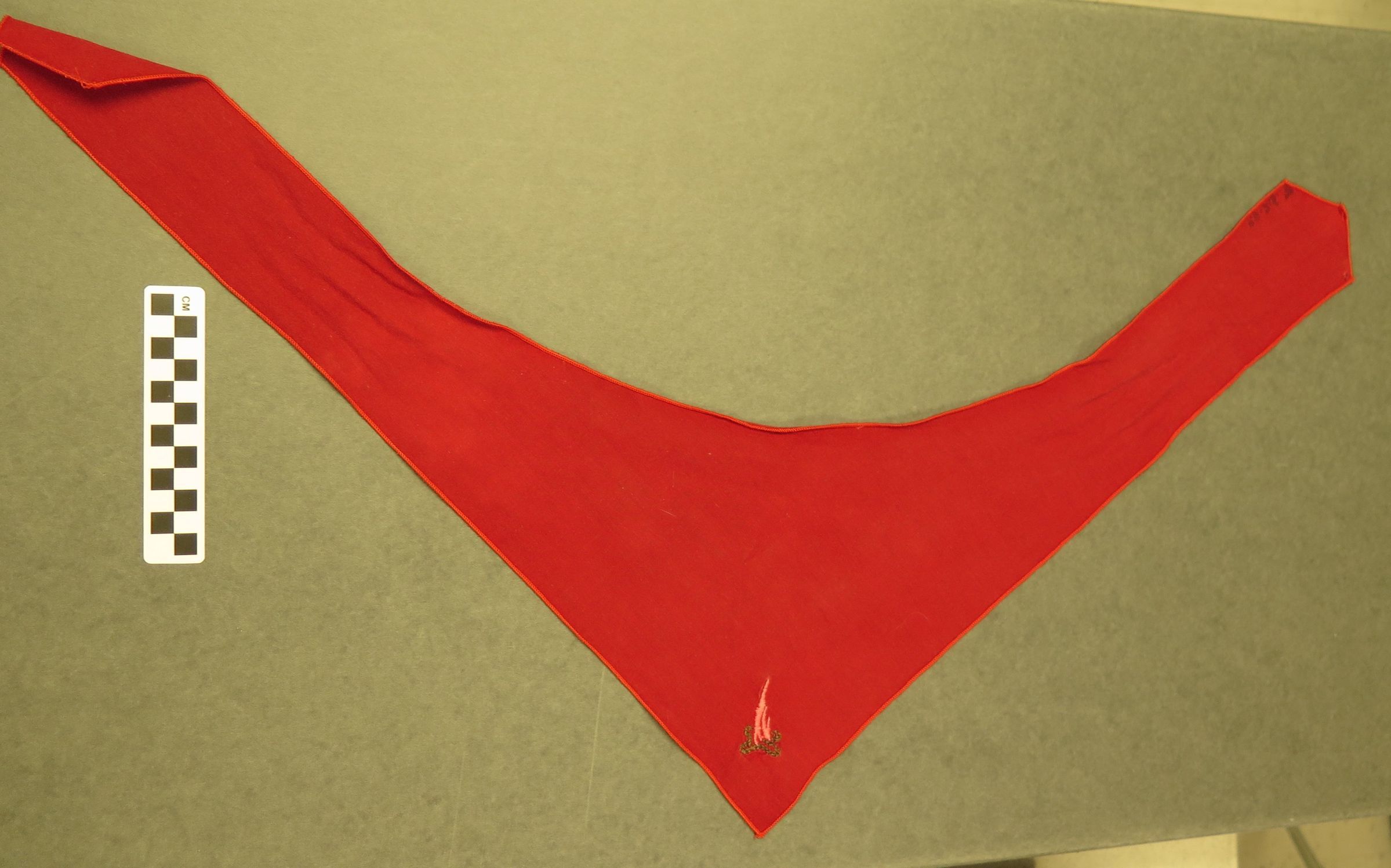 This is a red Campfire Girls neck scarf. There is a campfire at the bottom of the pointed part of the scarf with green logs and a pink flame. The scarf measures 29" (w) x 8" (l).