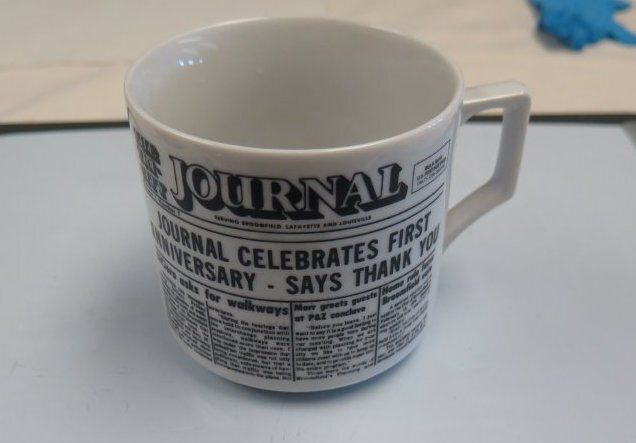 The white ceramic "Tri-City Journal" mug has a newspaper article and headline printed on it. It measures 3" (h) x 4.5" (w) x 3.5" (l).