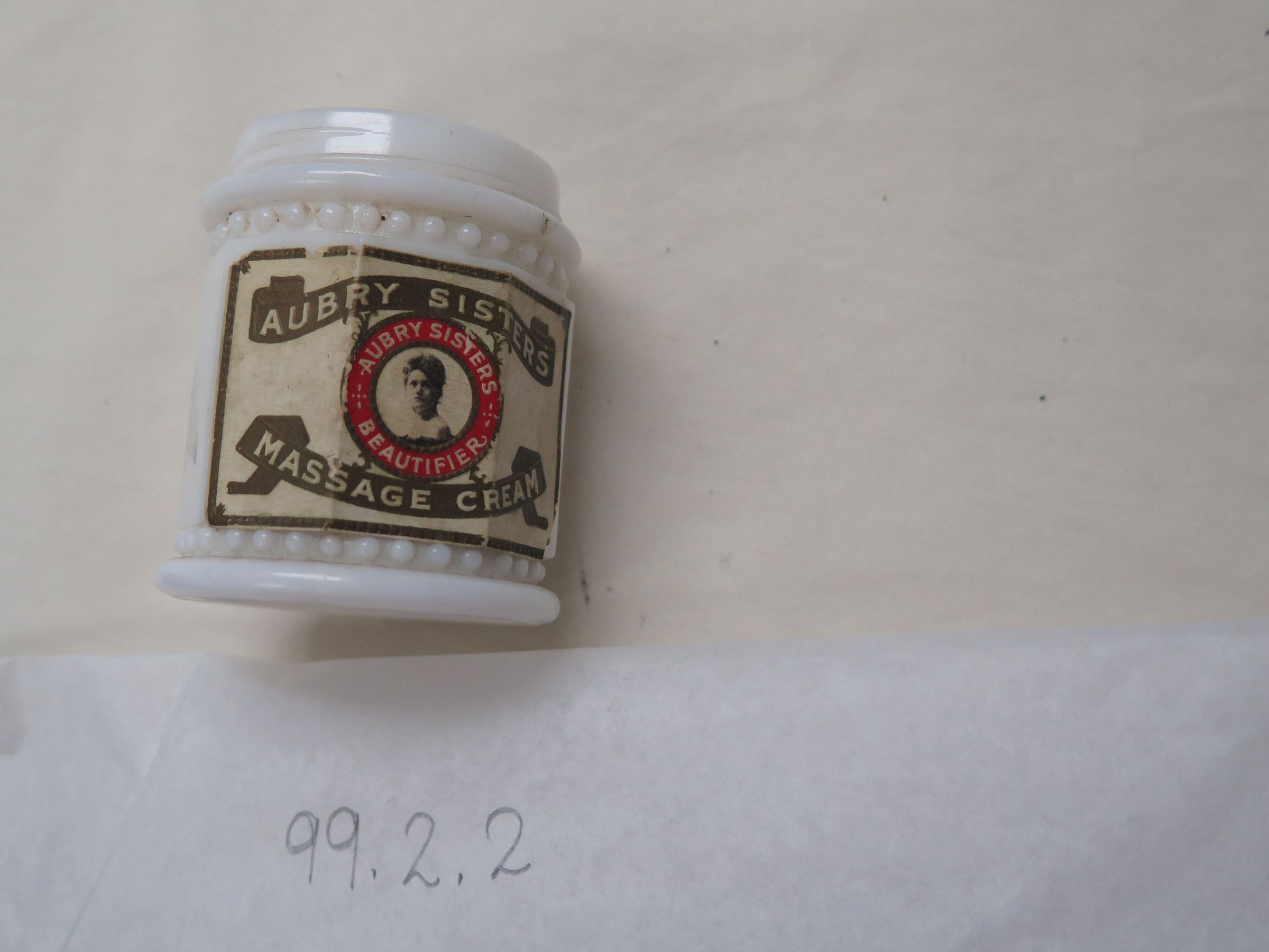 This is a milk white glass jar of Aubry Sister's Massage Cream without a lid. The sticker on the front is brown, white, and red. The text on the sticker reads, "Aubry Sisters/ Aubry Sisters/ Beautifier/ Massage Cream". In the center of the label is a picture of a woman's face and shoulders. The jar measures 2.5" (h) x 2.25" (dia).