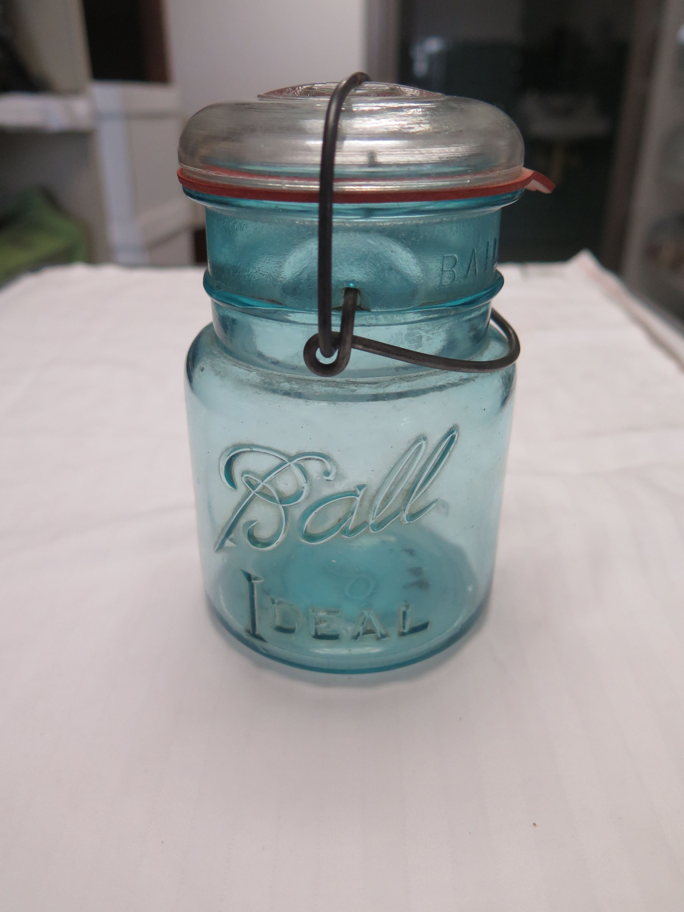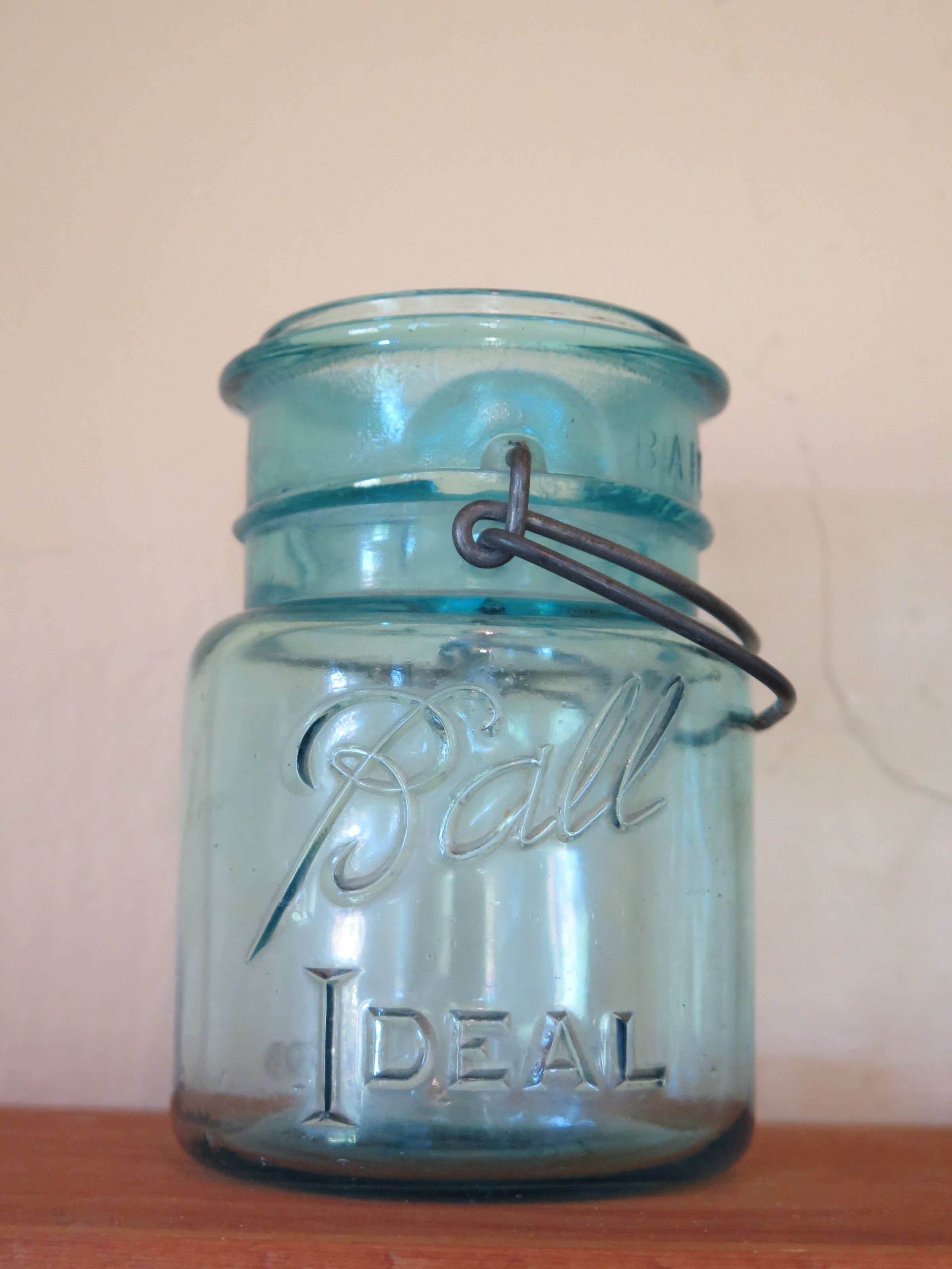 Jar. "Ball" "Ideal" embossed; glass; metal clamps attached to neck of jar; this is a "lightning seal" jar; no lid; based on lettering on the jar it can be dated between 1923 and 1933. Note: This jar has two numbers written on the bottom in black marker- 1999.2.4 and 1999.6.4.