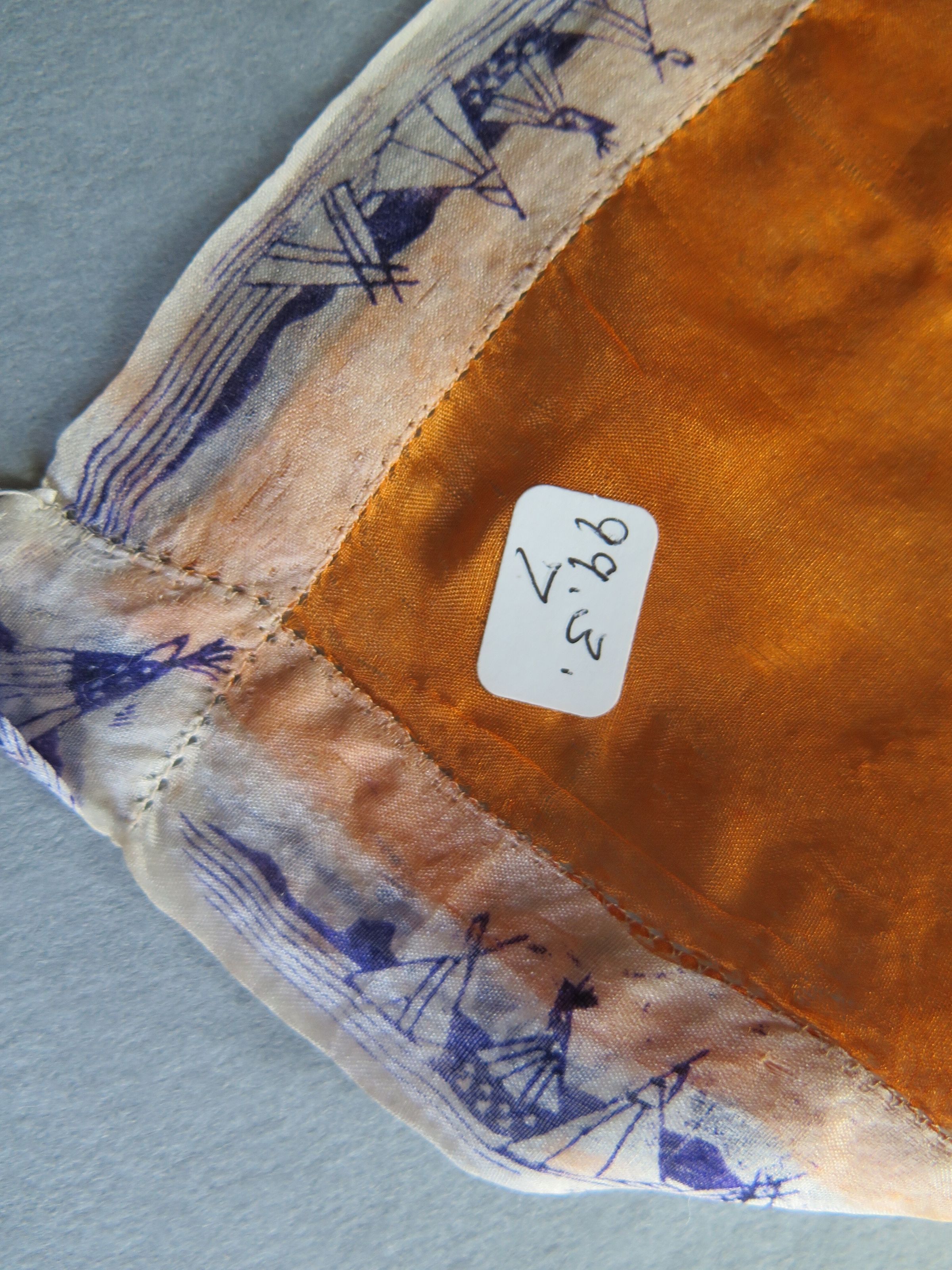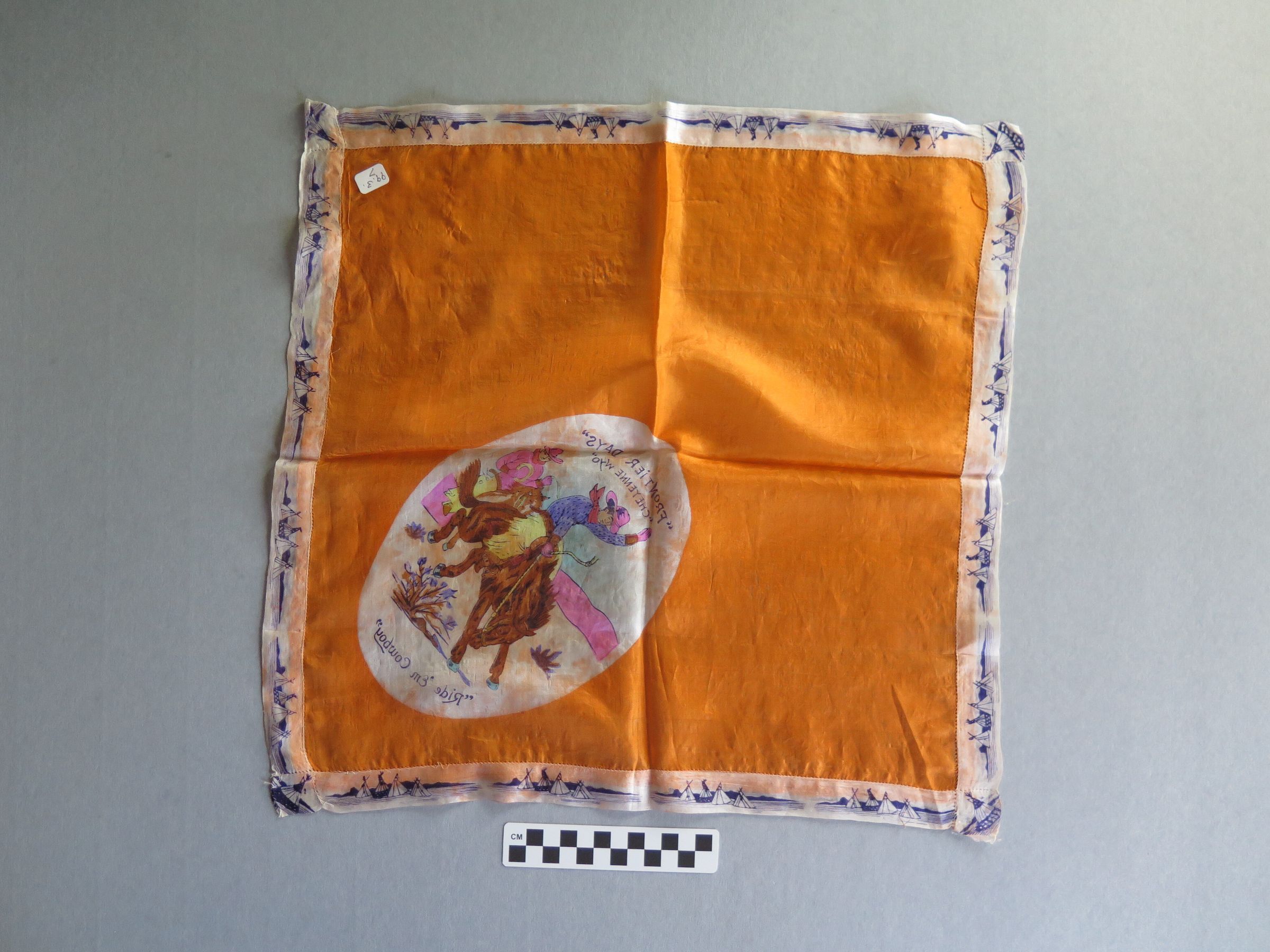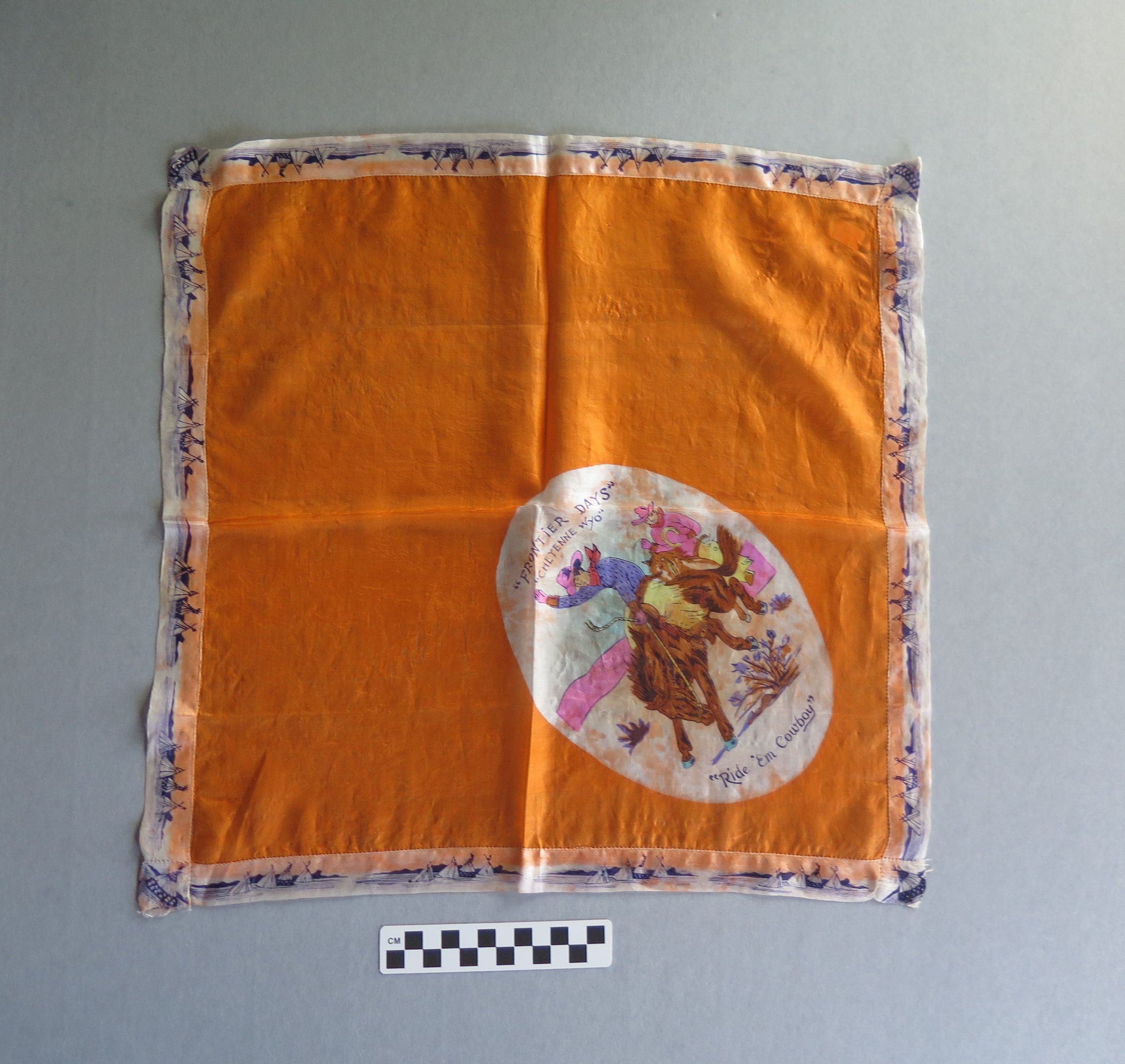 Orange silk scarf with a white circle with an image of two cowboys, one on a bucking horse. The text above the cowboys reads ""Frontier Days Cheyenne WYO"" and below the cowboys ""Ride 'Em Cowboy."" The trim of the scarf is white and has teepee motifs. The scarf measures 8" (w) x 10" (l).