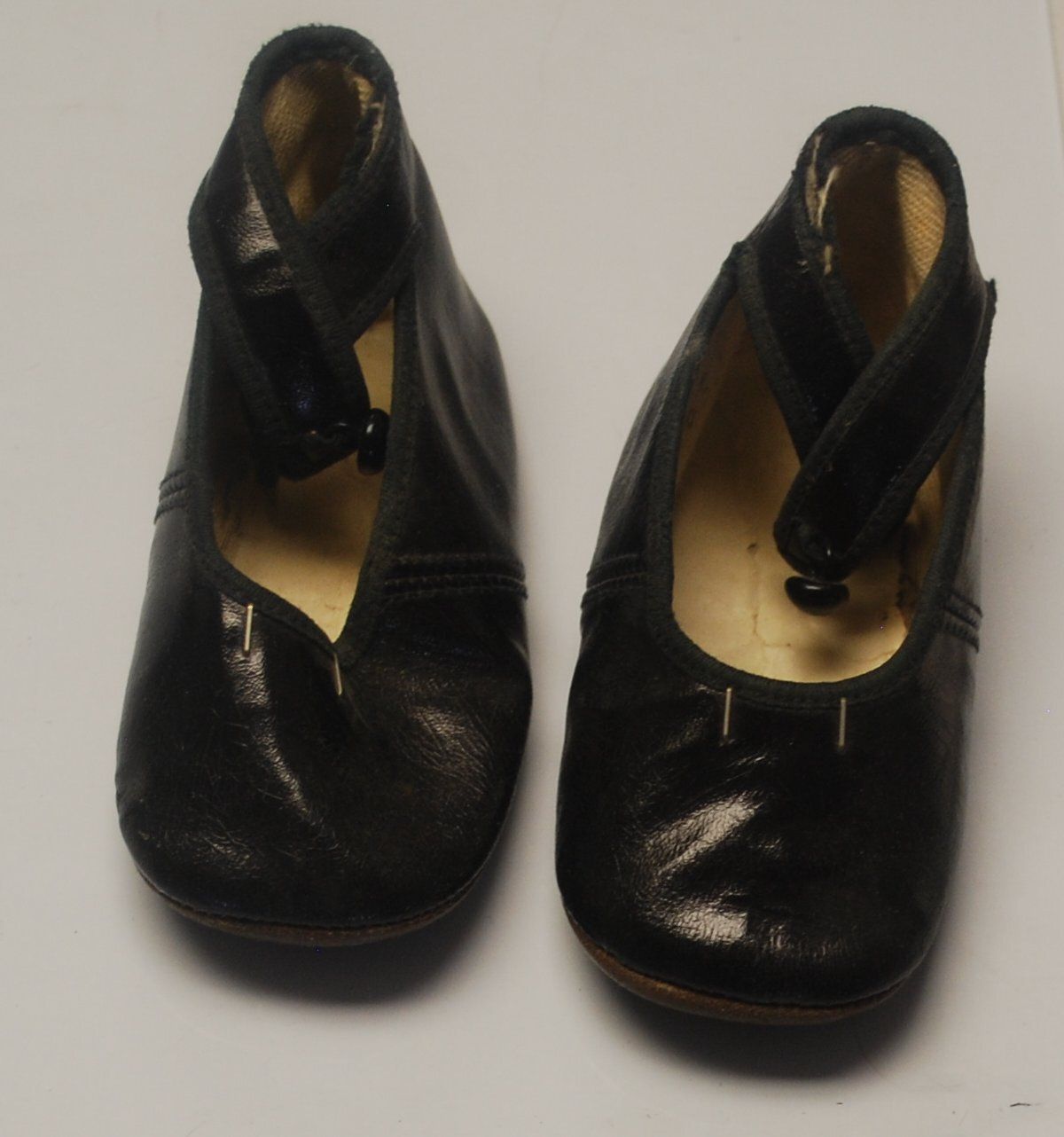 This is a pair of black leather baby shoes with a strap across the top of the foot. The shoes are marked "Mrs. Day's Ideal Baby Shoes". They each measure 2" (h) x 2"(w) x 4" (l).