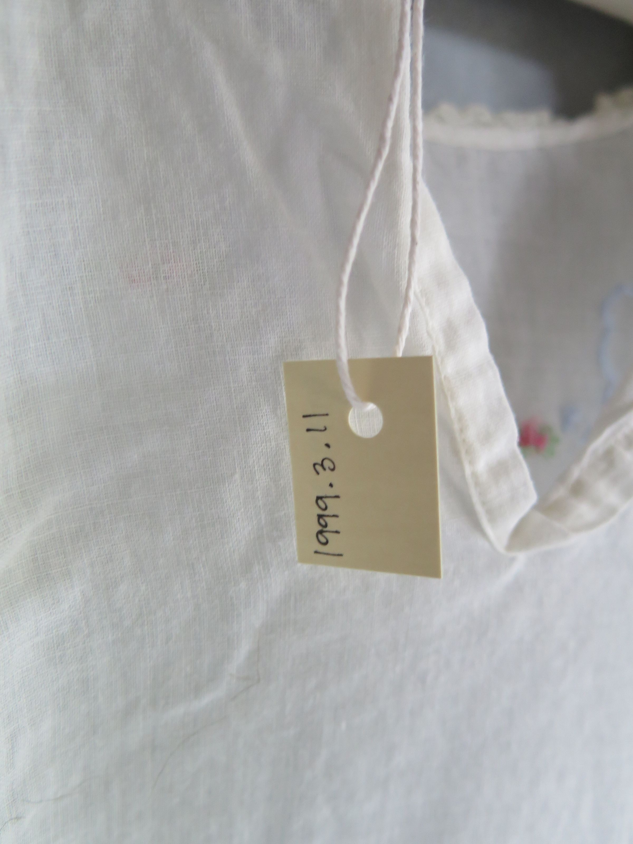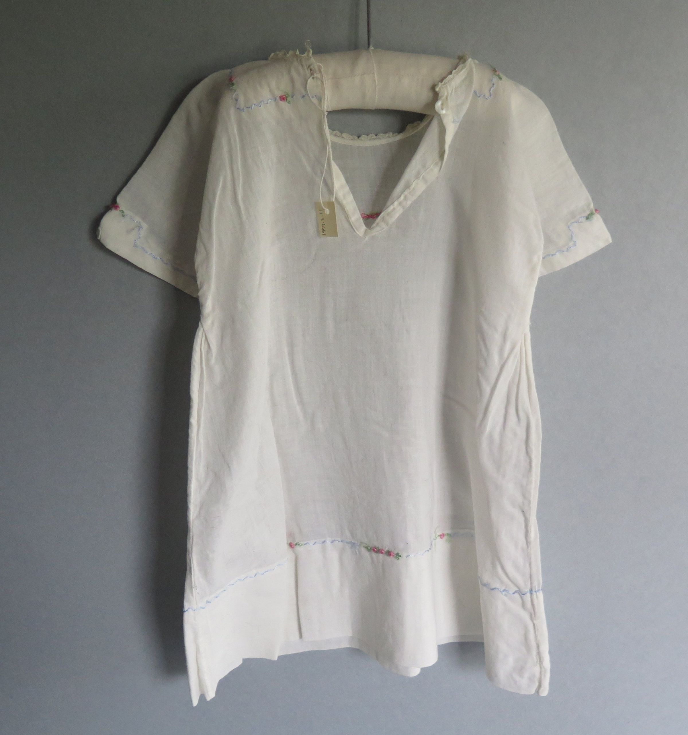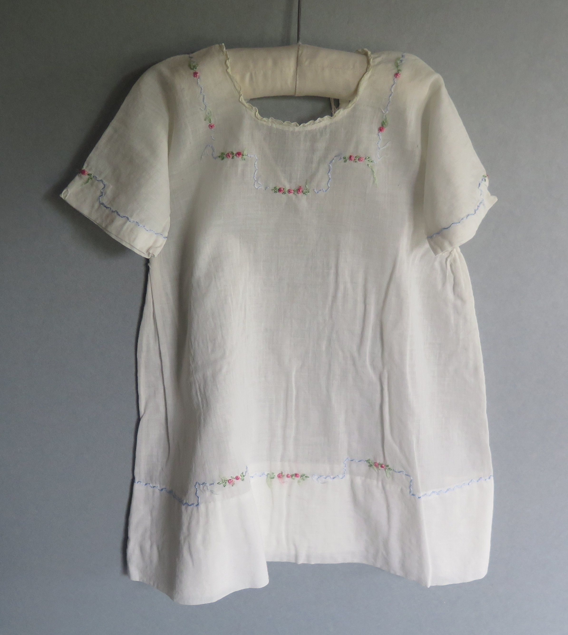 Baby's white dress with pink floral embroidery around the neckline, sleeves and the hem of the dress. The floral designs are attached with a blue crocheted line. The back of the dress opens up at the neckline with a single button to securely close. The dress measures 10" (w) x 17" (l).