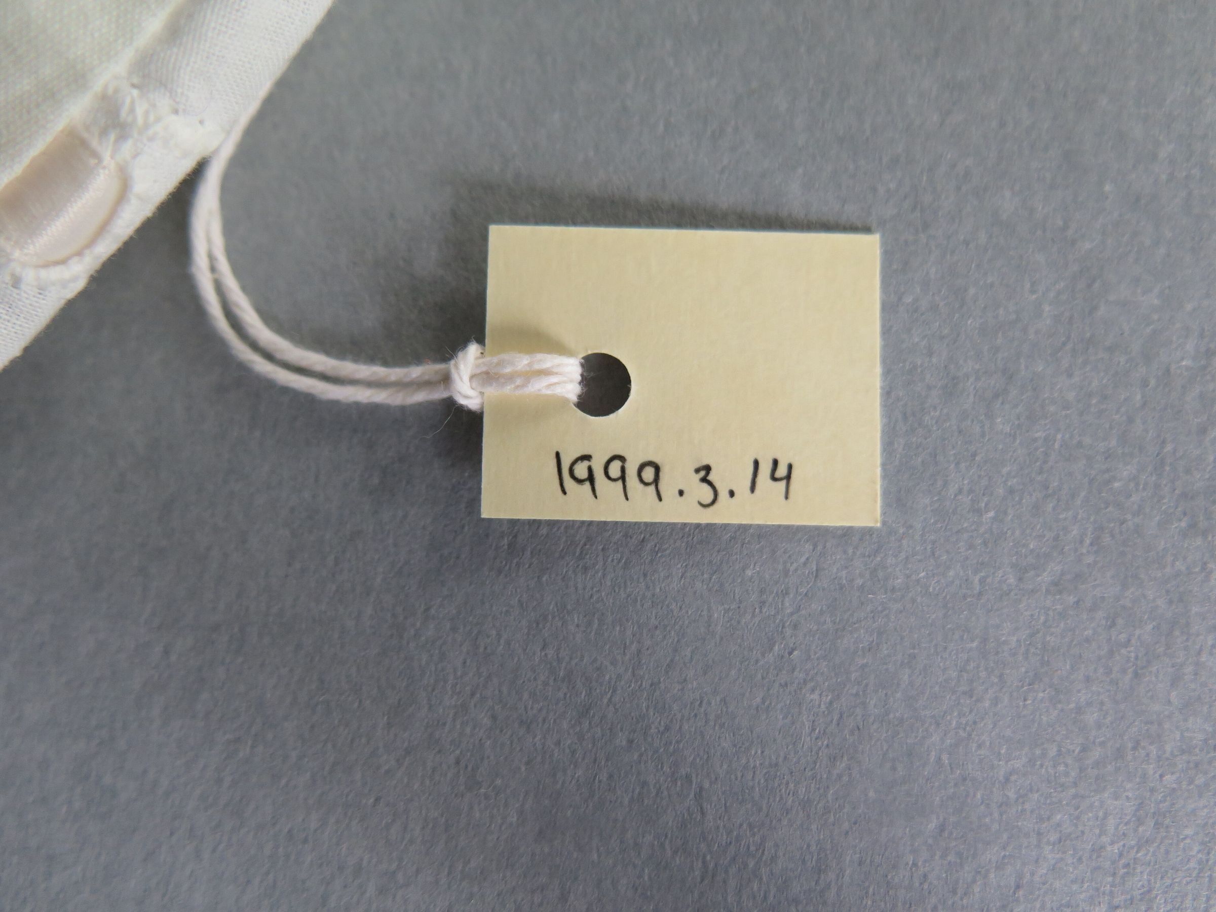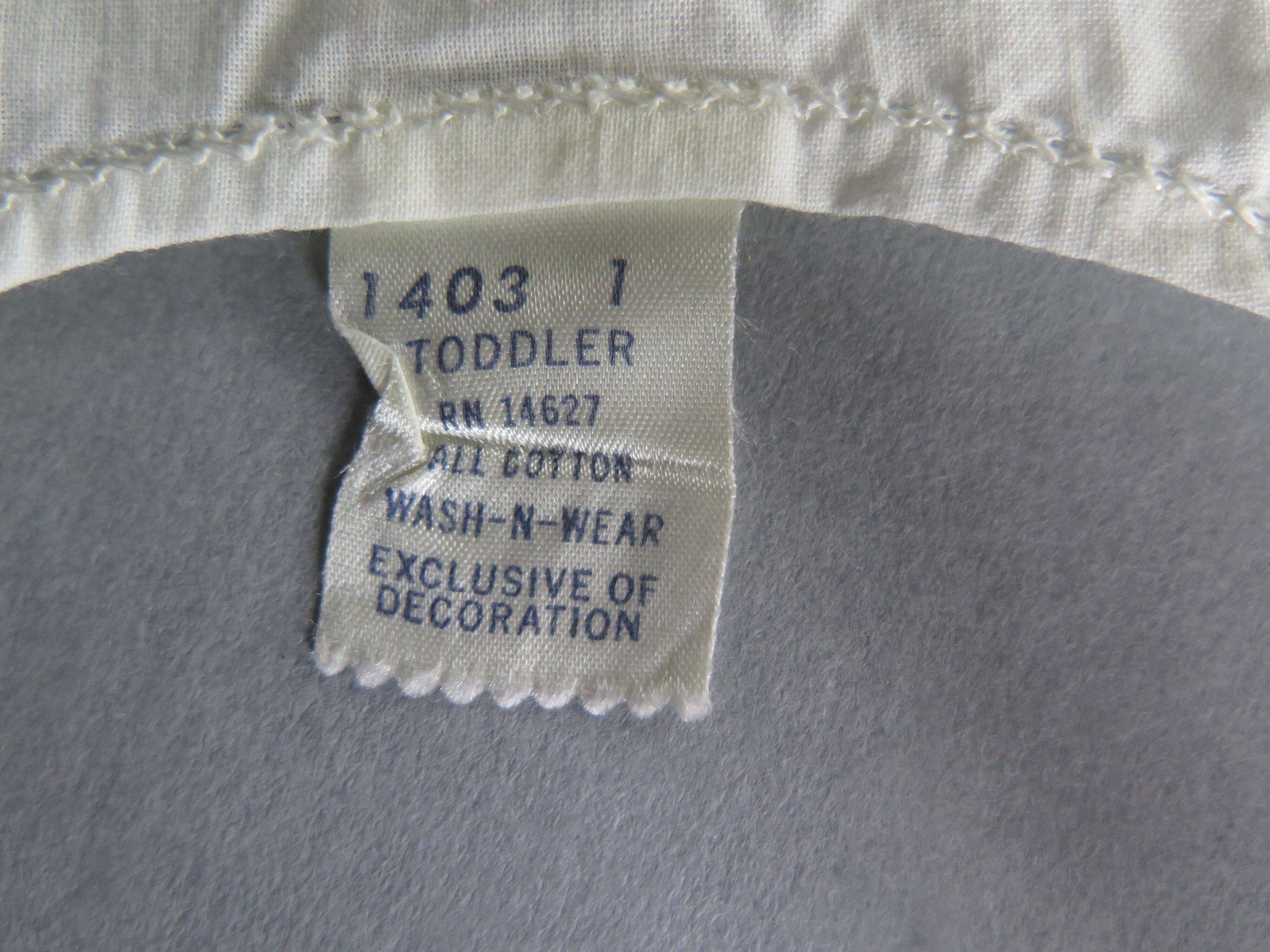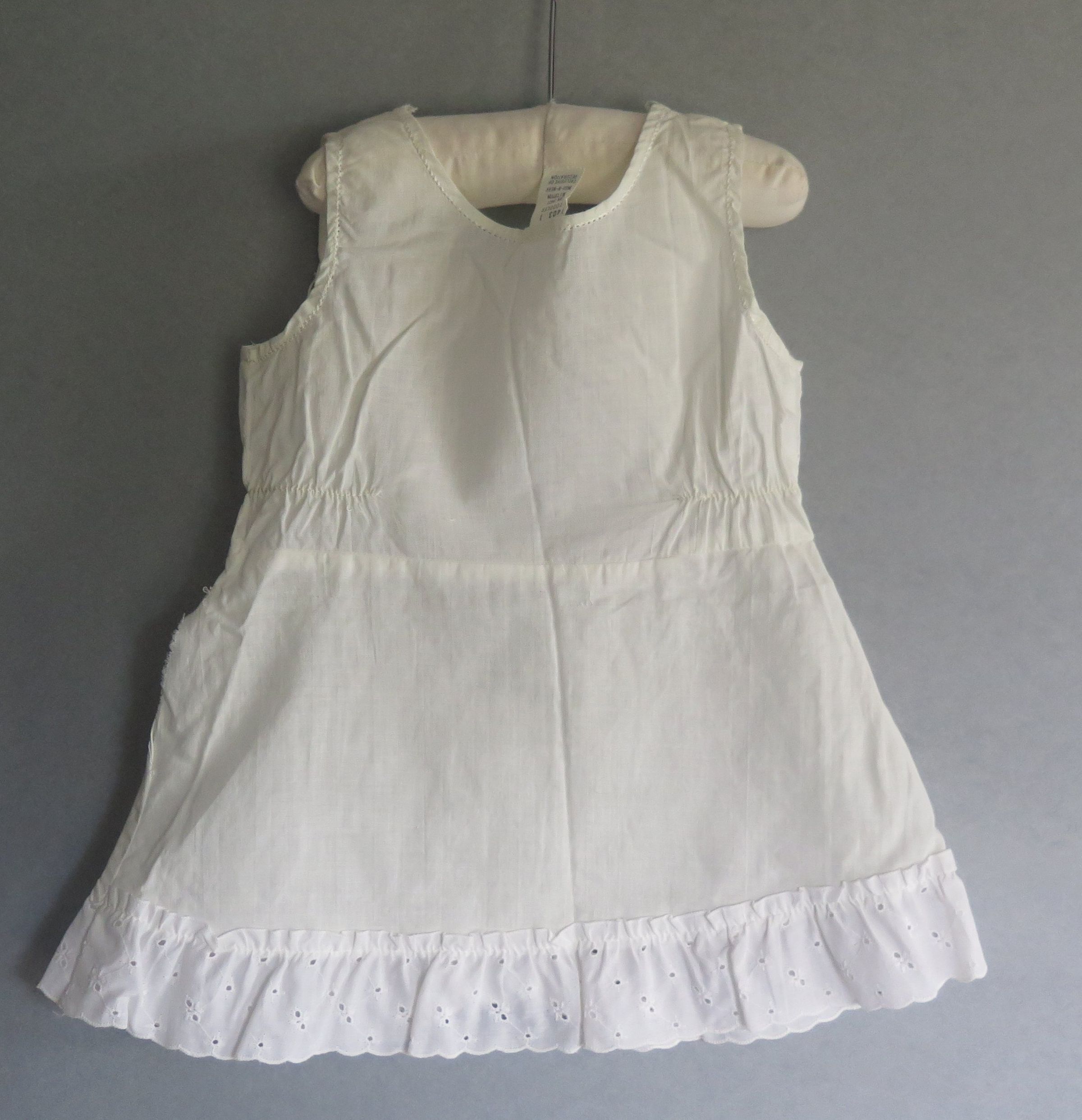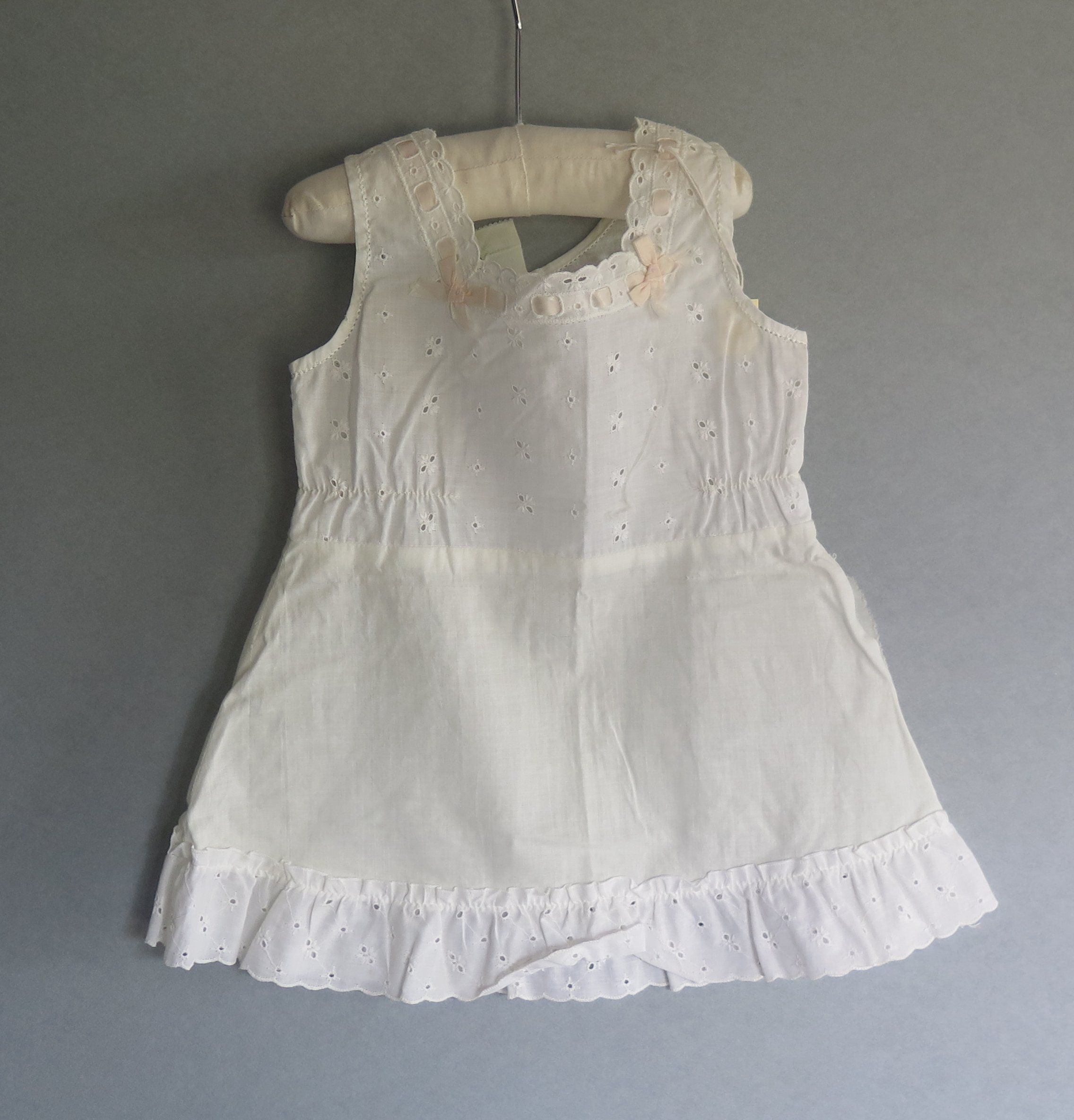 Baby's white slip or dress with scalloped trim. There is a pink or pale orange ribbon going through the neckline of the dress and two pink bows on either side of the neck. The neckline has scalloped edges. The chest of the dress is an eyelet designed material while the skirt of the dress is a solid material. The tag on the dress reads "Toddler All Cotton Wash-n-wear Exclusive of Decoration." Dress measures 9" (w) x 16" (l).