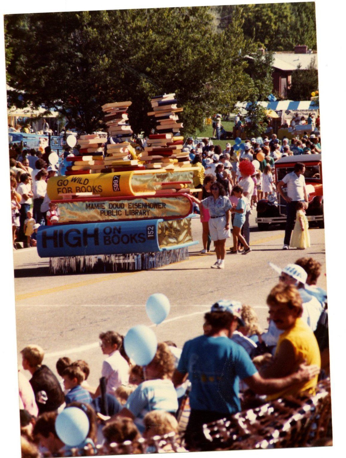 Item is a photograph printed on Kodak paper taken during the 1989 Broomfield Days celebration. The photo features the parade, specifically the Broomfield Library's float. It is designed to look like a stack of books, the lowest and biggest one reading "High On Books." The next largest red and yellow books read "Mamie Doud Eisenhower Public Library" and "Go Wild for Books," respectively. Some people are walking next to the float, which was designed by Terry Barnhart and Chuck Mead, and a red car is driving behind it. Crowds had gathered on both sides of the street to see it, and trees are visible behind them.Photograph Details