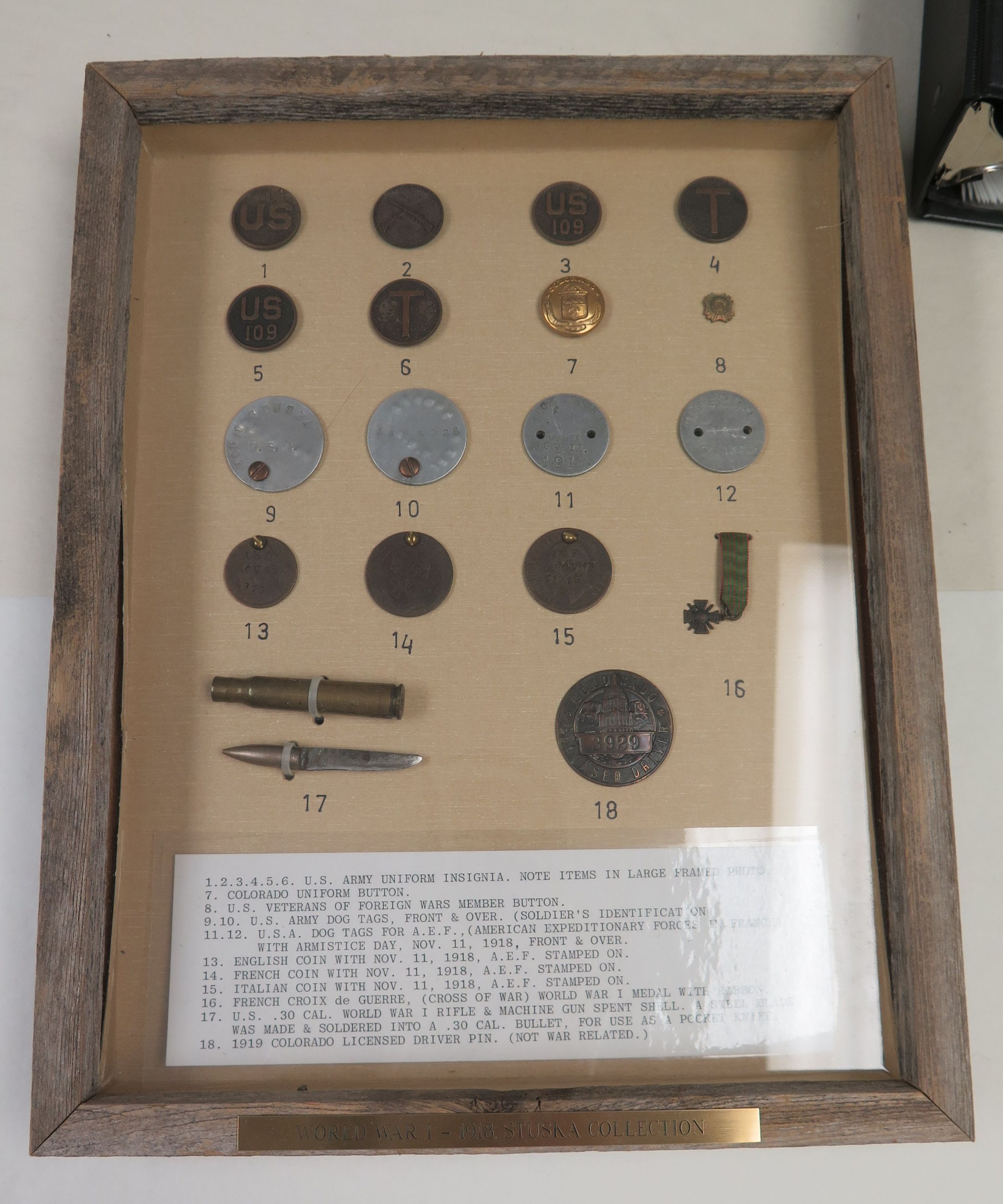 This is a frames set of small military items from WW I. The set includes: 6 Army uniform insignia, 2 buttons, 4 dog tags, 3 coins, 1 Cross of War Medal, 2 bullets, and 1 Driver Pin. The frame is wood. The frame measures 11" (w) x 14" (l) x 1.5" (d).