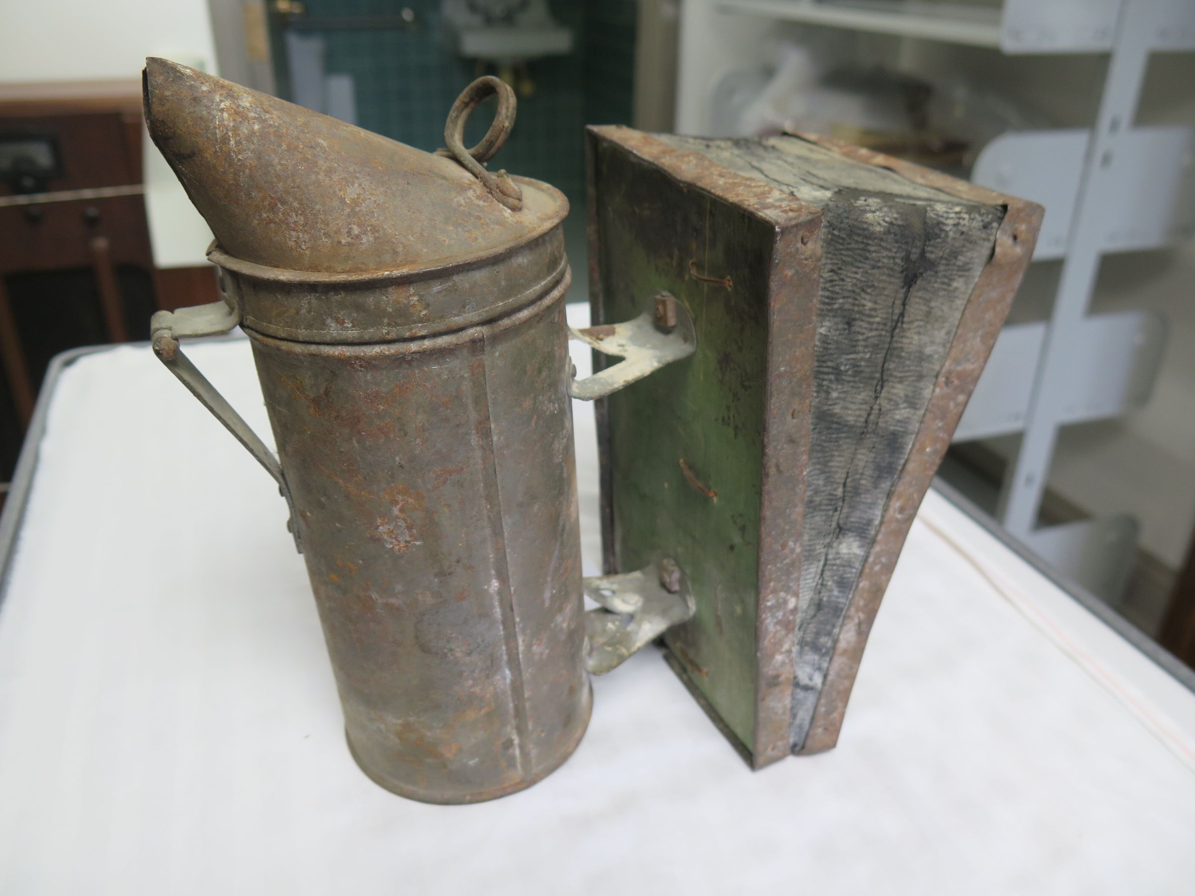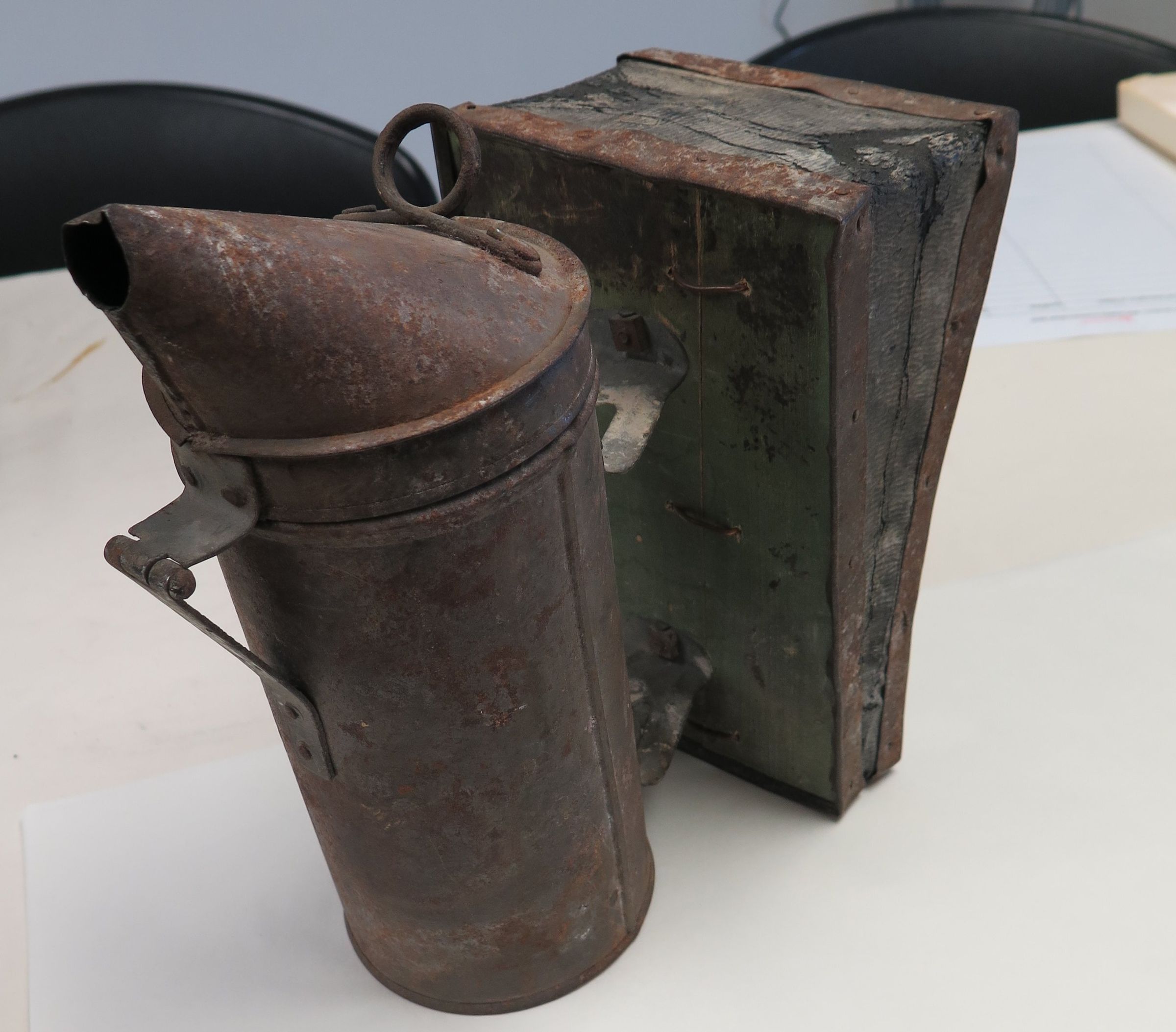 This is a rusty bee smoker made of wood, metal, and leather. The bee smoker measures 9" (h) x 5" (w) x10" (l).