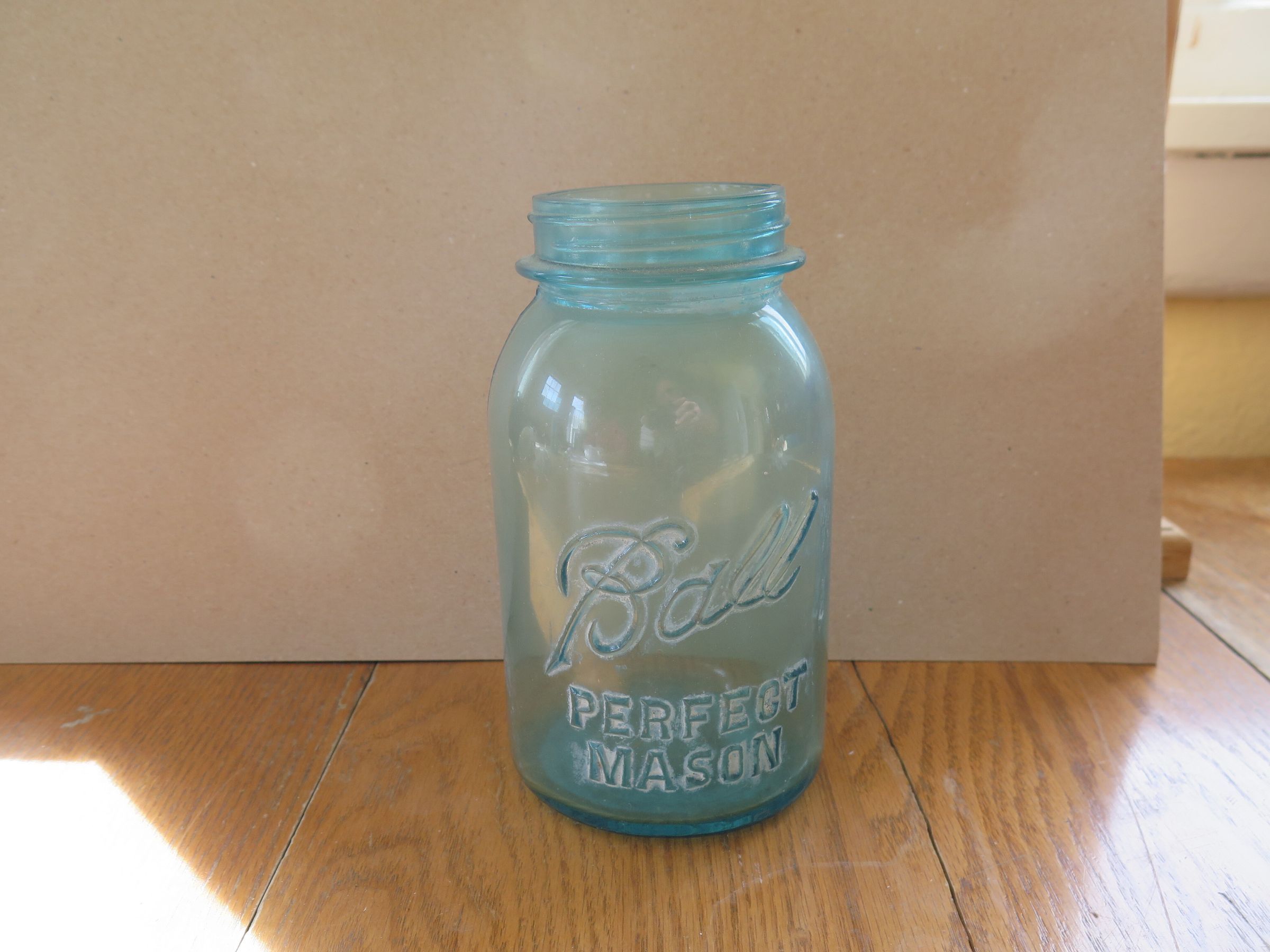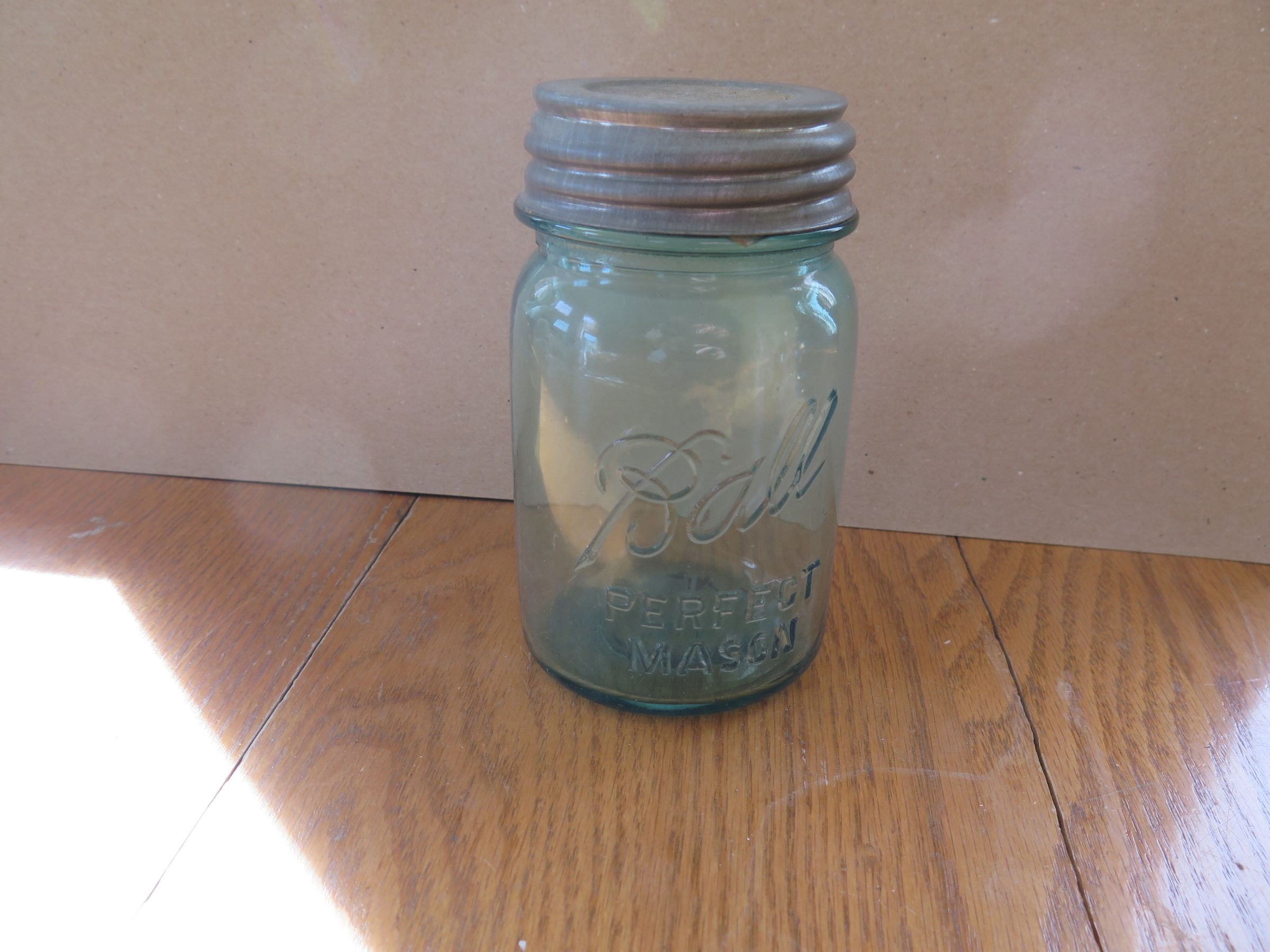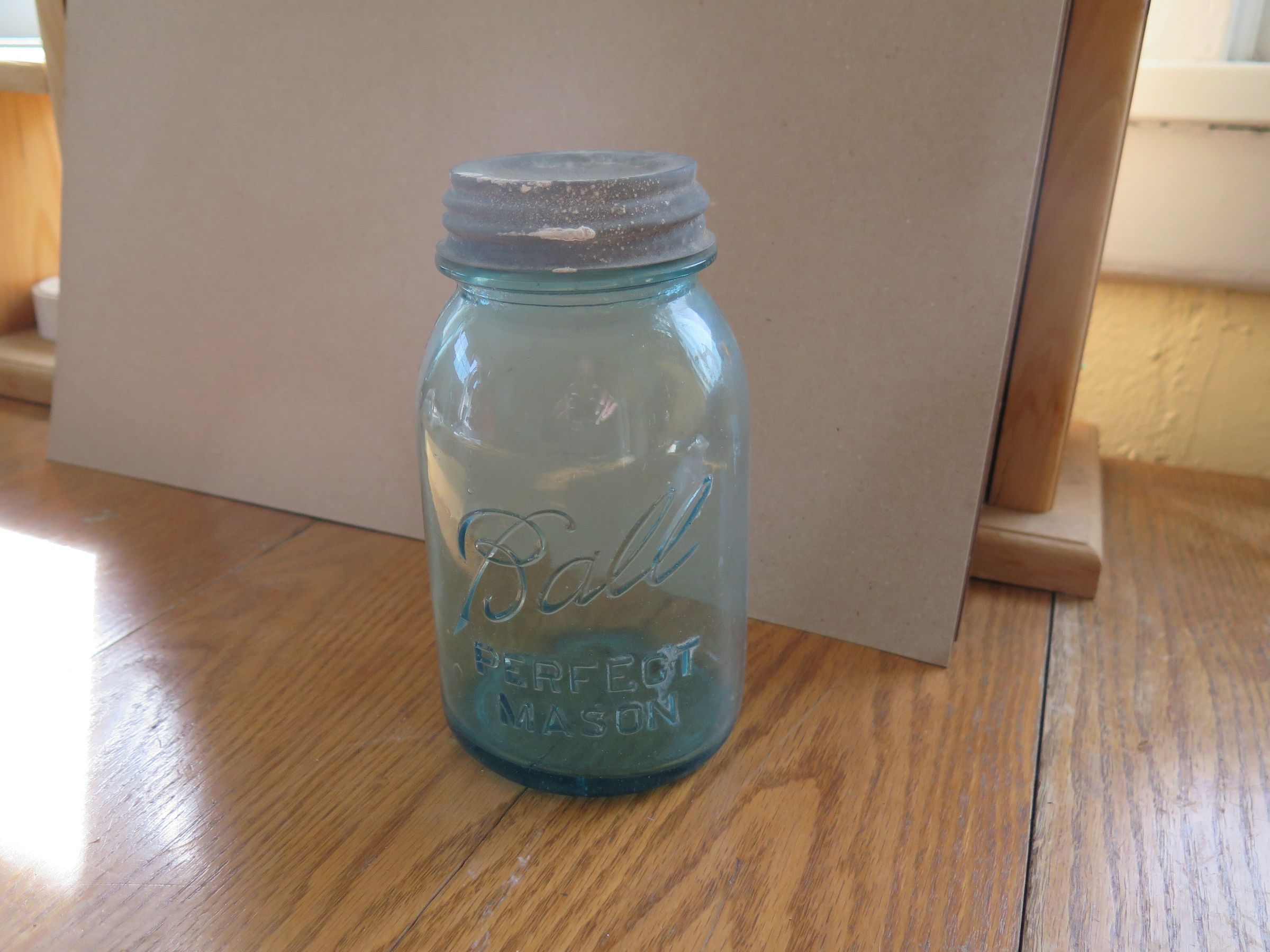 This is a blue glass Ball jars with a metal lid. The text on the jar reads "Ball/ Perfect/ Mason." The jar with white stain on the lid measures 7" (h) x 3.75" (diam).