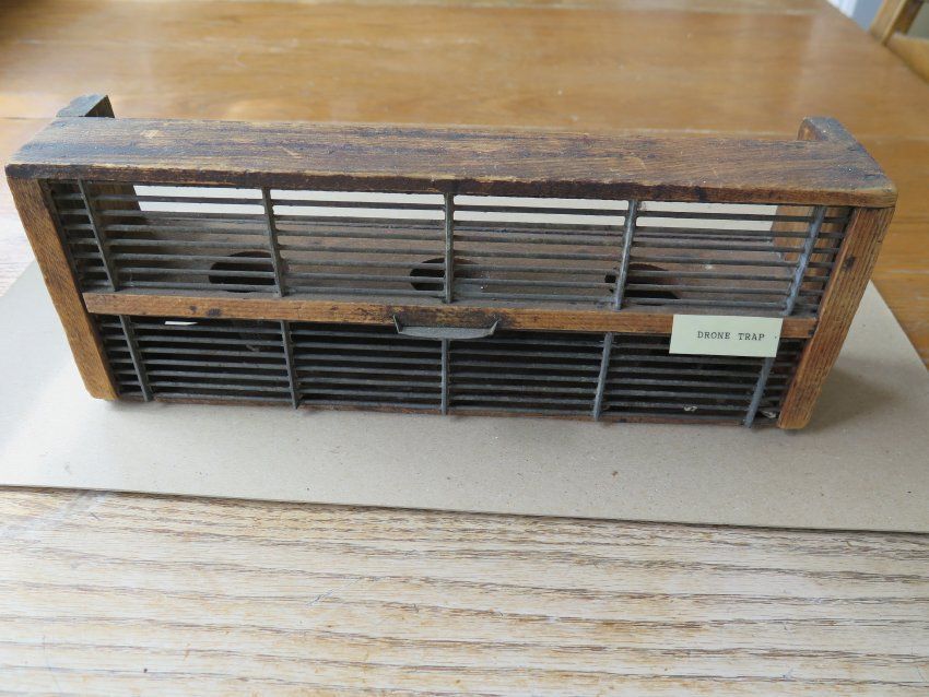 Wooden drone trap made from a wooden box with a metal screen on the front and two mesh cones inside of holes in the wood. The trap measures 4.75" (h) x 12" (w) x 2.5" (deep).