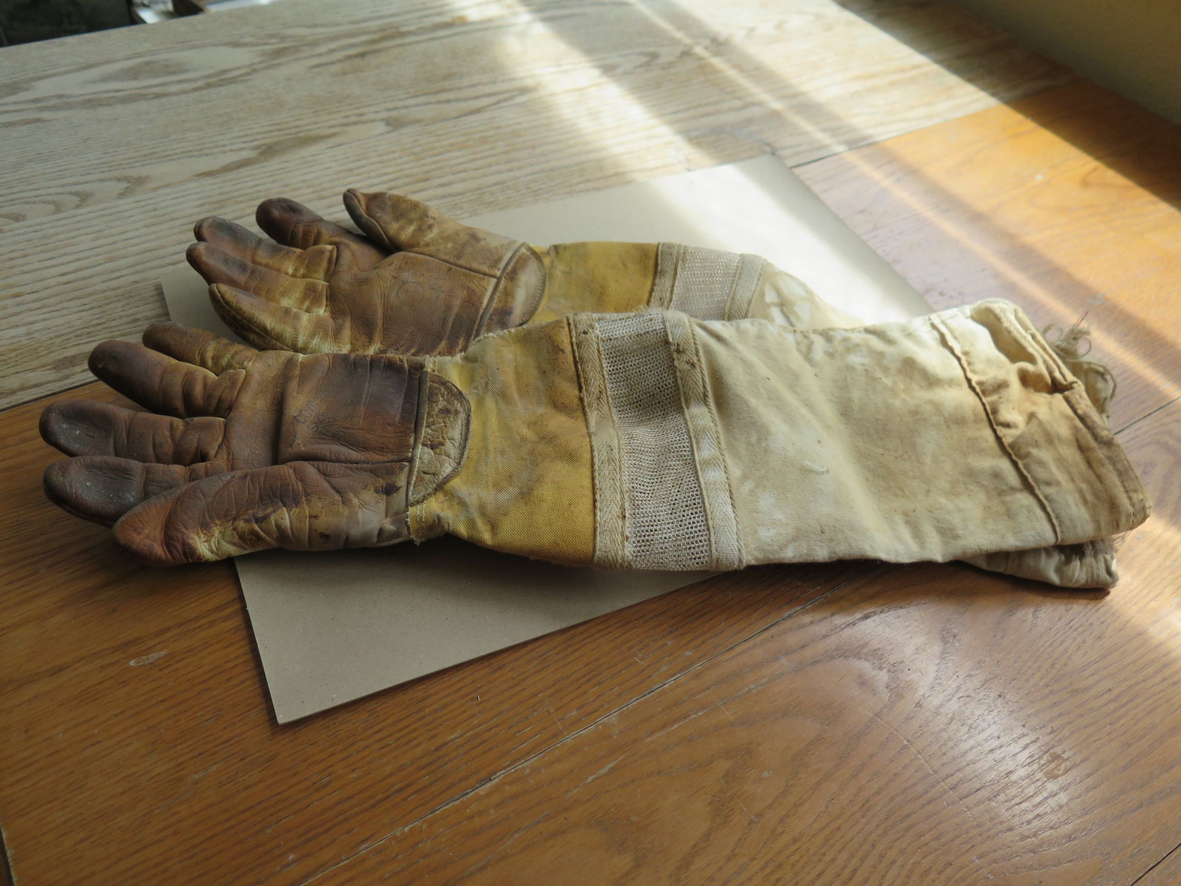 This is a pair of white canvas beekeeper gloves with leather palms. The gloves were manufactured by Walter T. Kelley Co. The gloves each measure 7" (w) x 22" (l).