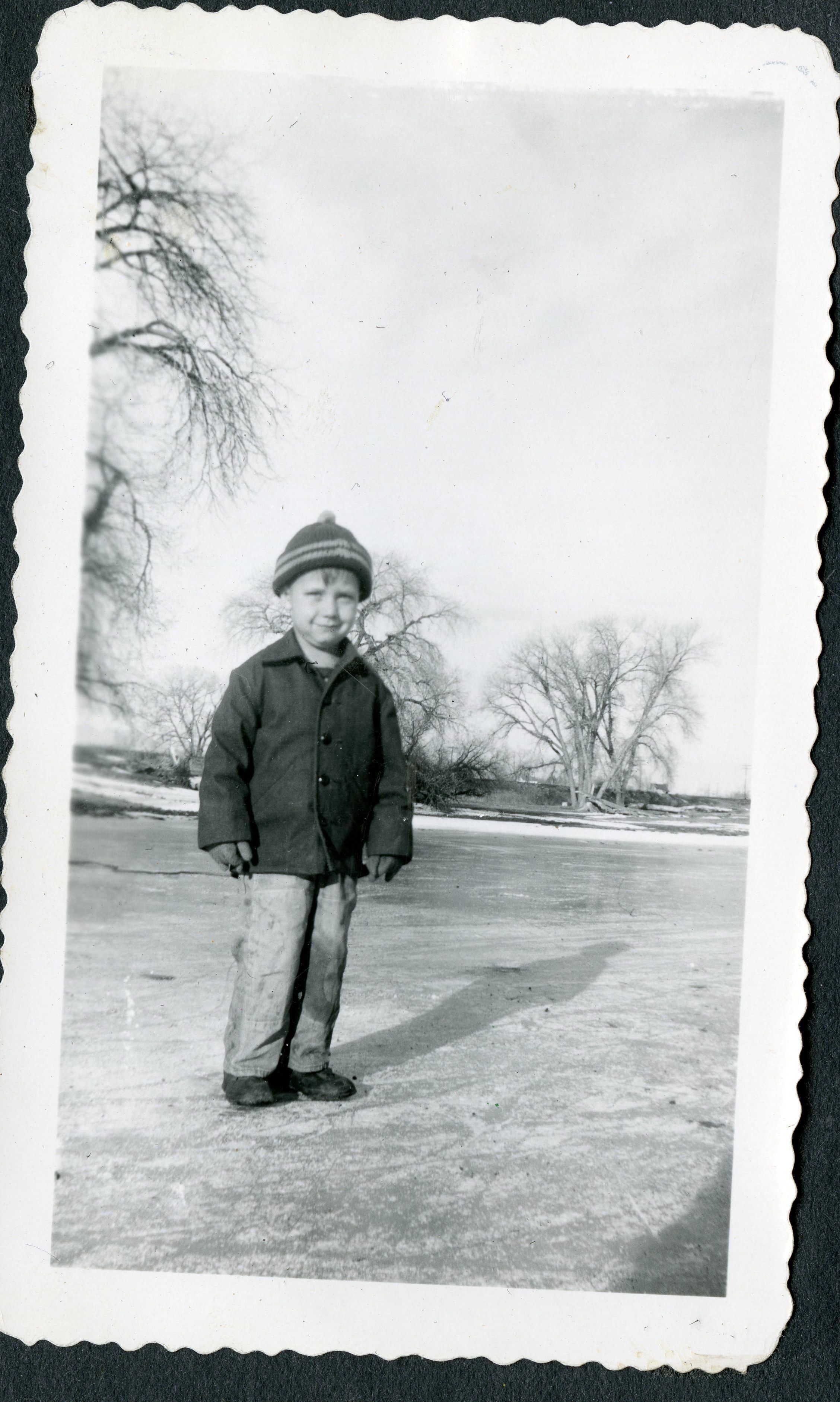 black and white photograph of Lester K Brunner. There are no leaves on the trees, and the boy is wearing a hat and a coat, so this photograph was probably taken in the fall or winter.