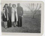 Black and white photograph of two men and two women standing outside. There is a field in the background. The woman on the left is wearing a black and white dress, black shoes with heels, and a necklace. The other woman is wearing a black dress, black shoes with heels, and a white coat. The two men are wearing naval uniforms. The ben are Clyde and Dale Brunner. There is a tall object in the background, possibly a silo.Photograph Details