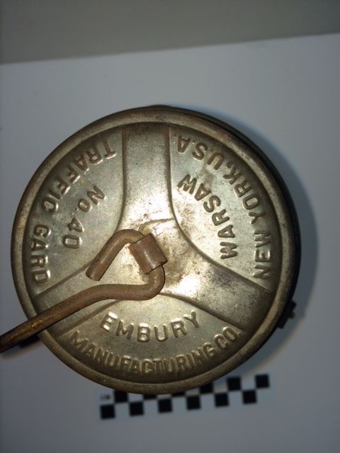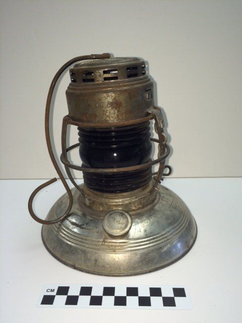 This metal kerosene railroad lantern, The Embury No. 40 Traffic Gard, measures 8"(h) x 7.25"(dia). The metal is nickel plated. The lantern has an intact red glass globe and a wire hanger on top.