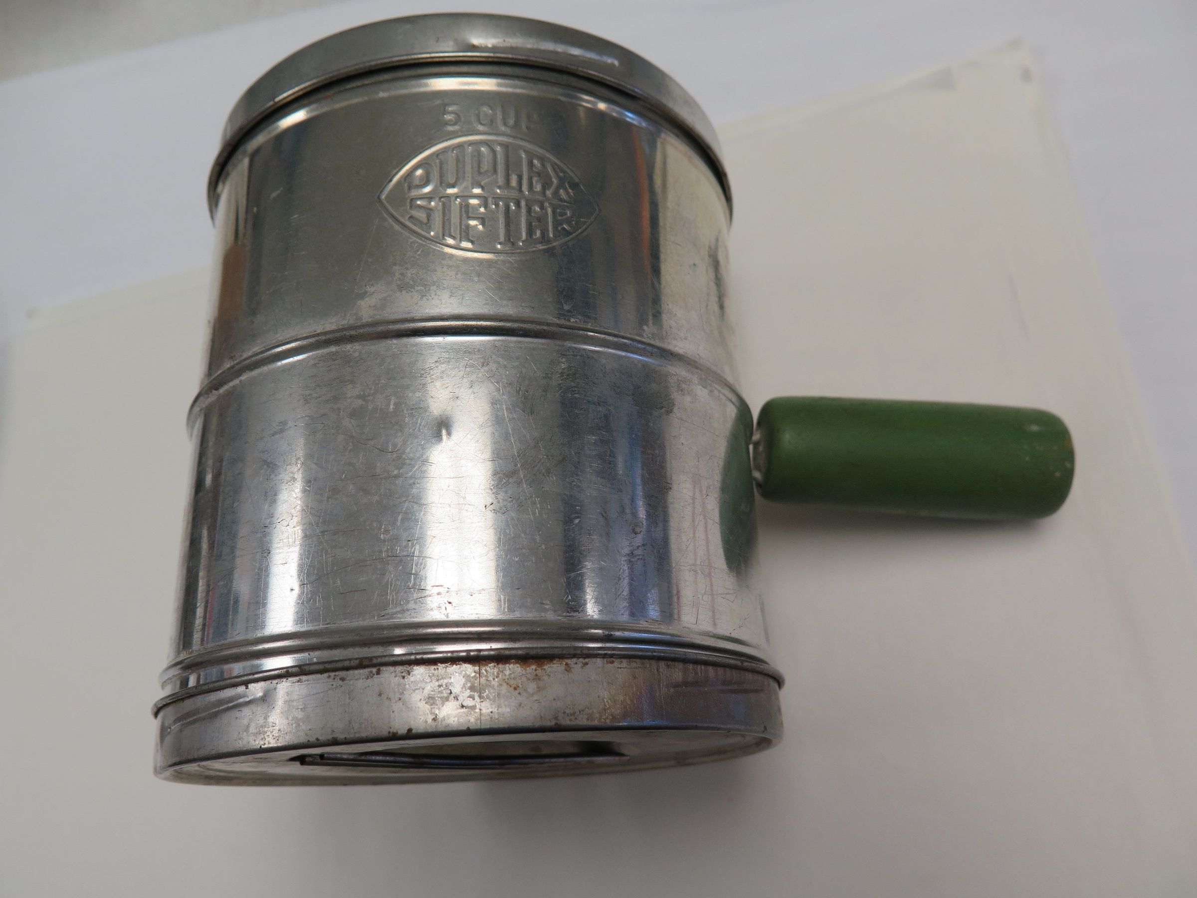 This is a metal Duplex flour sifter with a green wood handle. The sifter measures 6.5" (h) x 9.5" (l) x 6" (dia).