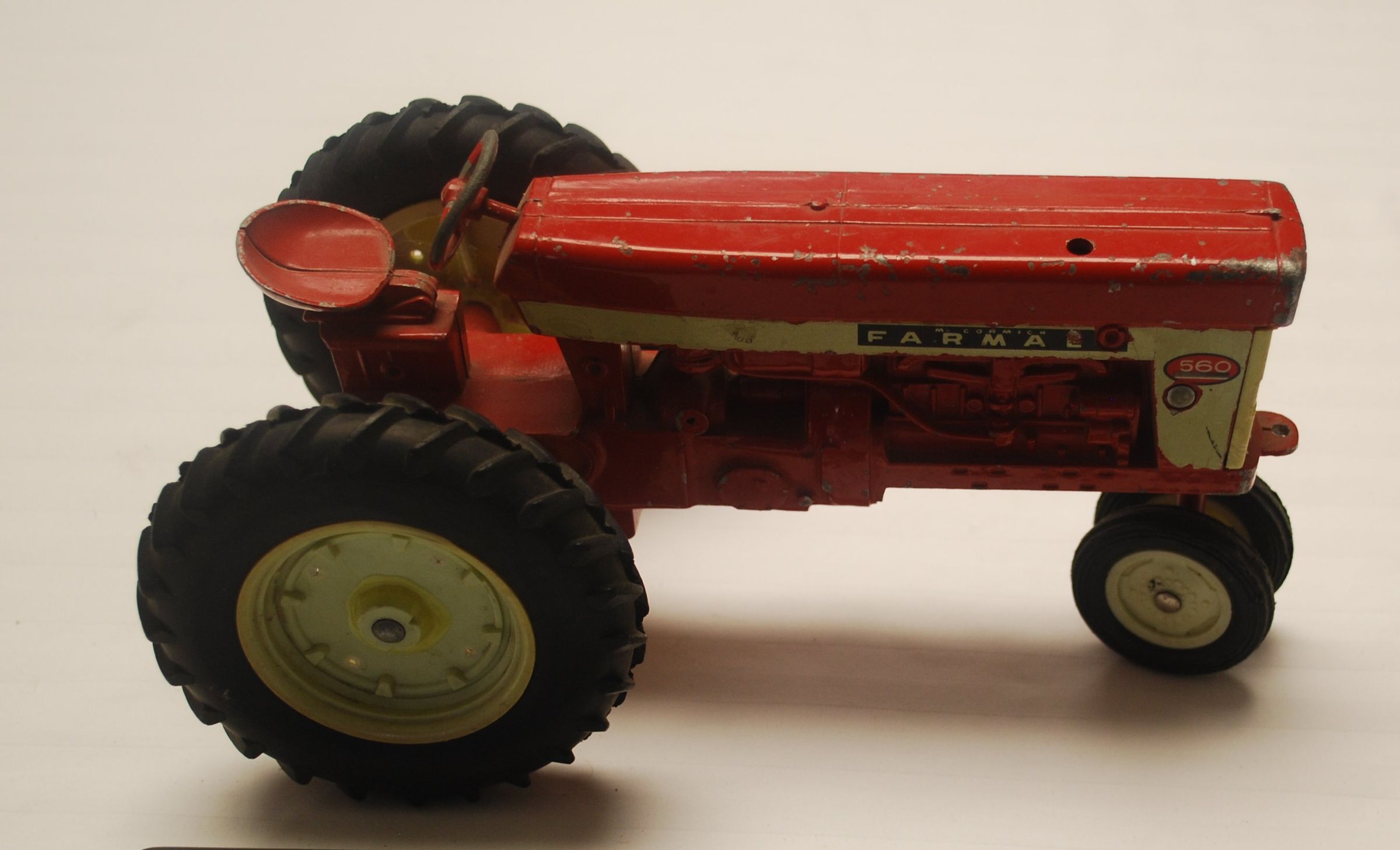 This is a red toy tractor from Farmall. It has a red seat and steering wheel and black tires with white rims. It is made of die-cast metal with steerable wheels. It is a 1/16 model of the actual tractor, but was marketed as a toy. It is the Farmall 560 wide front tractor. This model was produced in 1978 by IH, International McCormick Farmall. It was sold at the first National Farm Toy Show from Toy Farmer.Collection