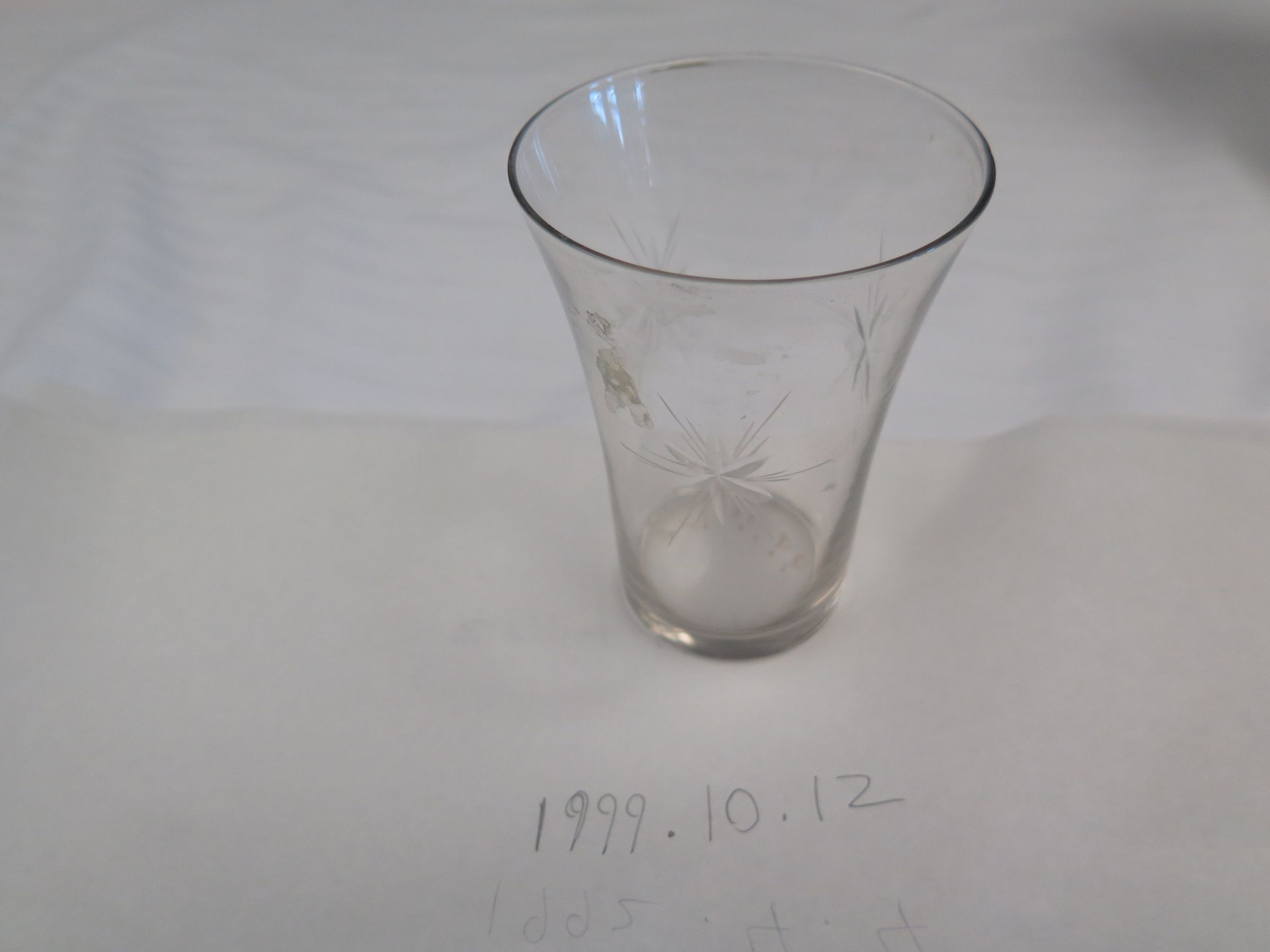 This is a clear glass drinking glass that gets wider at the top. The glass has star shapes etched into the sides. The glass measures 4" (h) x 3" (dia).Collection