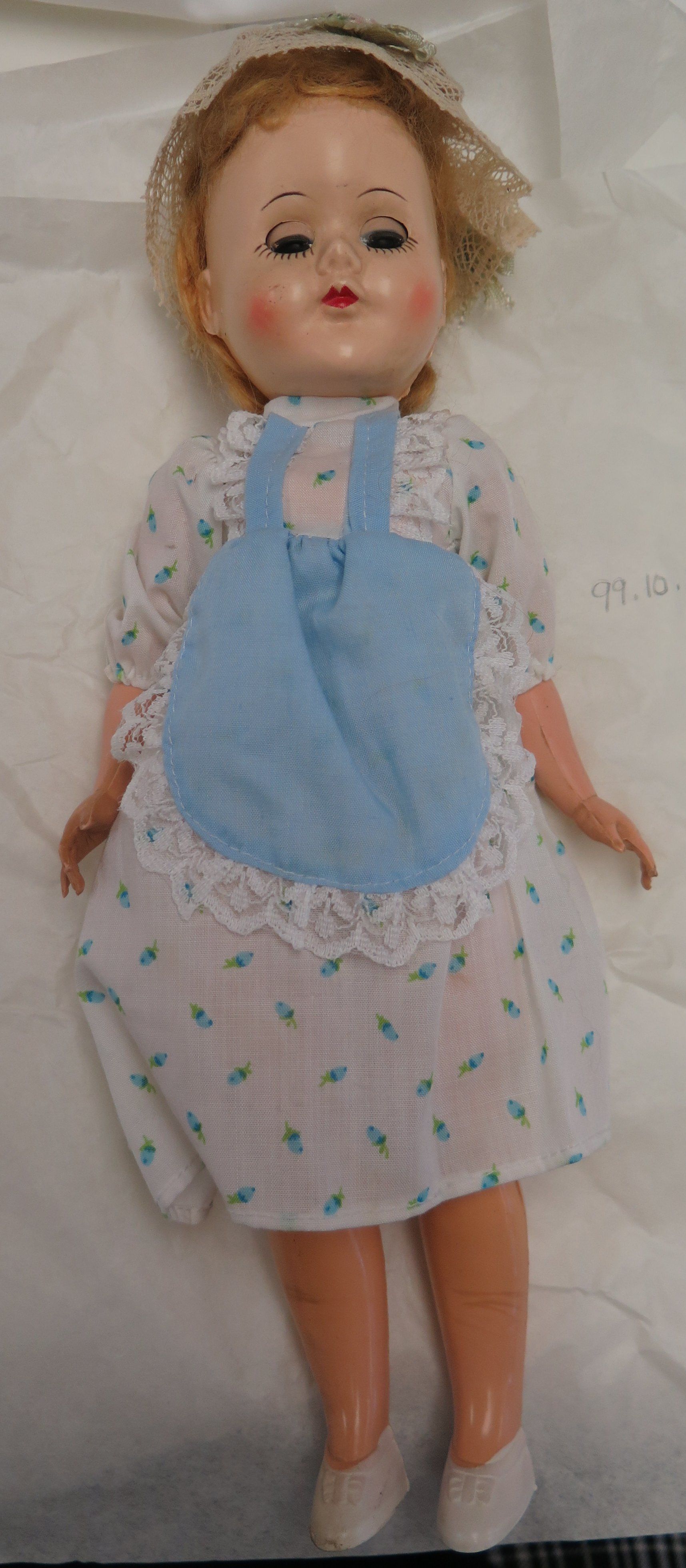 This is a plastic doll with sleep eyes and a closed red mouth. The doll has blonde hair. The doll is wearing a white flowered dress and blue apron with a lace cap. The doll is cracked on the back. The doll measures 2.5" (h) x 5.25" (w) x 12.5" (l).Collection