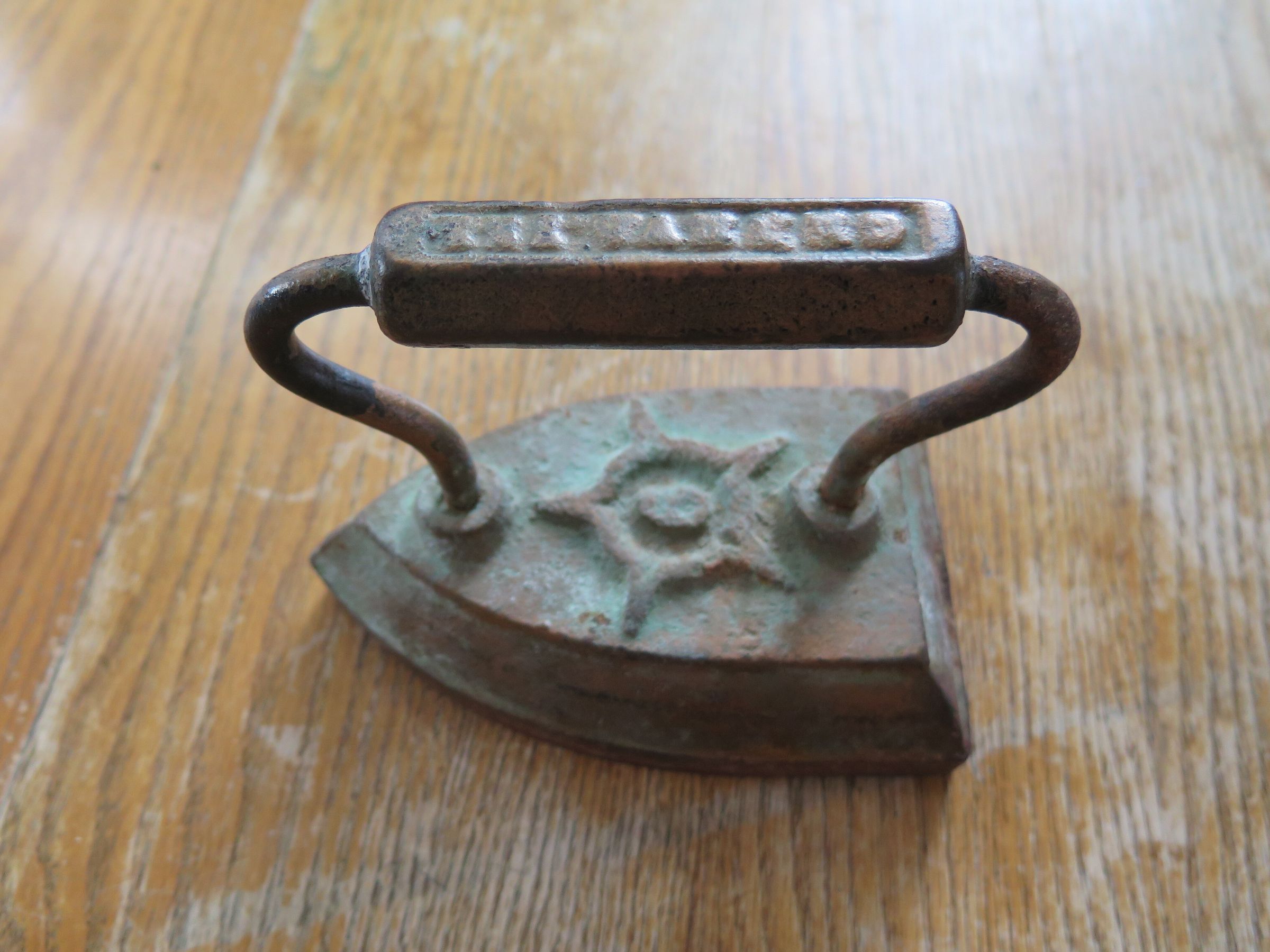 Six sad irons. One of these irons has been located, and is in the Honey House. It is a solid iron (the handle does not detach) with a large star stamped on the body. The handle reads on the top "Geneva 1xx(?)." 5.75" (l) x 3.5" (w)