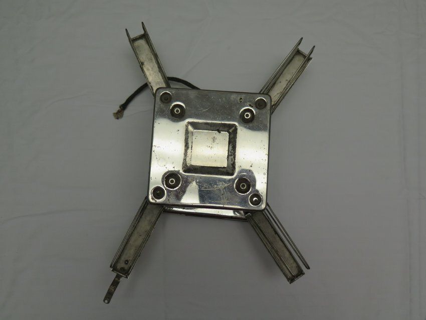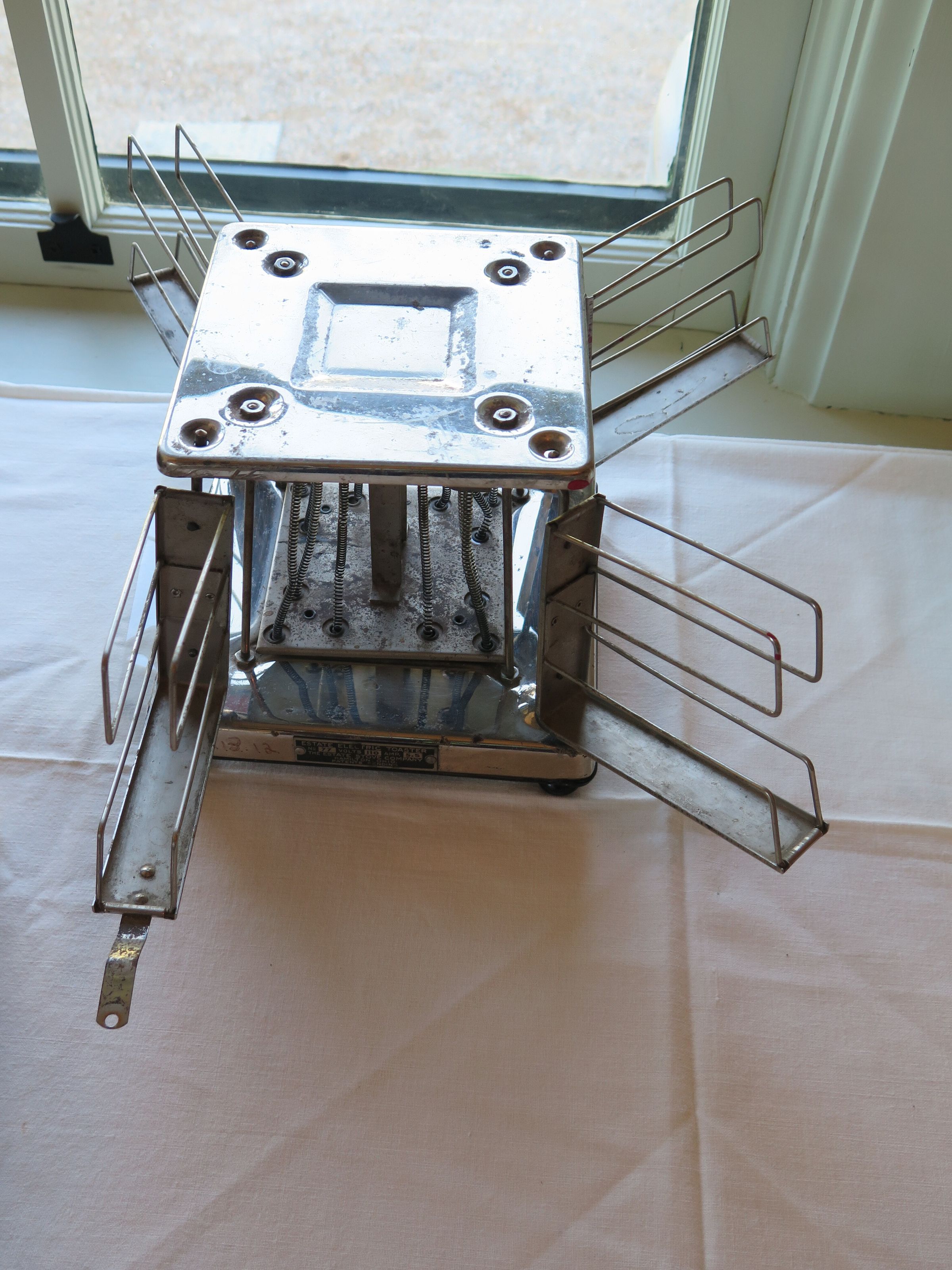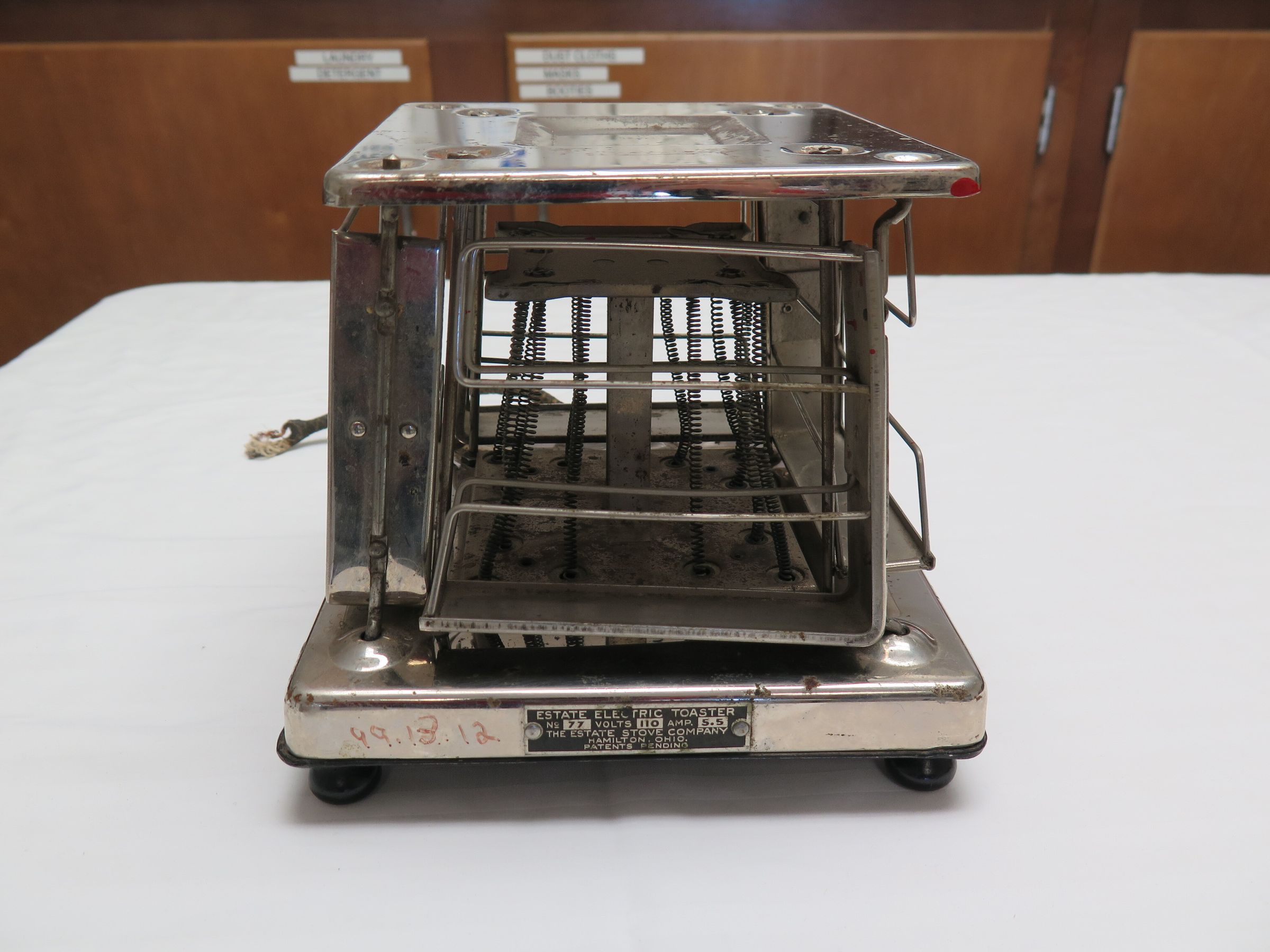 Estate Electric Toaster No. 77 produced by the Estate Stove Company. This is the first version of the flour slice Estate Electric Toaster. Swing the cage with the handle(handle is missing on our model) and the other three will follow. Very basic design, but an exciting flip mechanism. The toaster measures 6.5" (h) x 15" (w) x 15" (l).