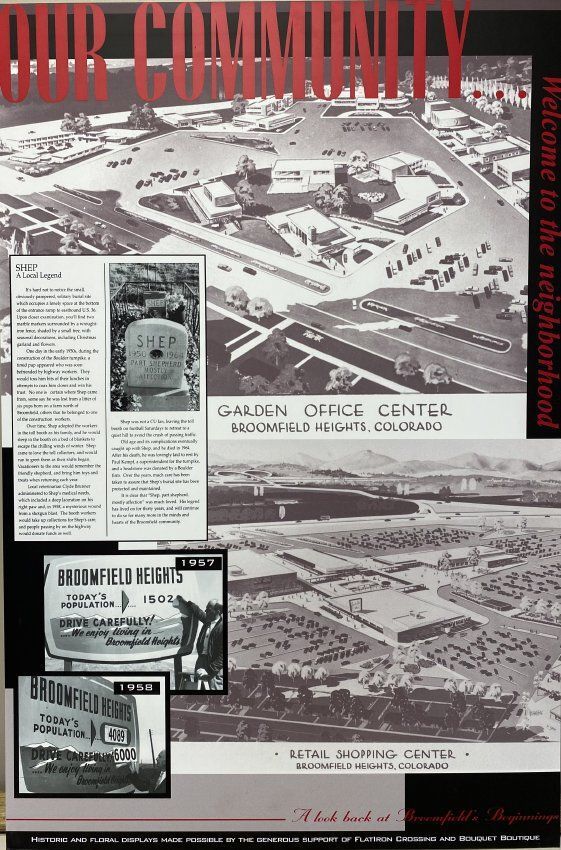 Large foam core poster from a presentation at the Flatirons mall on Broomfield History. Subject: "Garden Center"