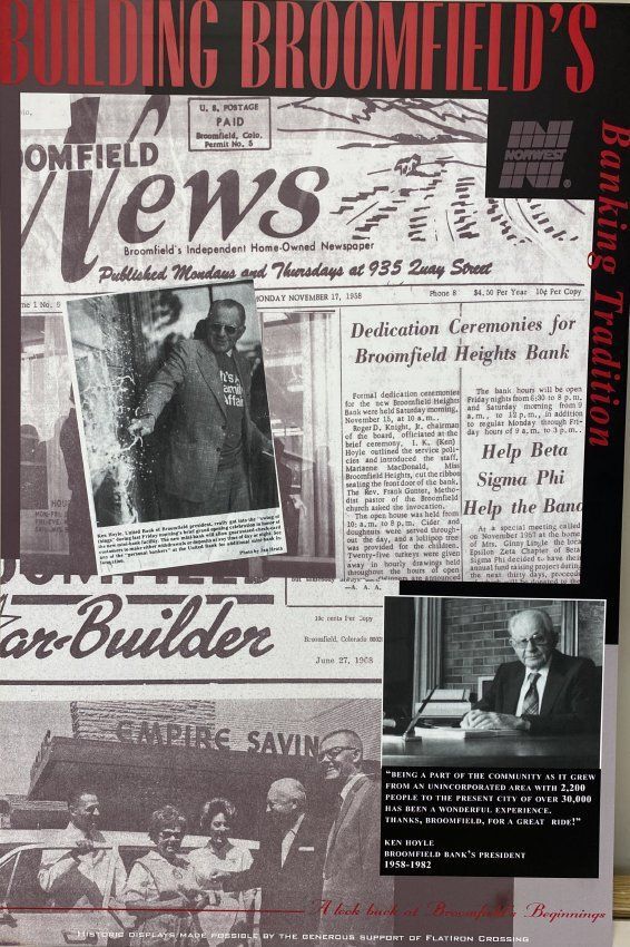 Large foam core poster from a presentation at the Flatirons mall on Broomfield History. Subject: bank