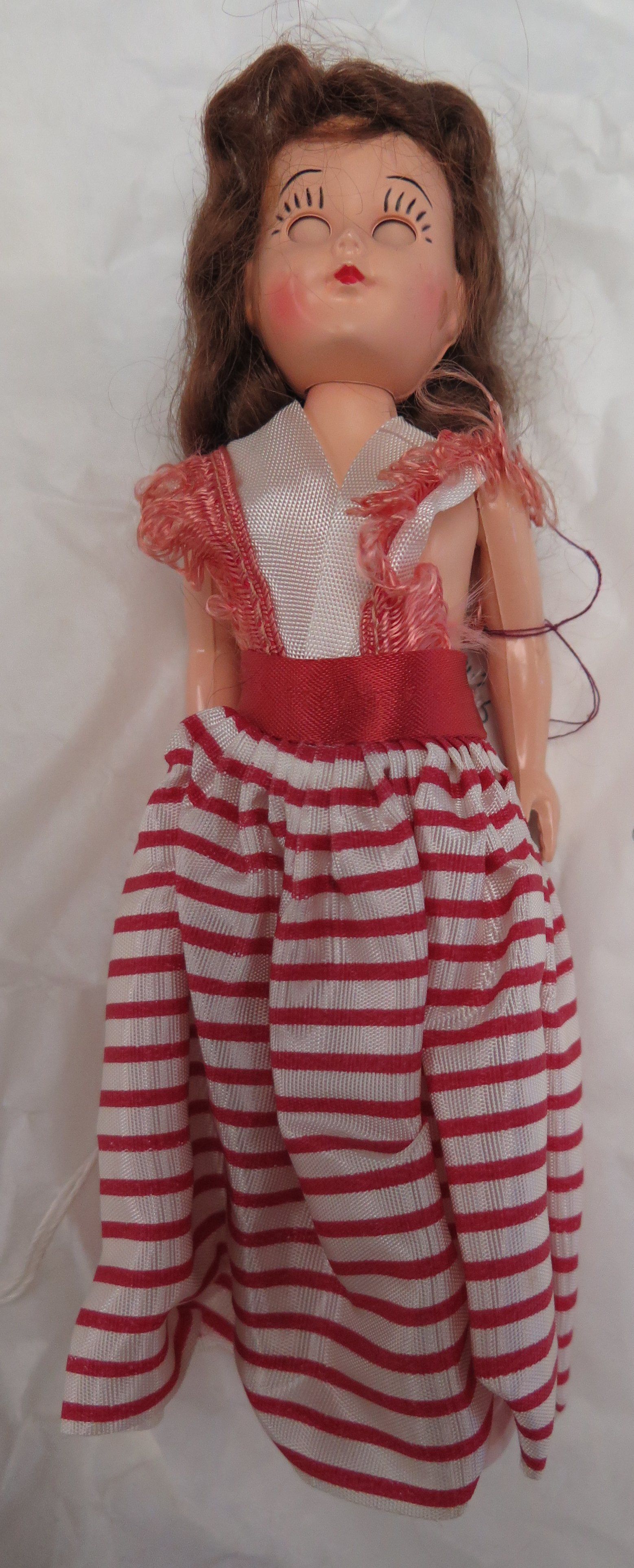 This is a red haired plastic female doll. The doll is wearing a red and white striped candy stripe style dress with a red sash. The doll has plastic sleep eyes. The doll measures 7.5" (h) x 2.5" (w) x 1.5" (d).Collection