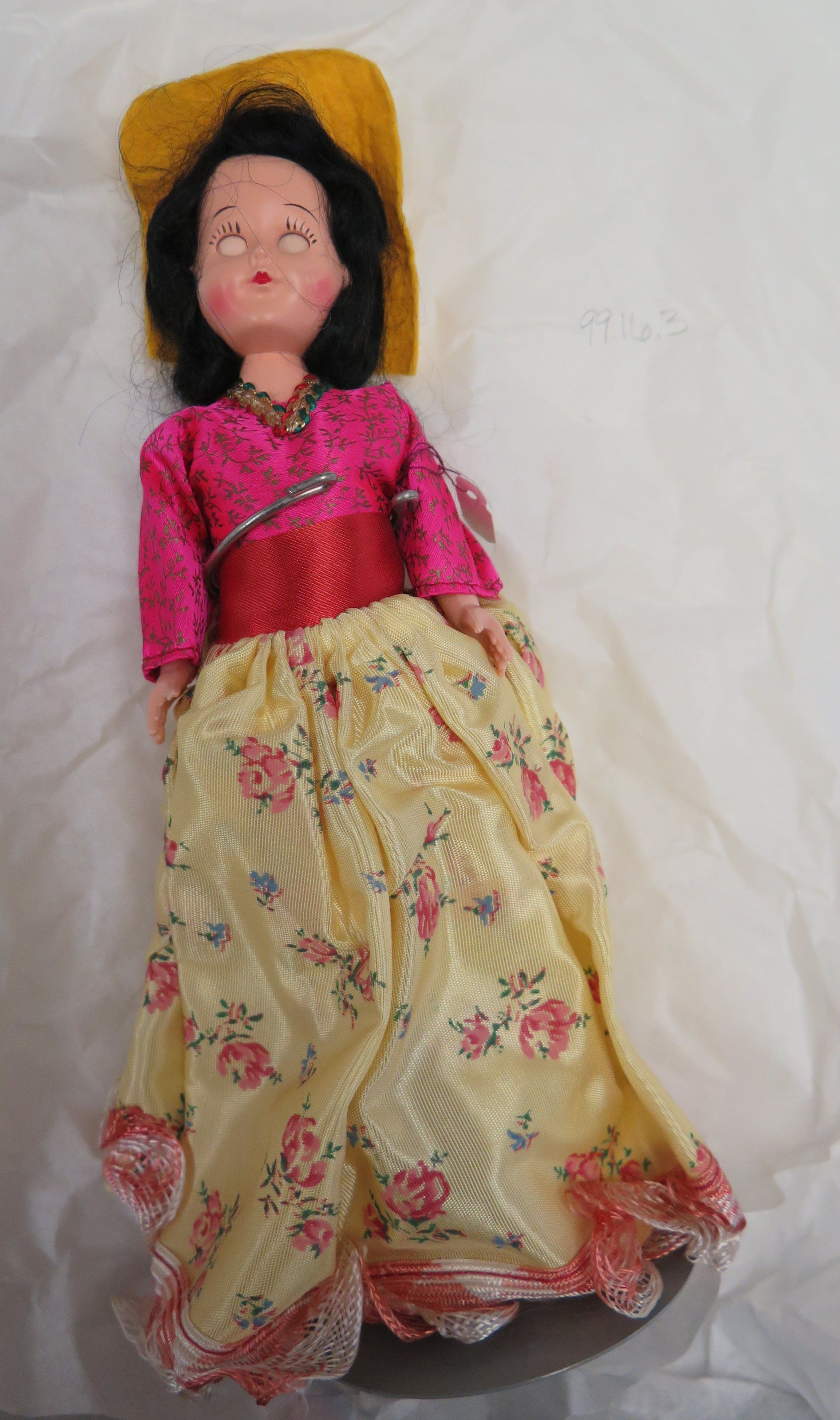 This is a female doll wearing a pink shirt, yellow skirt, and a yellow hat. The doll has long black hair and a red, closed mouth. The doll has sleep eyes. Both the shirt and skirt are patterned with flowers. The doll measures 9" (h) x 4" (w) x 4" (d).Collection