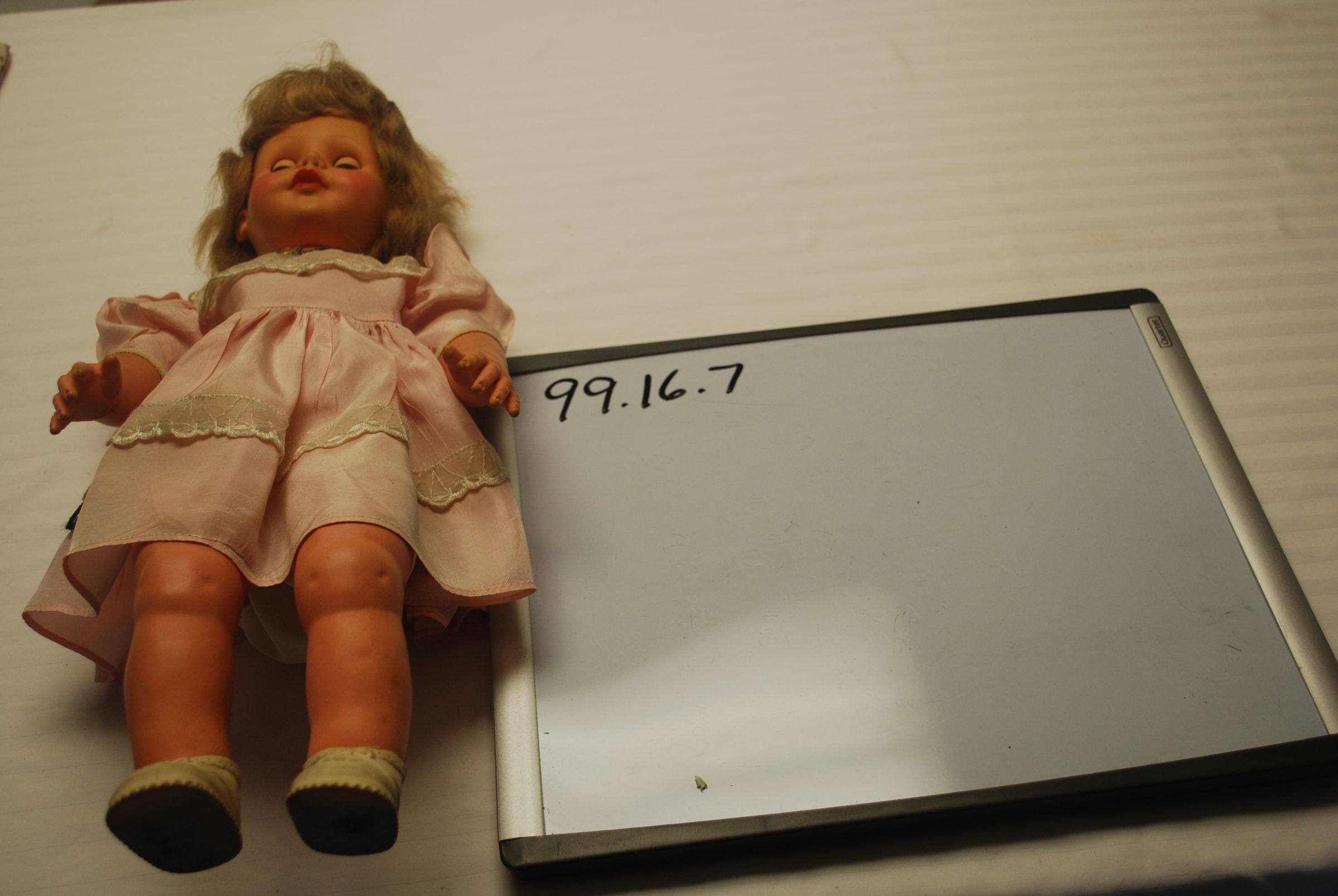 This is a plastic female doll with blonde hair and bangs. She is wearing a pink satin dress with a metal heart sewn into it and white detail all the way around. She is also wearing white shoes. She has sleep eyes. She measures 19" (h) x 8"(w) x 5"(d).Collection