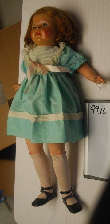 This is a female American Character Chuckles doll from the 1950s. She has red hair, an oilcloth body, and vinyl head and limbs. She has sleep eyes. The doll has an open mouth showing her teeth. She is wearing a green dress with white and pink details, white socks, and black shoes. She measures 28" (h) x 18"(w) x 7" (d).Collection