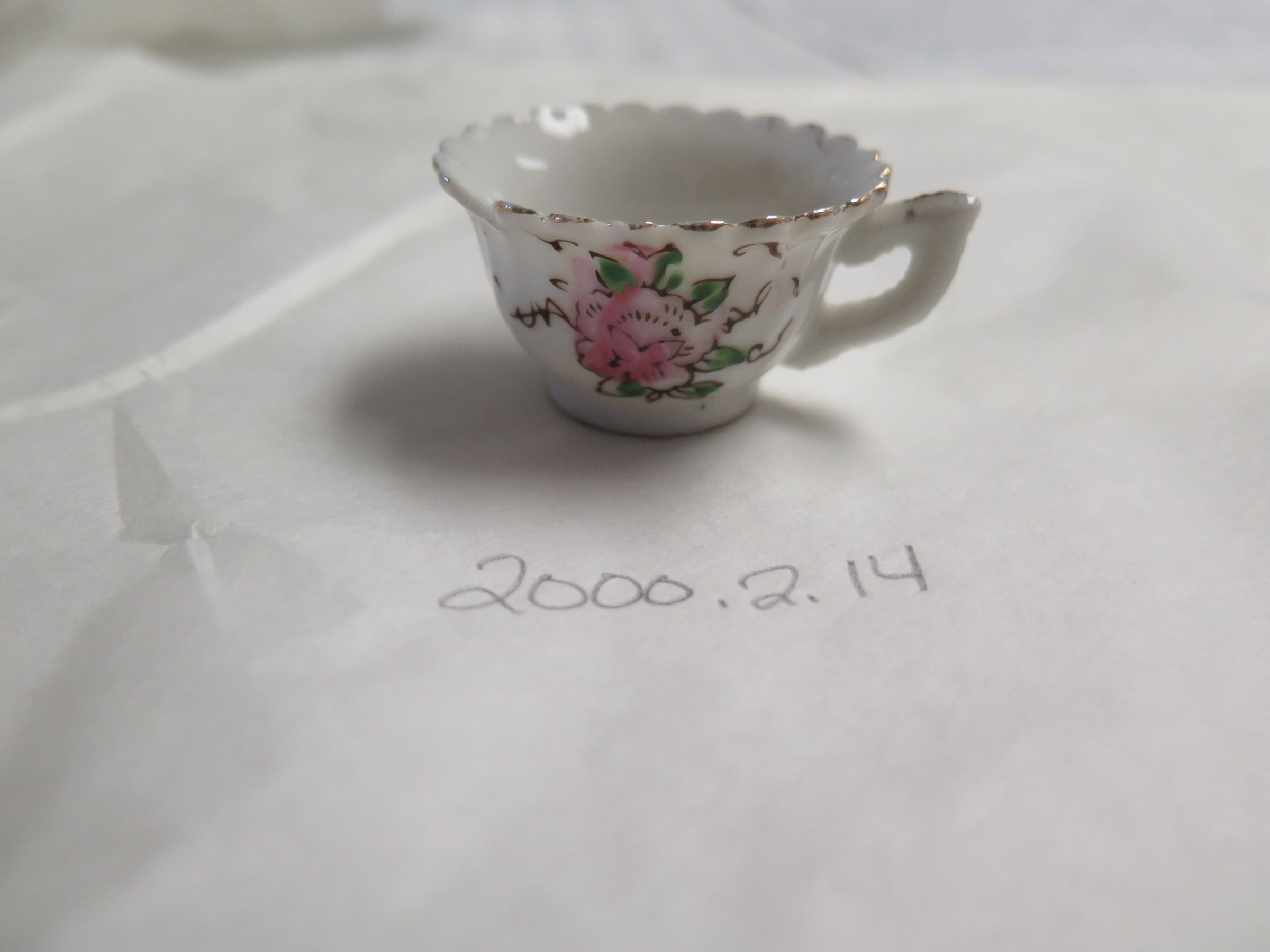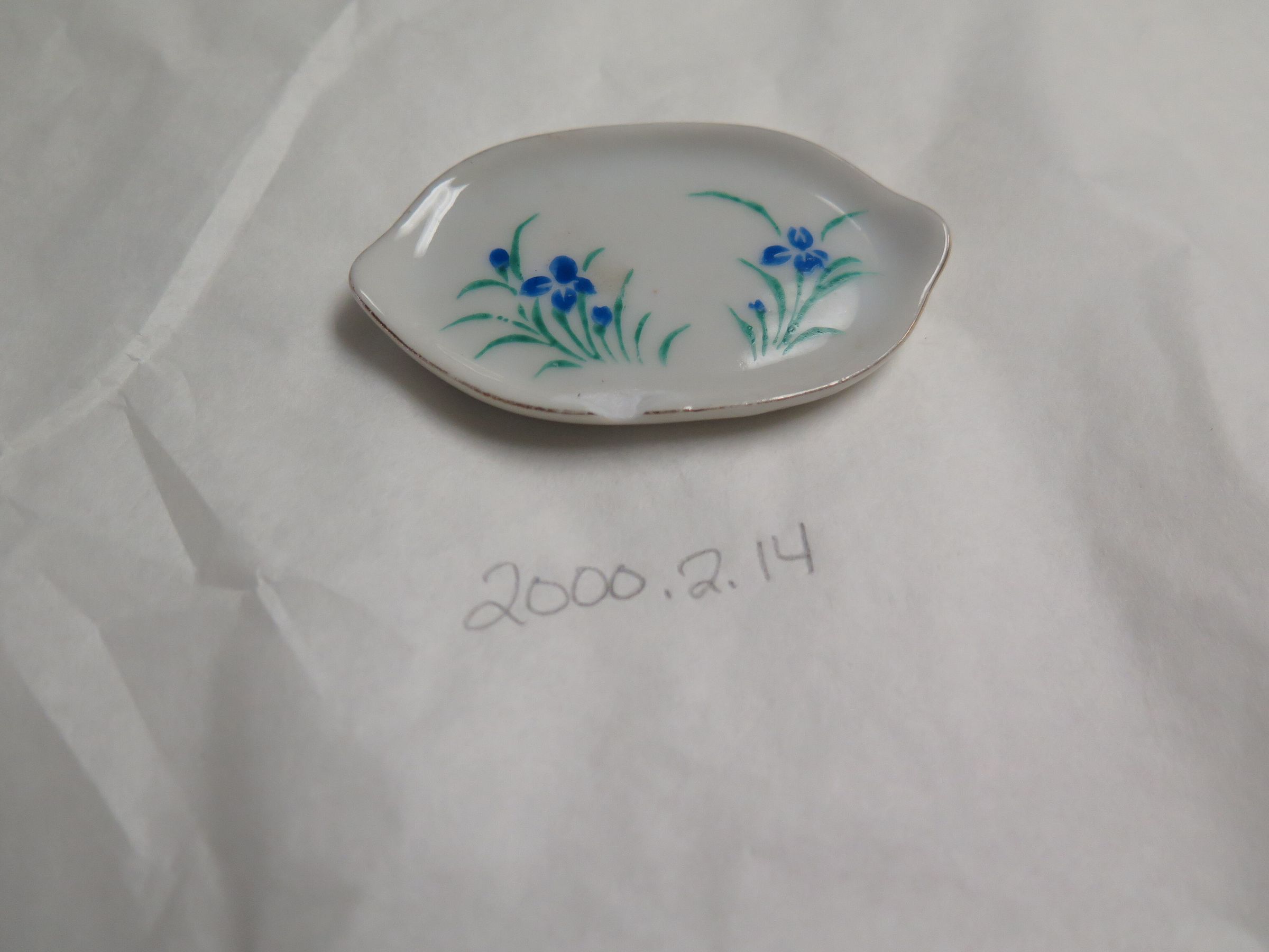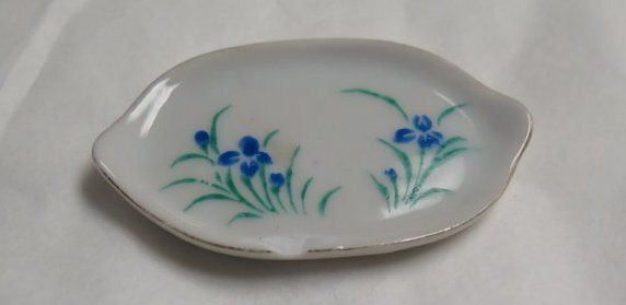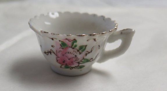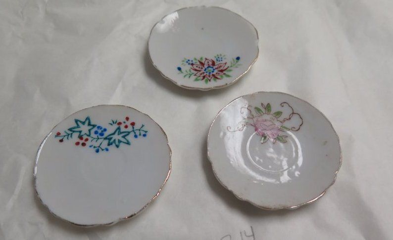 This is a set of five children's play dishes. There is one white china teacup with gold scalloped edges around the top and a floral pattern on the side. This measures 1" (h) x 2.5" (d). There is a set of 3 white china saucers with gold scalloped edges and various floral patterns. These measure 2.5" (d). Each saucer has the word "JAPAN" stamped on the bottom in red ink. There is one white china oval plate with blue and green flowers and gold edges. This plate is chipped and measures 2" (l) x 3" (w). This oval plate has the text "MADE IN/ OCCUPIED/ JAPAN stamped on the bottom in red ink.