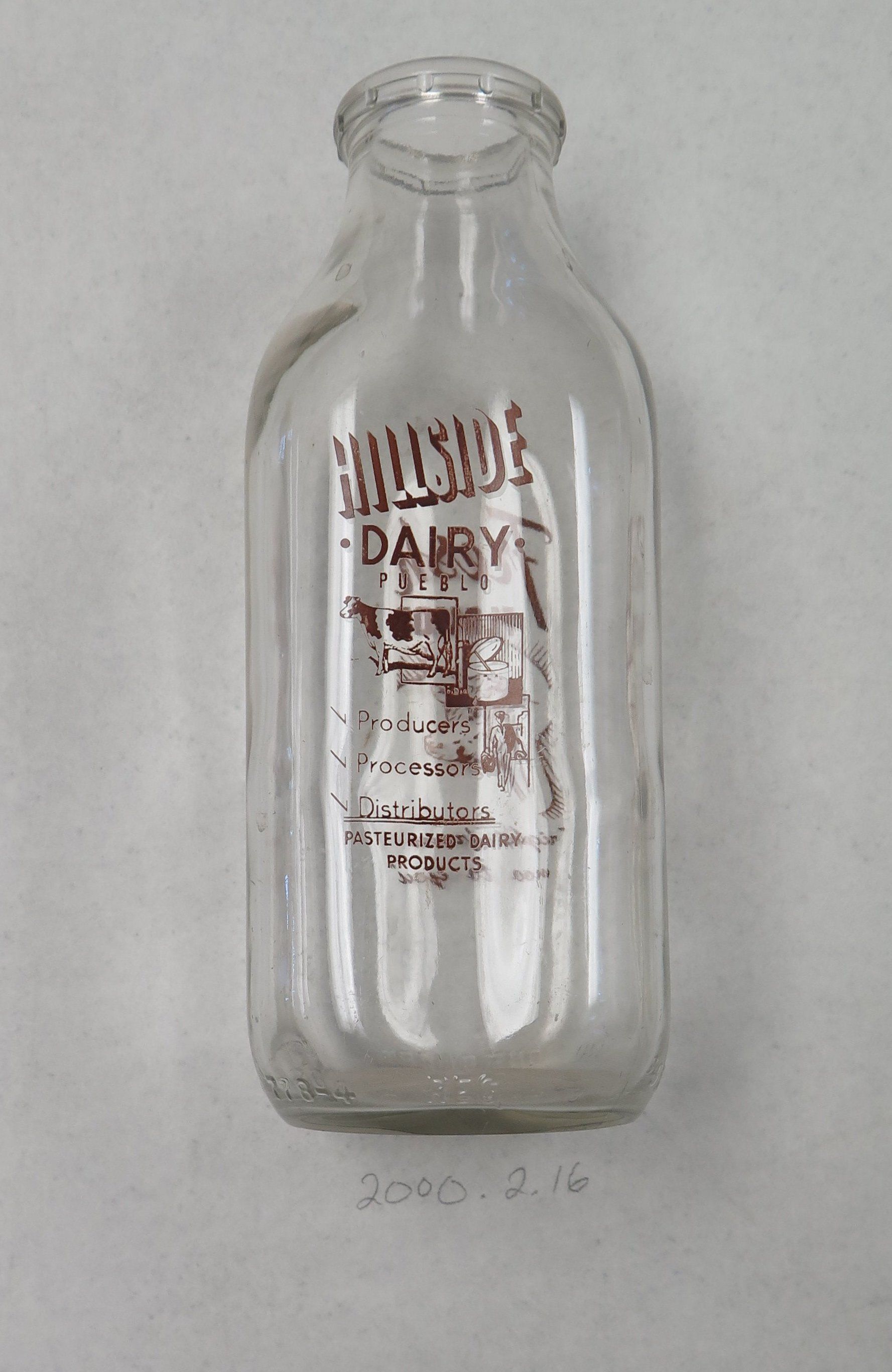 This is a clear glass milk bottle with a square base and a round opening at the top. The bottle has red text on the side that reads, "Hillside/ Diary/ Pueblo/ Producers/ Processors/ Distributors/ Pasteurized Dairy/ Products". Also on the side of the bottle is the image of a cow, the processing process, and a milk delivery man. The milk bottle measures 8.5" (h) x 3" (w) x 3" (l).