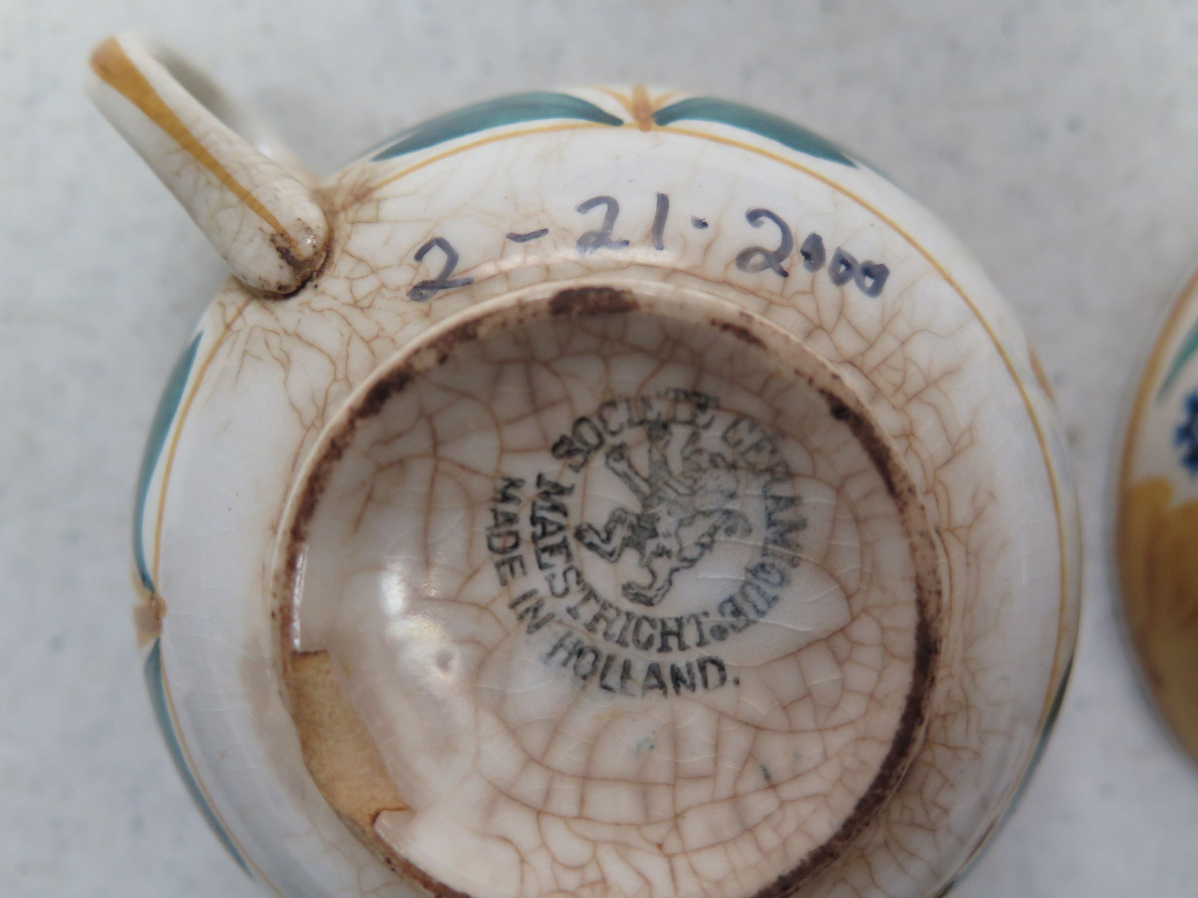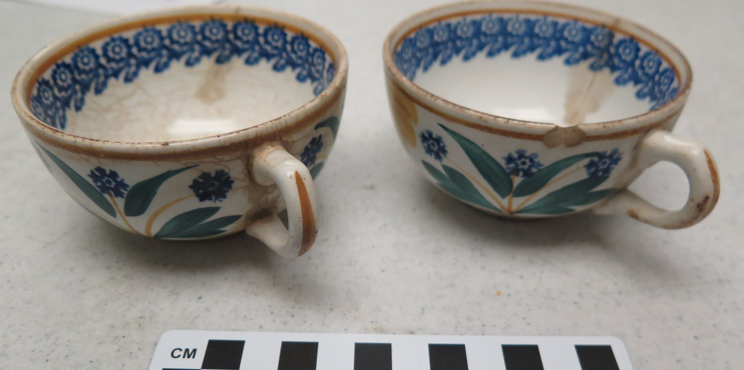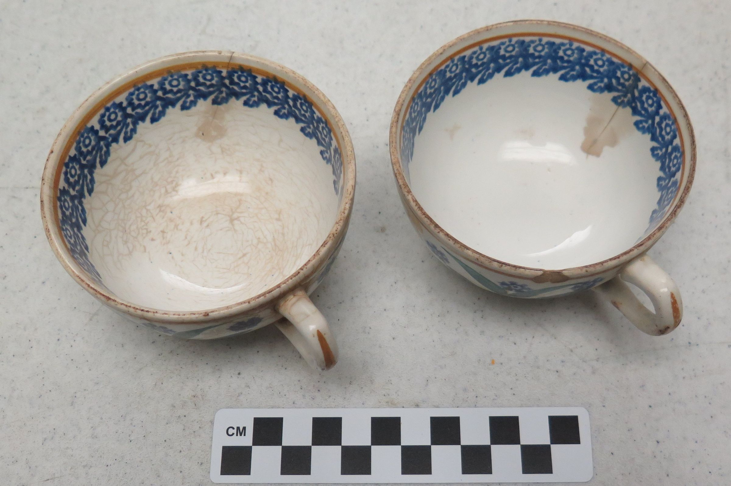 Thiese are a pair of painted ceramic teacups. 2"(H) x 3.75"(W)