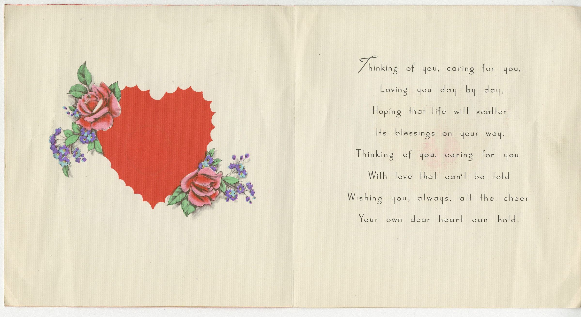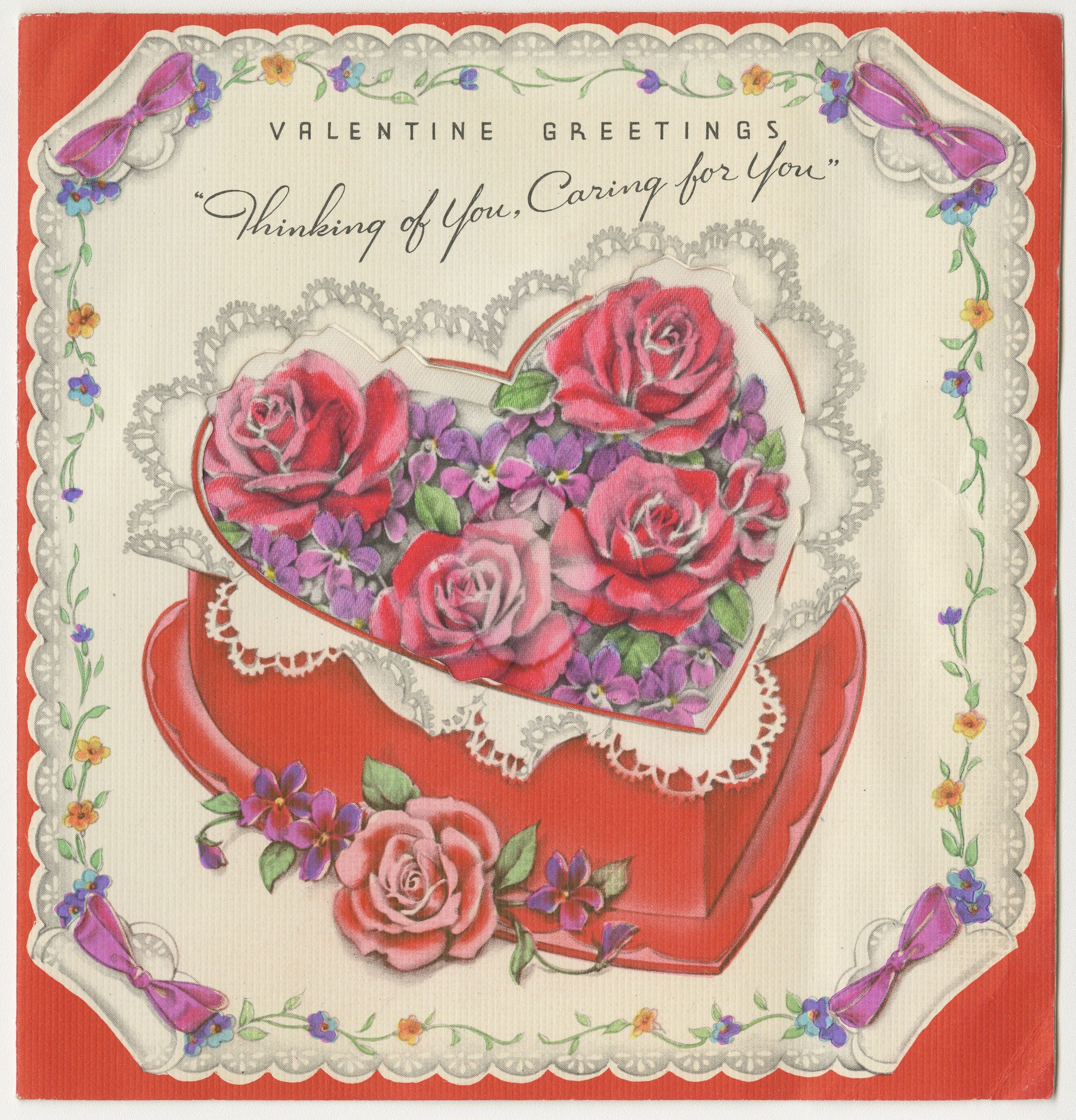 Valentine's Day card, 1945. Unused. Features an image of a heart-shaped box containing roses and violets with a lacy dolly. Flowers are printed on cloth and raised with stuffing. Front of card reads "'Valentine Greetings / "Thinking of You, Caring for You'".