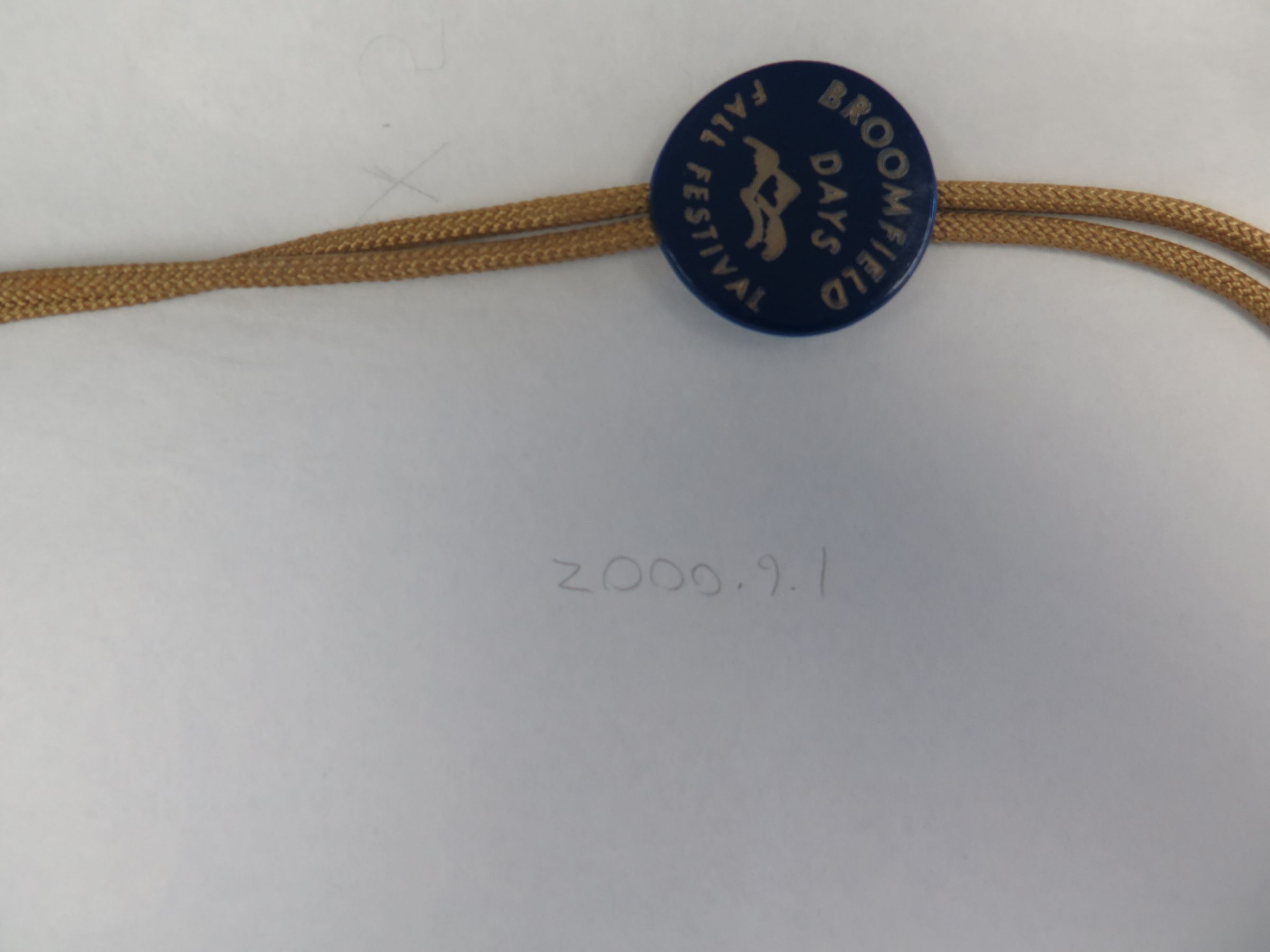 This is a tan bolo tie with metal tips and a blue Broomfield Days round closure in the middle. The tie was from Broomfield Days in 1964. The bolo tie measures 1.75" (w) x 16" (l).