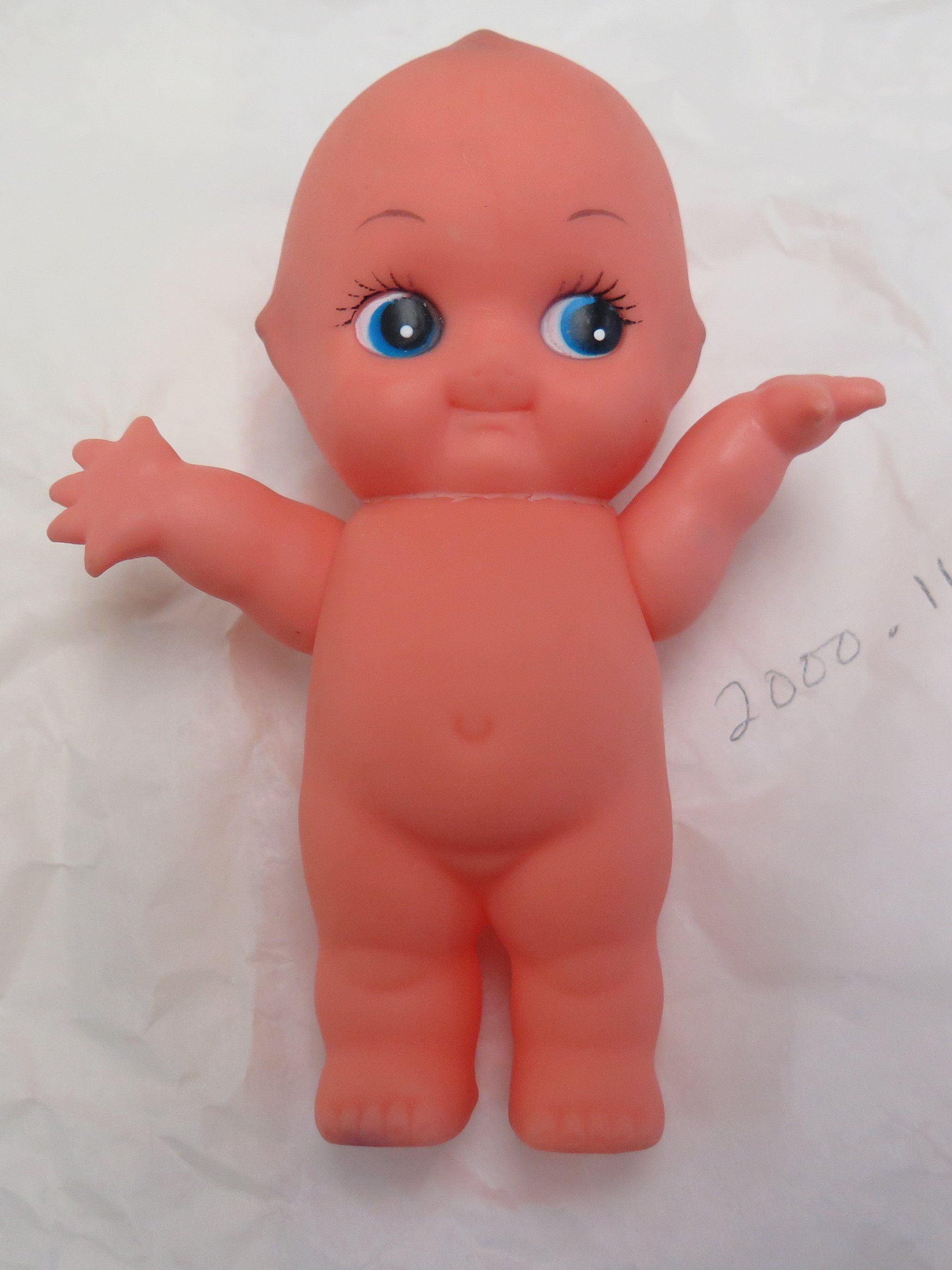 This is a kewpie doll with blue eyes and painted on hair. The doll is standing with its arms up. The doll does not have clothes. The doll measures 5" (h) x 4" (w) x 2" (d).Collection
