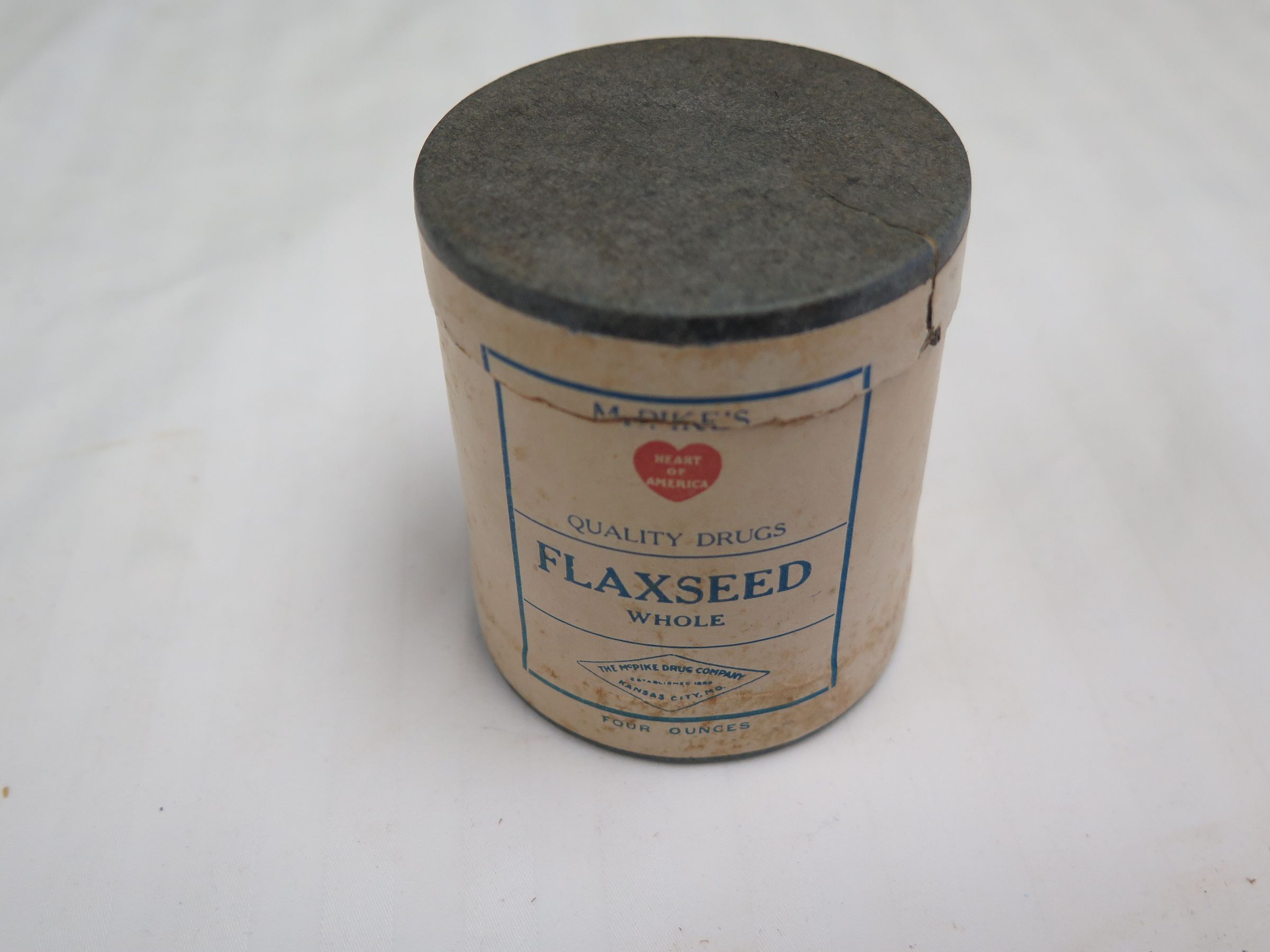 This is a round package of Pike's brand flax seeds. The package is made of paper, and measures 3" (h) x 2.5" (dia).Collection