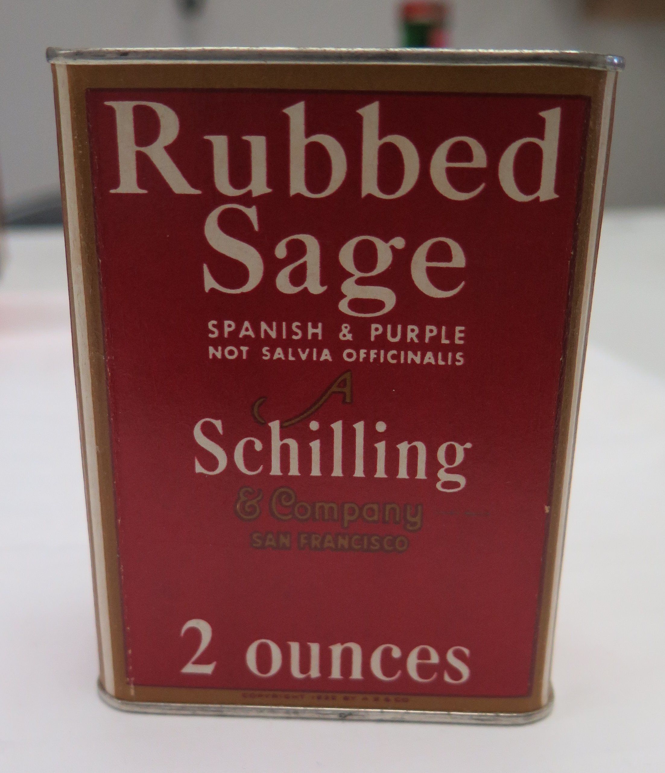 This is a metal spice tin or box that contained 2 ounces of Schilling brand rubbed sage. The tin is red with gold text and a gold border. The tin measures 3.75" (h) x 2.5" (w) x 1.5" (d).