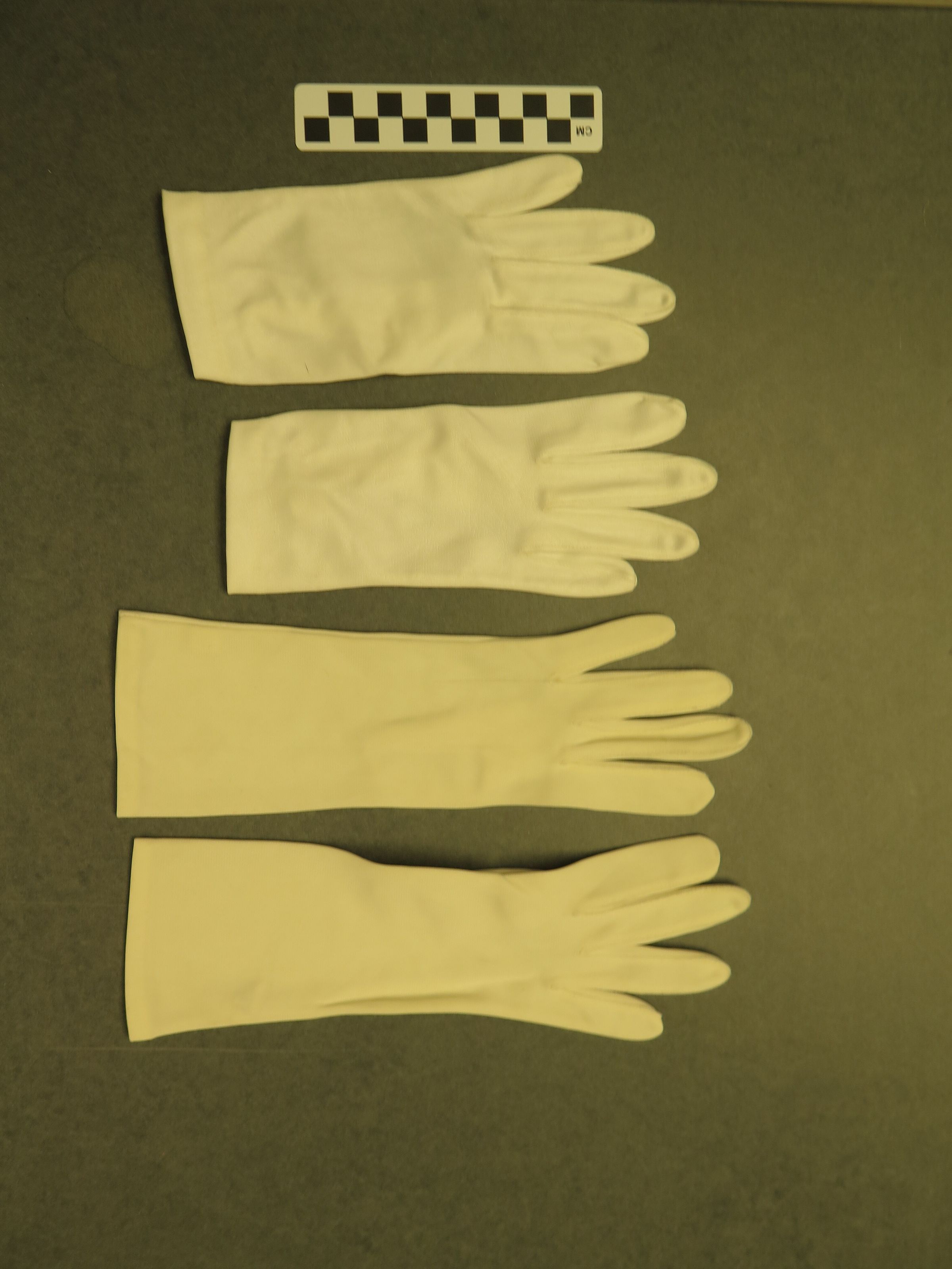 This is 2 pairs of white gloves. One pair of gloves is longer, and was made in British Hong Kong. These gloves are 100% nylon. The longer pair of gloves measures 3" (w) x 10.75" (l). One pair of gloves is wrist length, size medium, and 100% nylon. These gloves have elastic on the inside of the wrist. This shorter pair of gloves measures 3" (w) x 8" (l).Collection