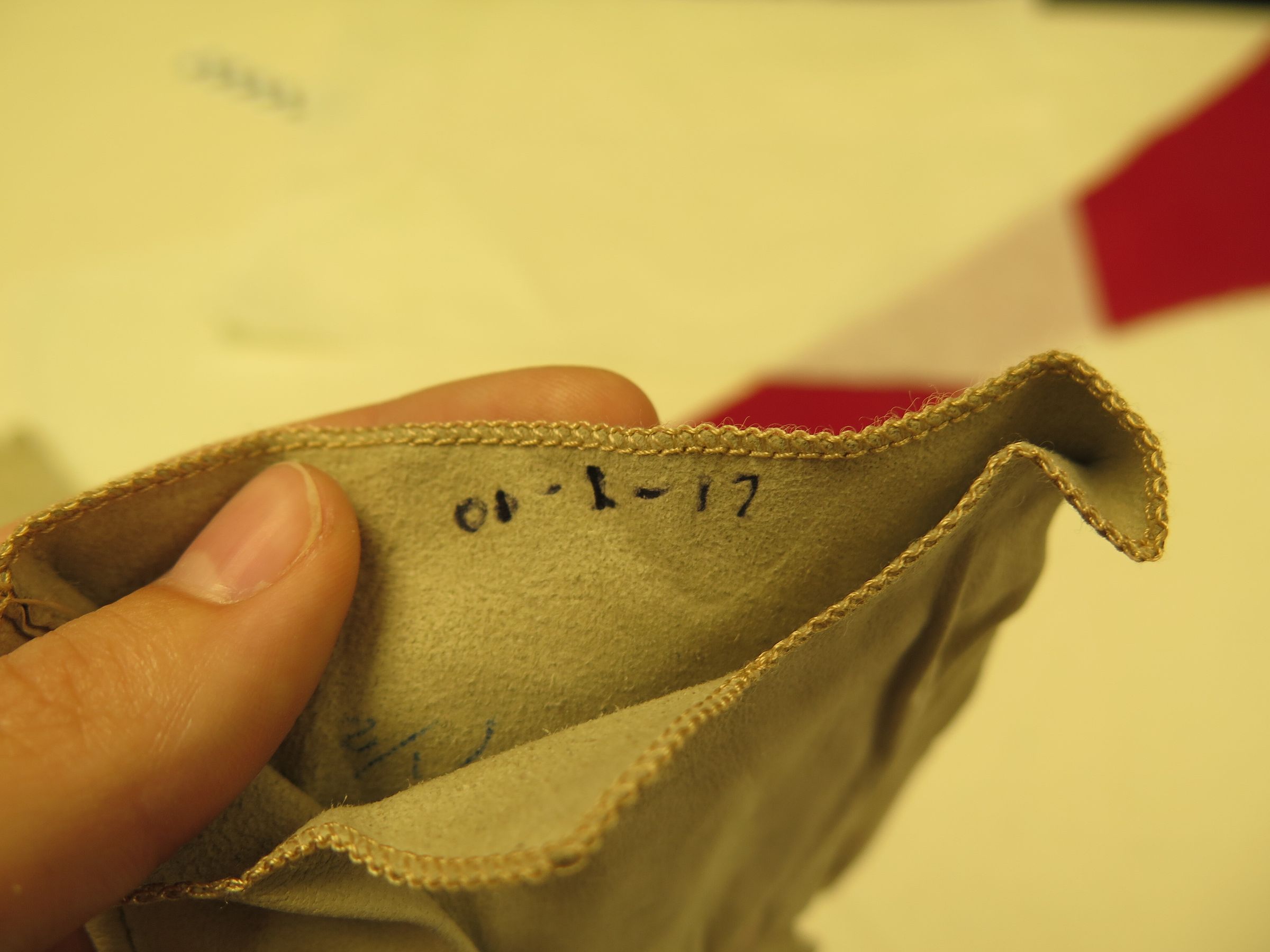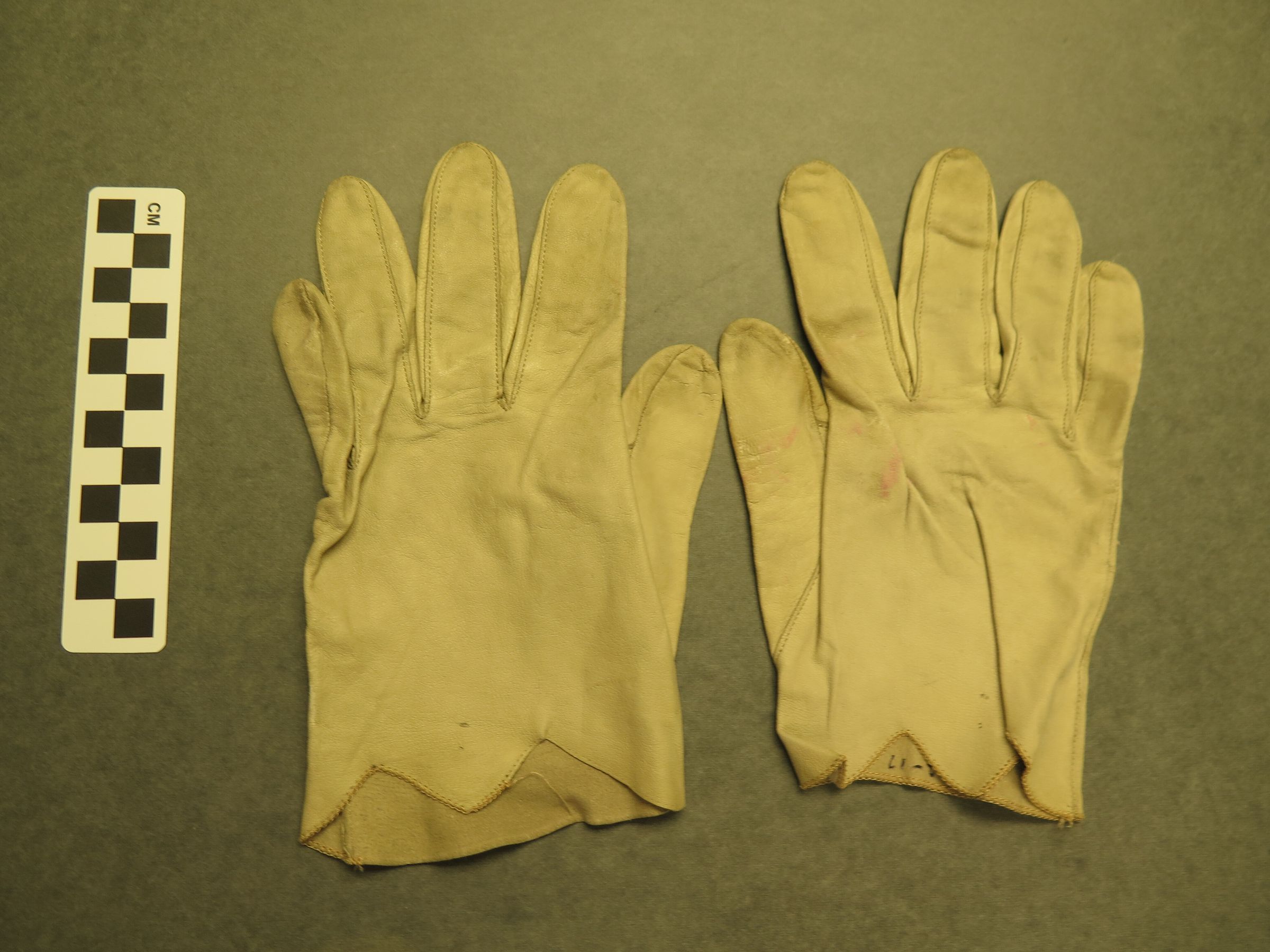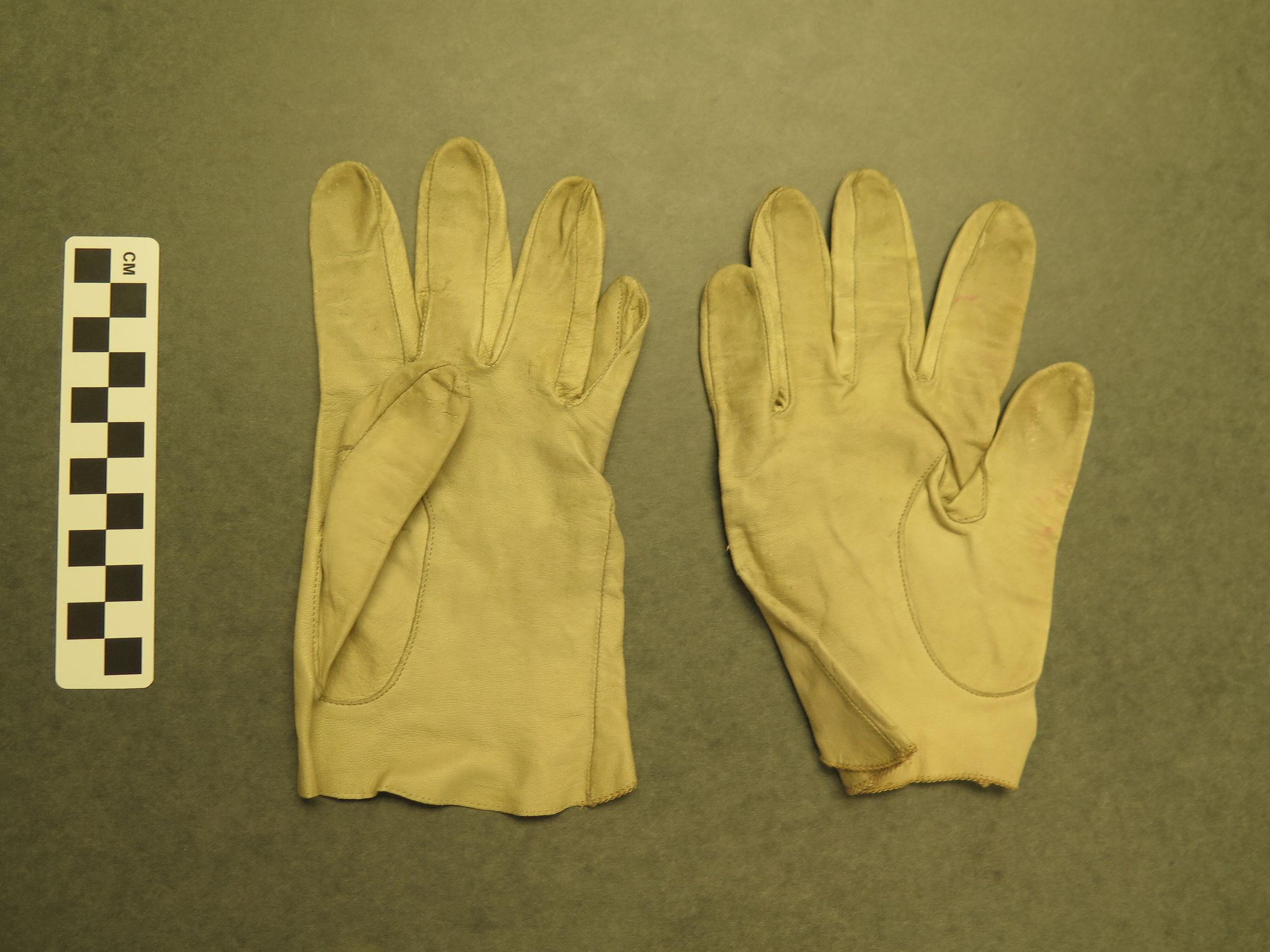 This is a pair of wrist length leather gloves. The gloves are worn and dirty on the fingertips. There are pink stains on the gloves. On the inside is text that reads, "Meyers Make 7.5". Each glove measures 4" (w) x 7.25" (l).Collection