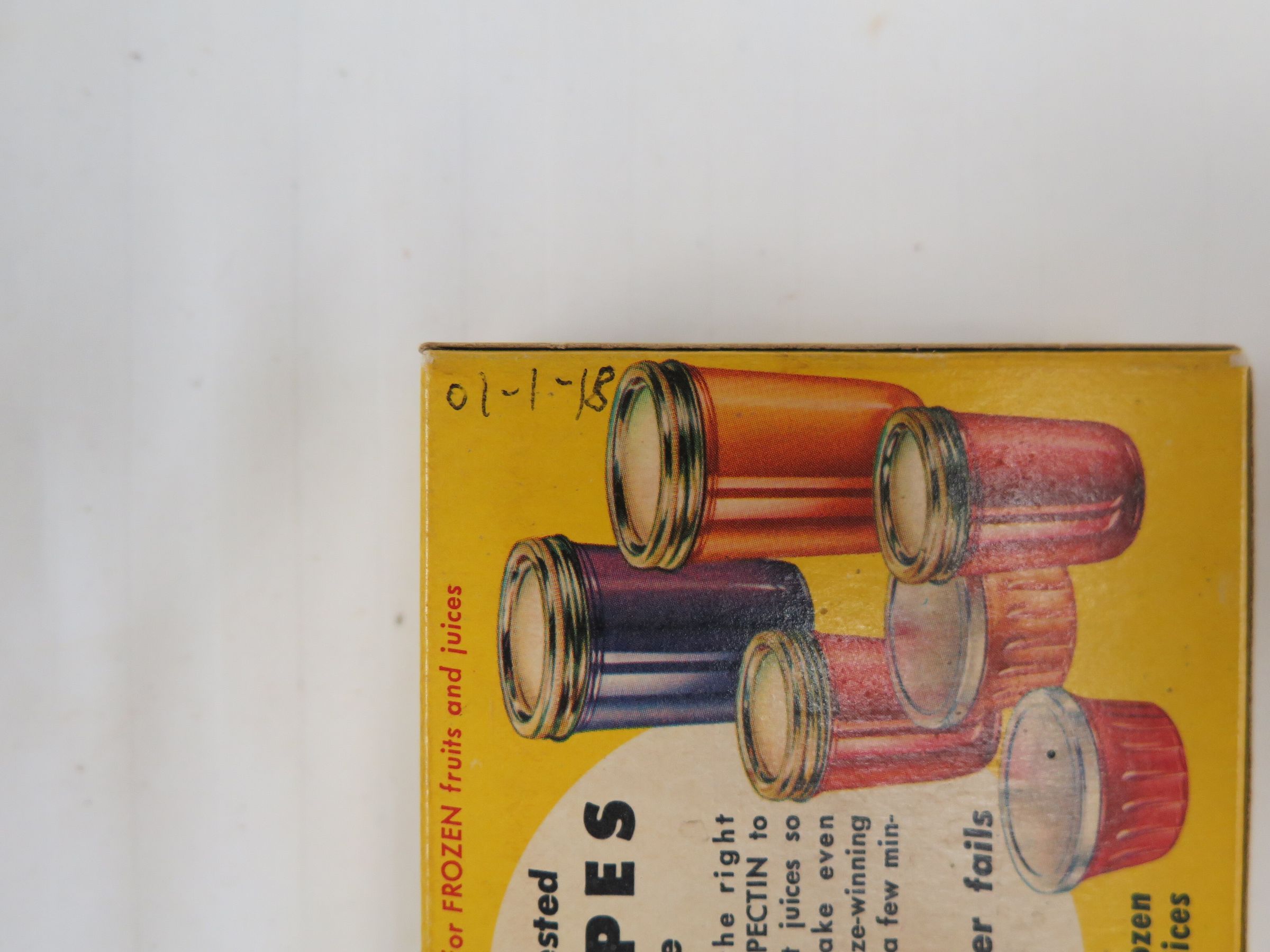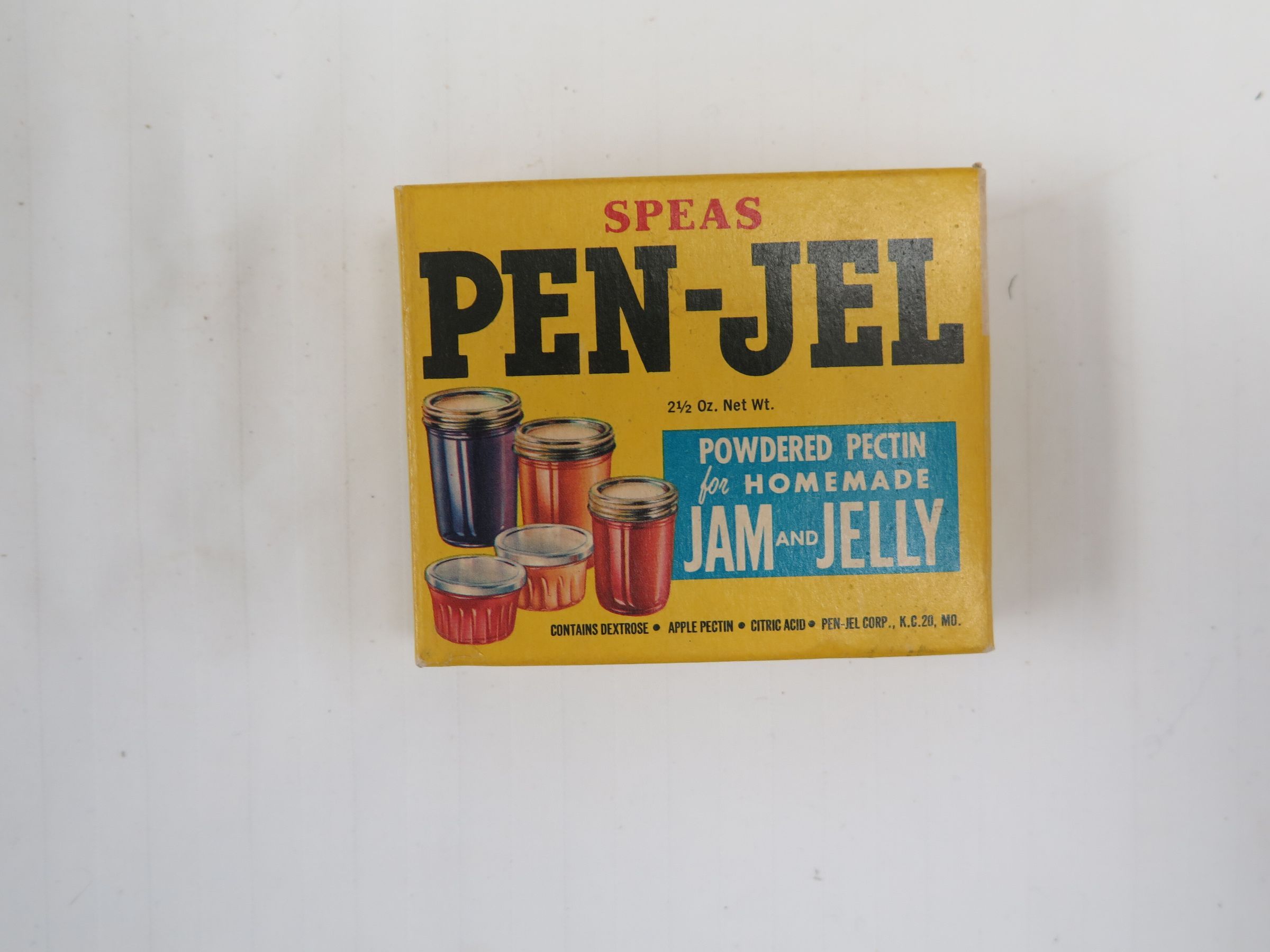This is a cardboard package of Speas brand Pen-Jel pectin. The package is yellow with text on the front that reads, "Speas/ Pen-Jel/ 2 1/2 oz. net wt./ Powdered Pectin/ for Homemade/ Jam and Jelly". The package measures 1" (h) x 3" (w) x 3.5" (l).Collection