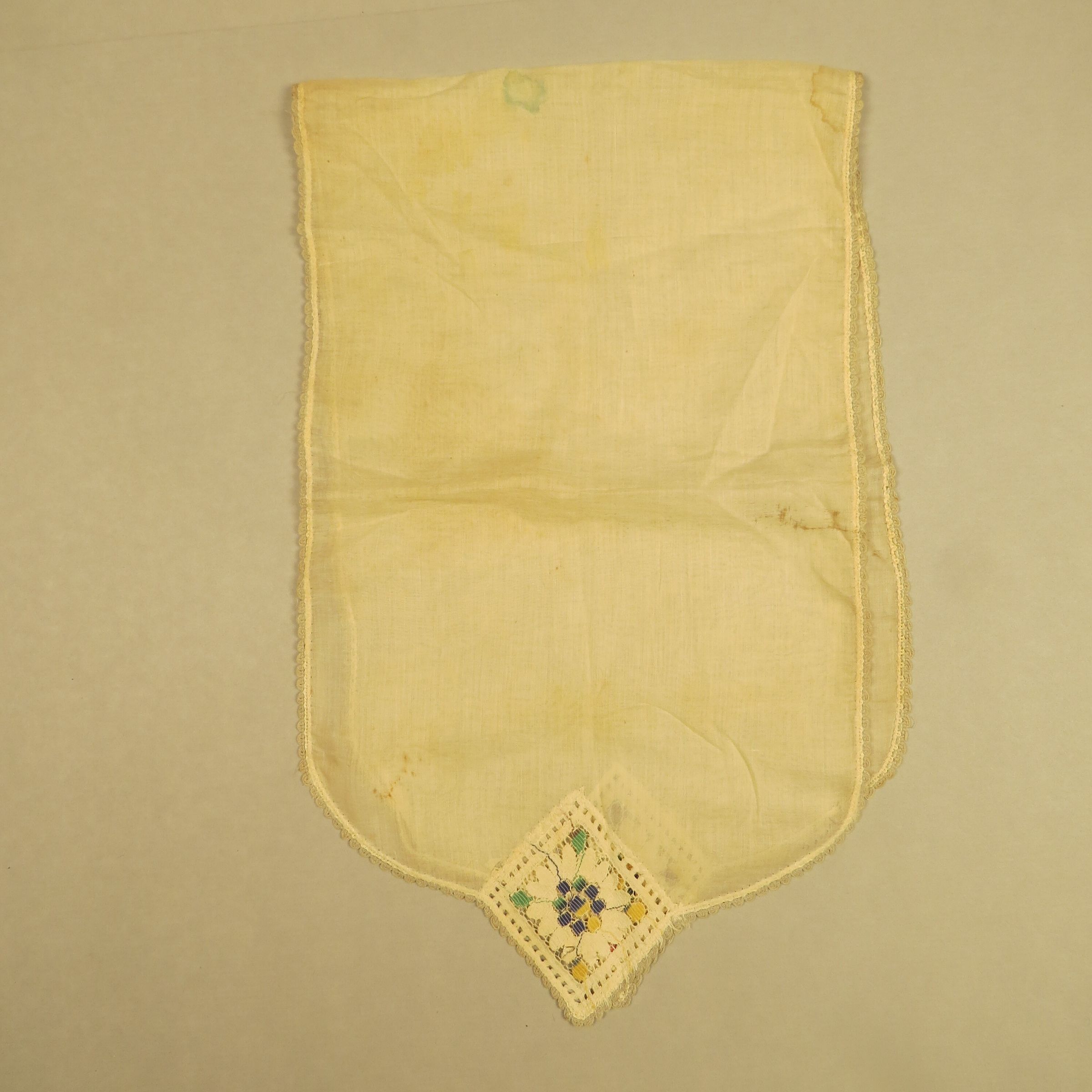 This is a white table runner with rounded edges and a diamond shaped design at either end. The table runner measures 12" (w) x 40" (l).